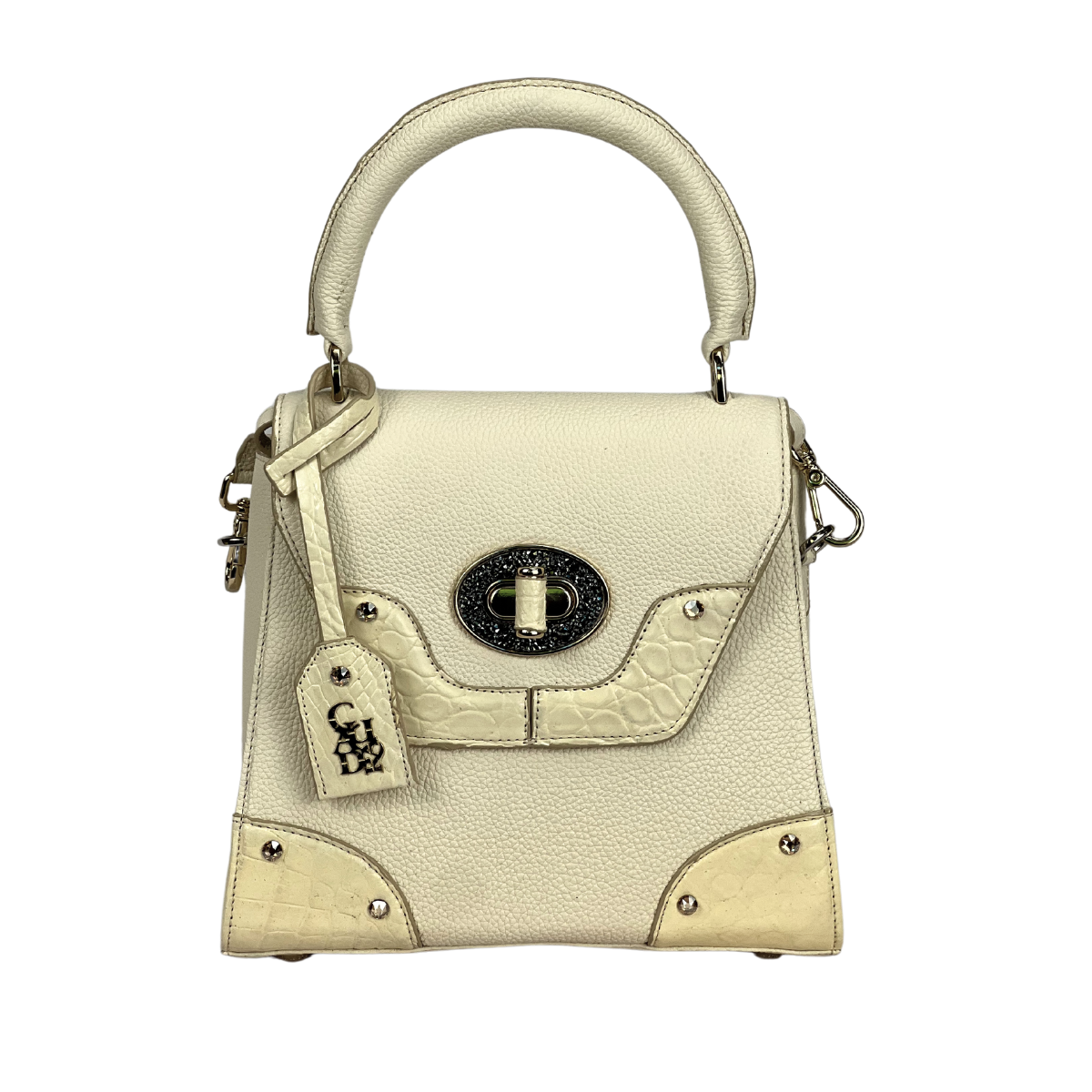 Bolso para dama en piel genuina de alligator y exclusiva piel española de bovino. Diseño de Edición Especial con aplicaciones en piel de alligator y finos cristales auténticos. Con asa larga ajustable y desmontable y asa corta, de la cual cuelga una aplicación tipo llavero con piel de alligator, cristales auténticos y aplicación metálica de logotipo Cuadra. Asegurada con imanes y broche giratorio al frente forrado con piel de alligator y con pequeños cristales auténticos. En la parte trasera cuenta con un bolsillo asegurado con imán. En su interior cuenta con un bolsillo y cuatro tarjeteros