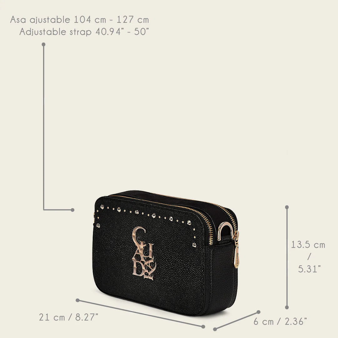 Bolso crossbody para dama en piel genuina de mantarraya y piel de bovino. Al frente presenta una aplicación metálica de logotipo Cuadra y estoperoles metálicos. Con asa larga ajustable y desmontable con técnica de tejido textil. En la parte trasera cuenta con un bolsillo que cierra que con imán. Cuenta con dos compartimentos asegurados con cierre, uno de los compartimentos tiene dos divisiones internas. Las marcas y cicatrices que puede presentar lejos de ser considerados como defecto demuestran la autenticidad de cada producto.