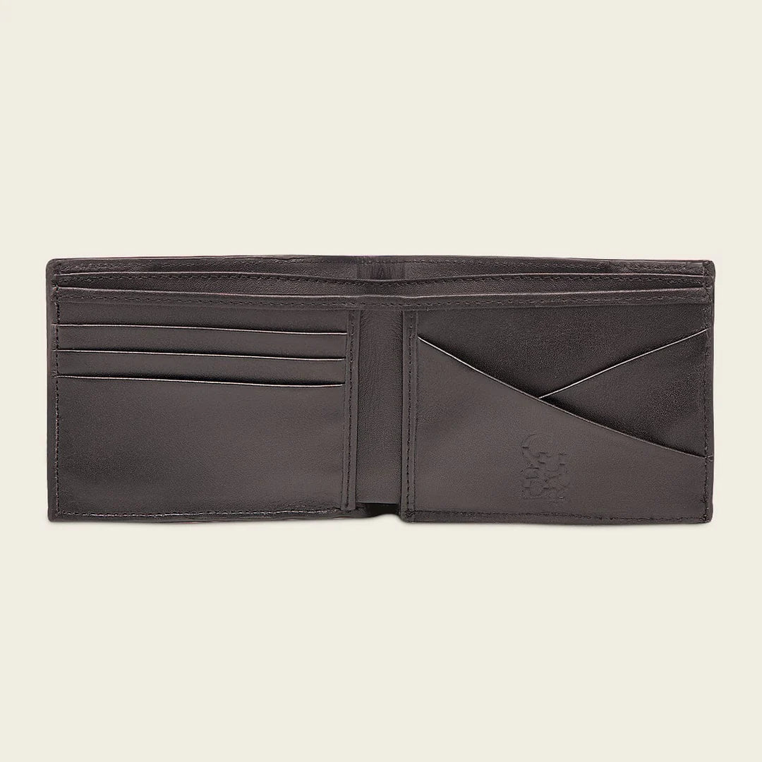 Cartera para caballero en piel genuina de elefante y piel de bovino. Al frente presenta grabado del monograma Cuadra en alto relieve y aplicación metálica del logotipo. En su interior cuenta con cinco espacios para tarjetas y dos espacios para efectivo. Cuenta con un tarjetero extraíble en piel de bovino con cinco espacios para tarjetas.