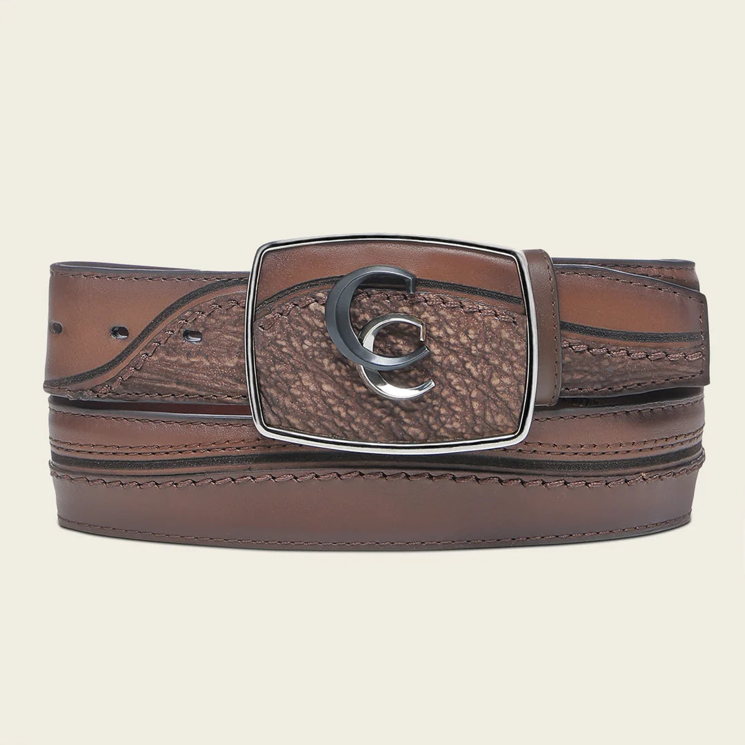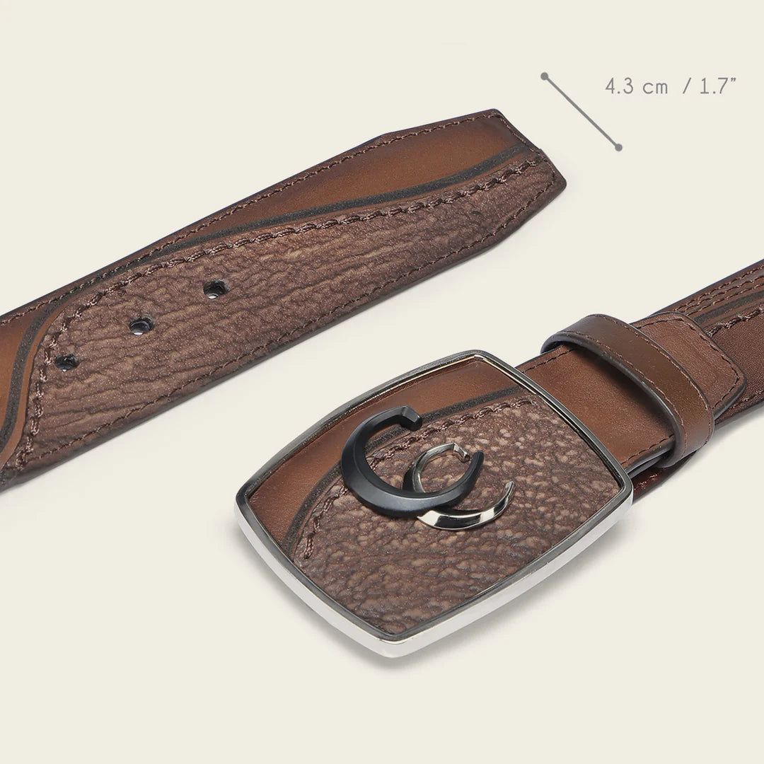 Cinturón vaquero para caballero en piel genuina de tiburón sobre la hebilla y en la punta de la tira y piel de bovino. Presenta texturas y colores contrastantes, grabado láser y fino bordado a lo largo de la tira. Con hebilla de 45 mm forrada en piel de tiburón y con apliación metálica doble de monograma Cuadra. Con forro en piel de bovino.