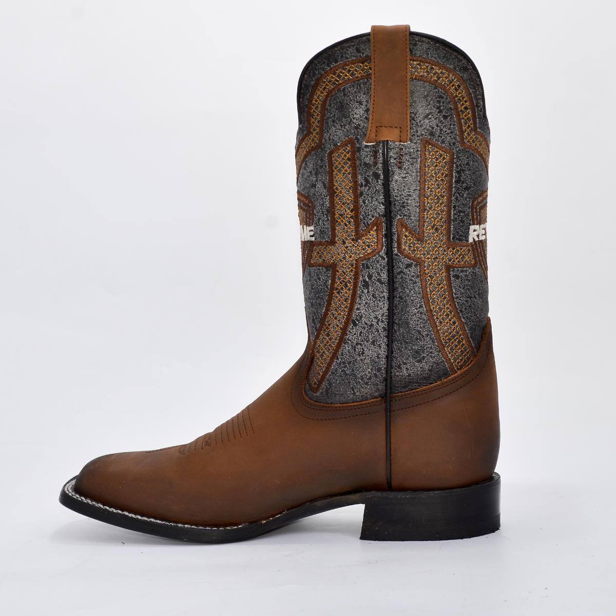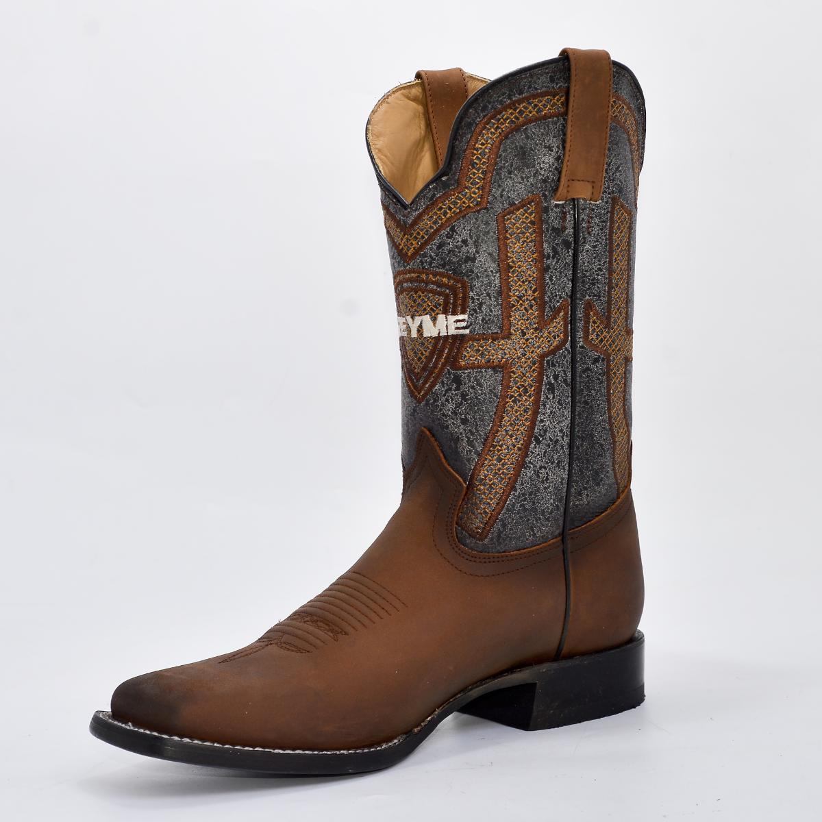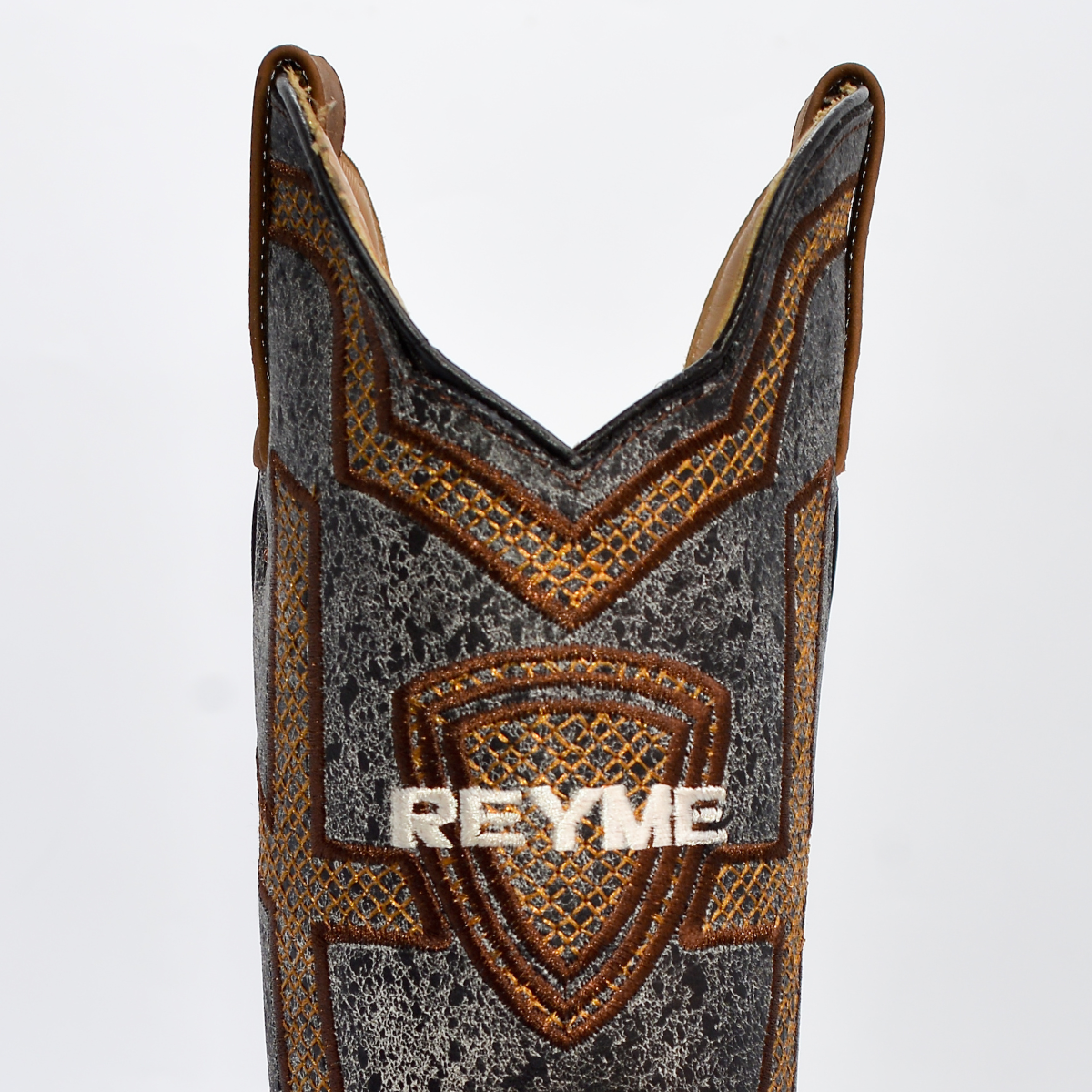 • Caña (Tubo): Confeccionada en piel bovina con un diseño de textura Gris/Plata envejecida de alto impacto visual, complementada con un espectacular bordado artesanal geométrico en tonos Cobrizos y Naranja que rodea el logo de REYME.