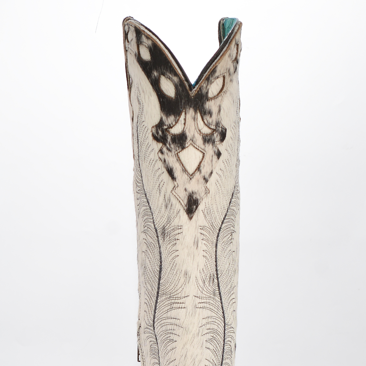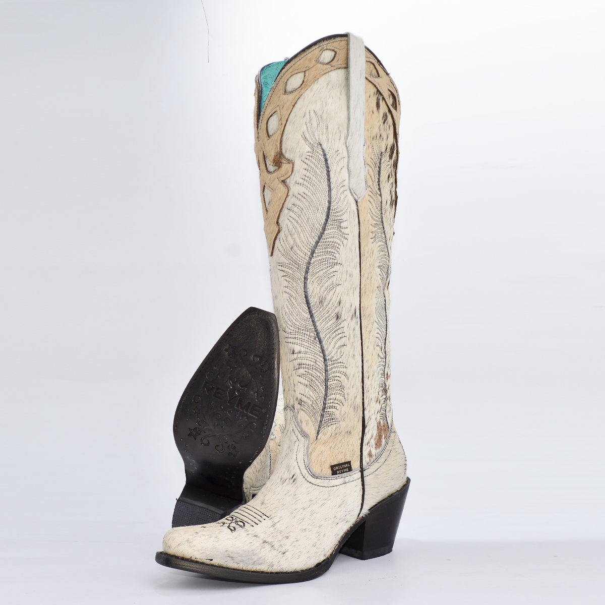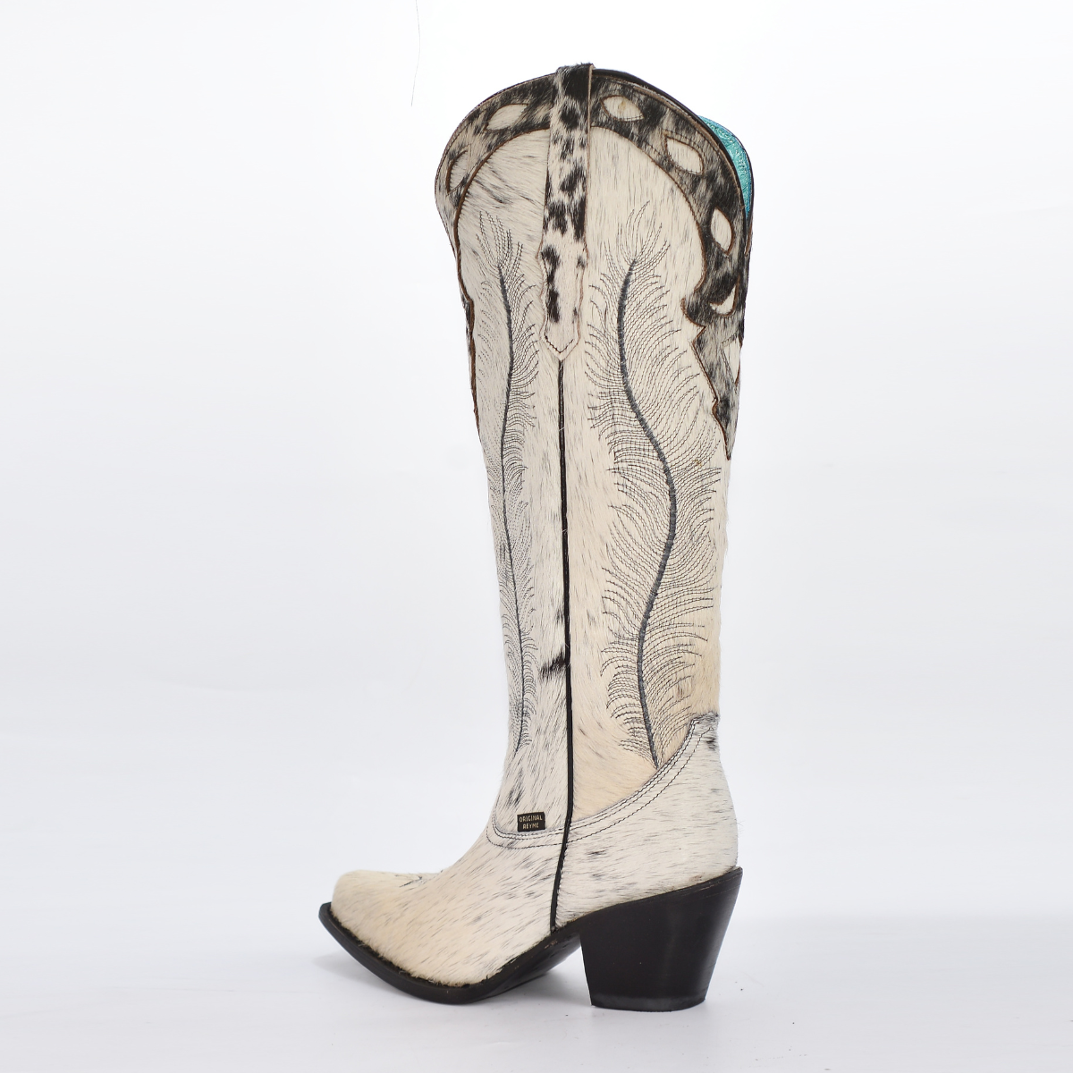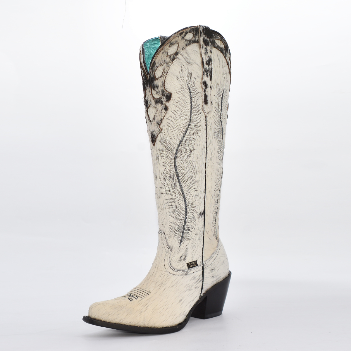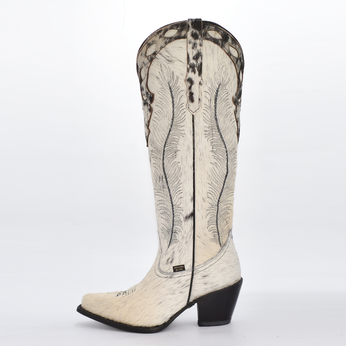 Una bota vaquera de lujo y estilo arriesgado para mujer, ideal para destacar. Elaborada con piel genuina con pelo en tonos blanco y negro/café, lo que le da una textura inigualable. Su diseño de caña extra alta se complementa con un patrón de bordado fino en la caña y un distintivo grabado en la punta. Si buscas un estilo elegante, auténtico y llamativo, sin perder comodidad, esta bota es para ti.