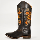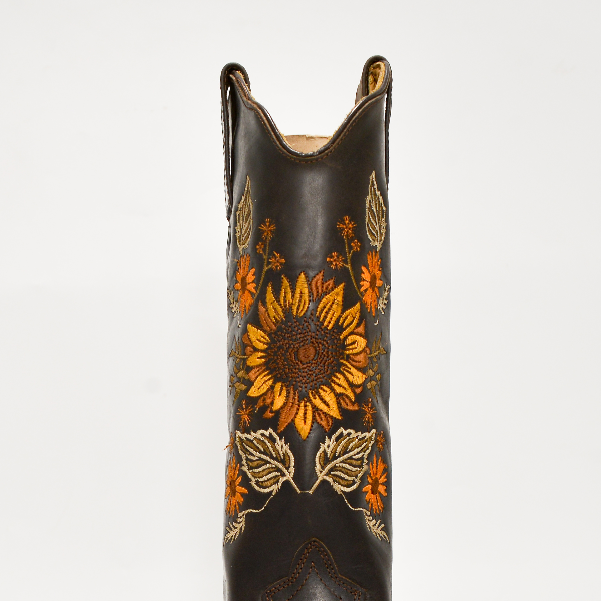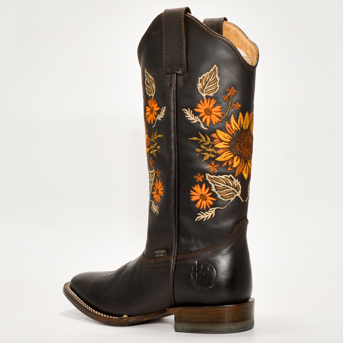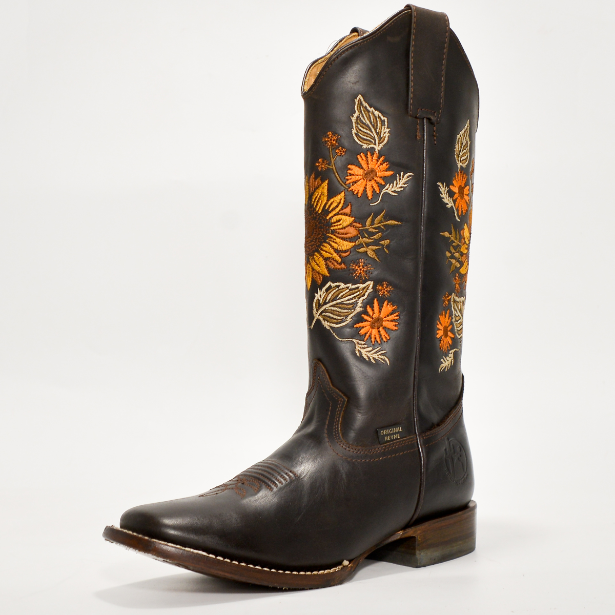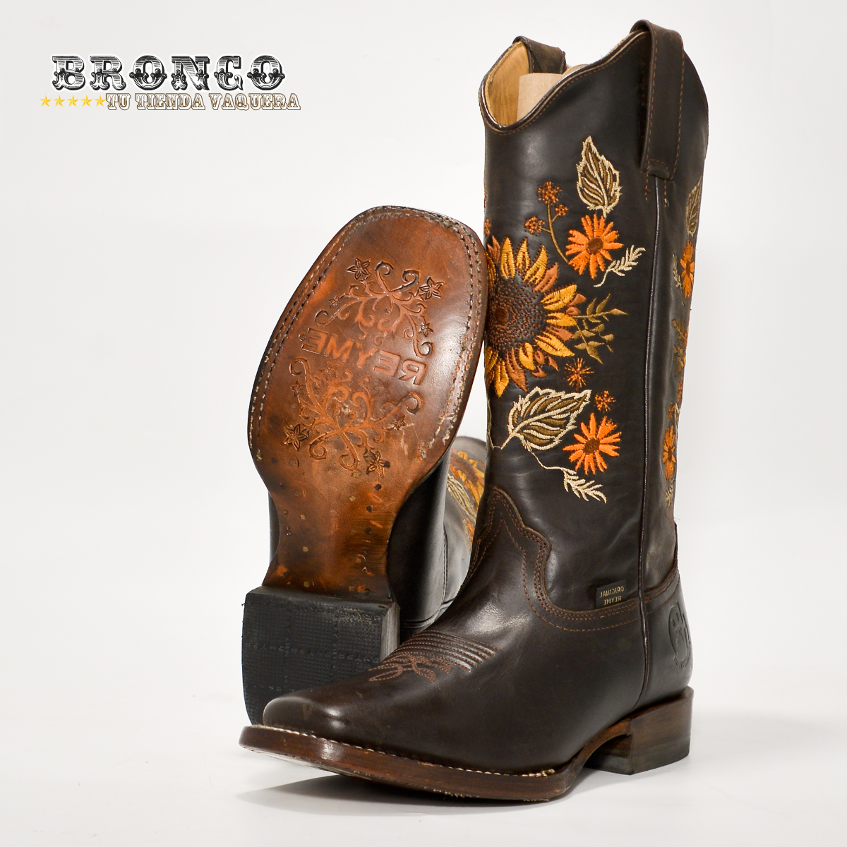 Bota Vaquera Reyme Original para Mujer – Piel Color Café con Bordado de Girasoles