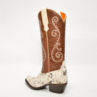 Un diseño que combina la elegancia de la piel natural con el carácter genuino del estilo western. Esta bota vaquera de mujer destaca por su base en pelo natural moteado, que aporta un acabado único —ningún par es igual a otro—, complementado con un tubo de piel café adornado con bordado floral y aplicaciones metálicas cuidadosamente distribuidas.
