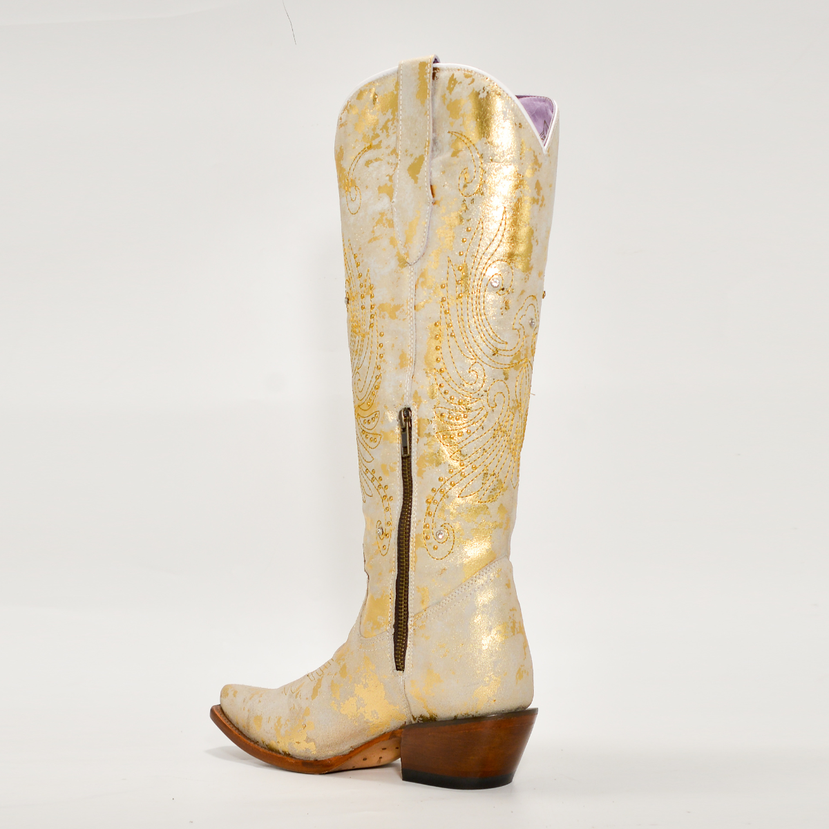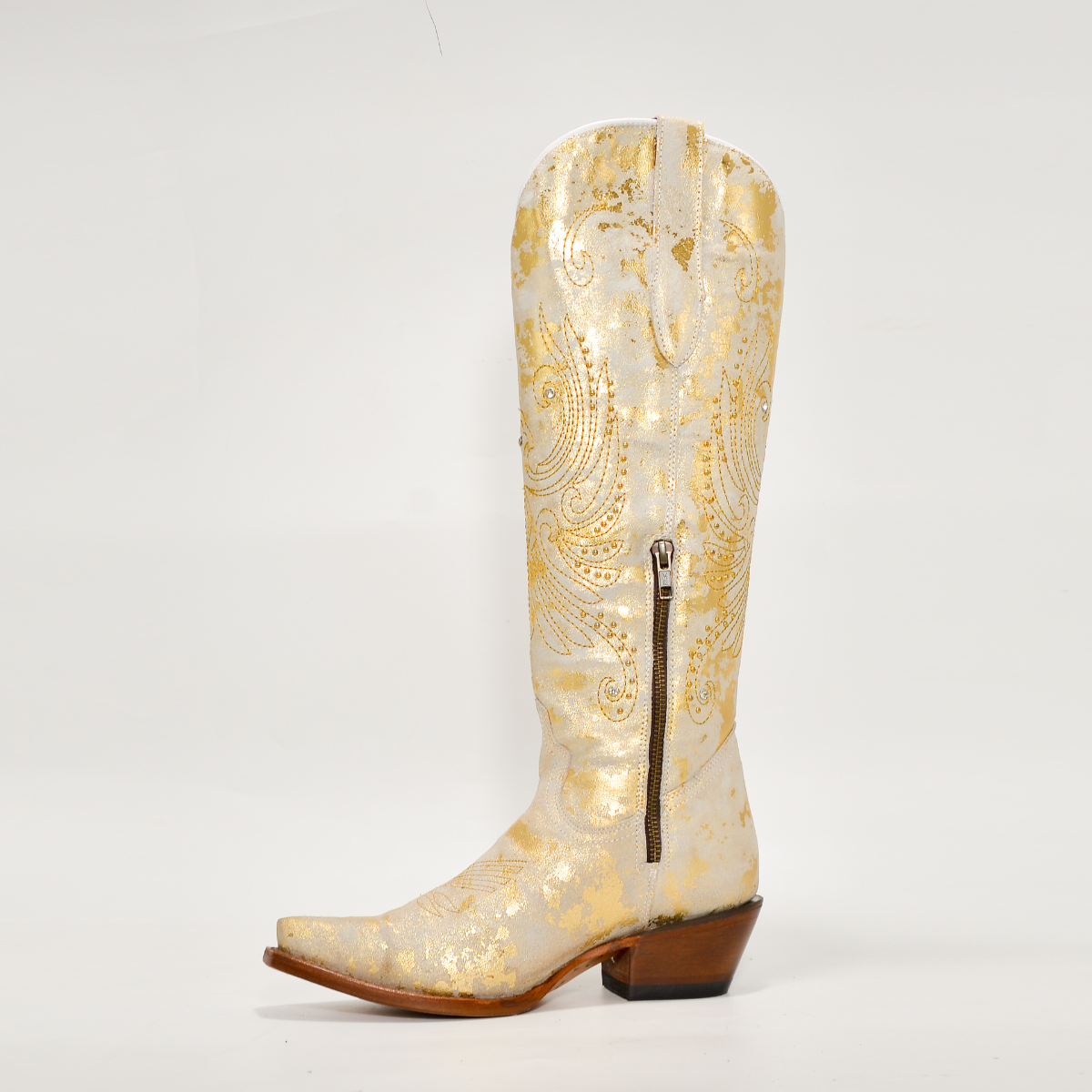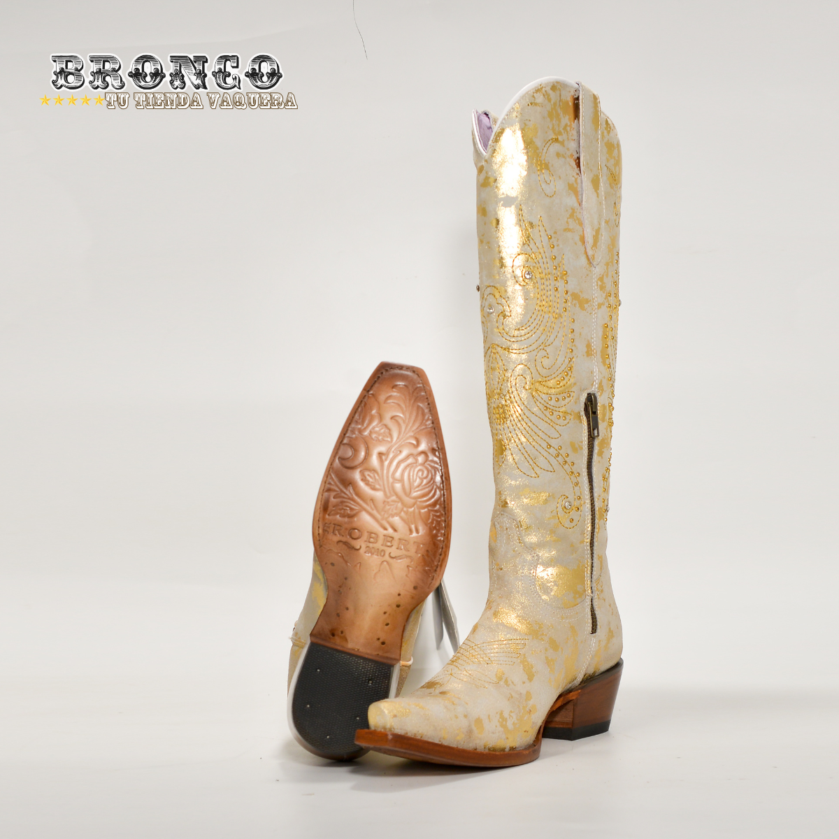 Las botas Robert Jr Original en piel dorada con acabado metálico son una verdadera joya del estilo western femenino. Su diseño artesanal combina un bordado delicado en hilo dorado, apliques brillantes y un acabado nacarado que refleja la luz con sutileza, creando un look sofisticado y lleno de personalidad.