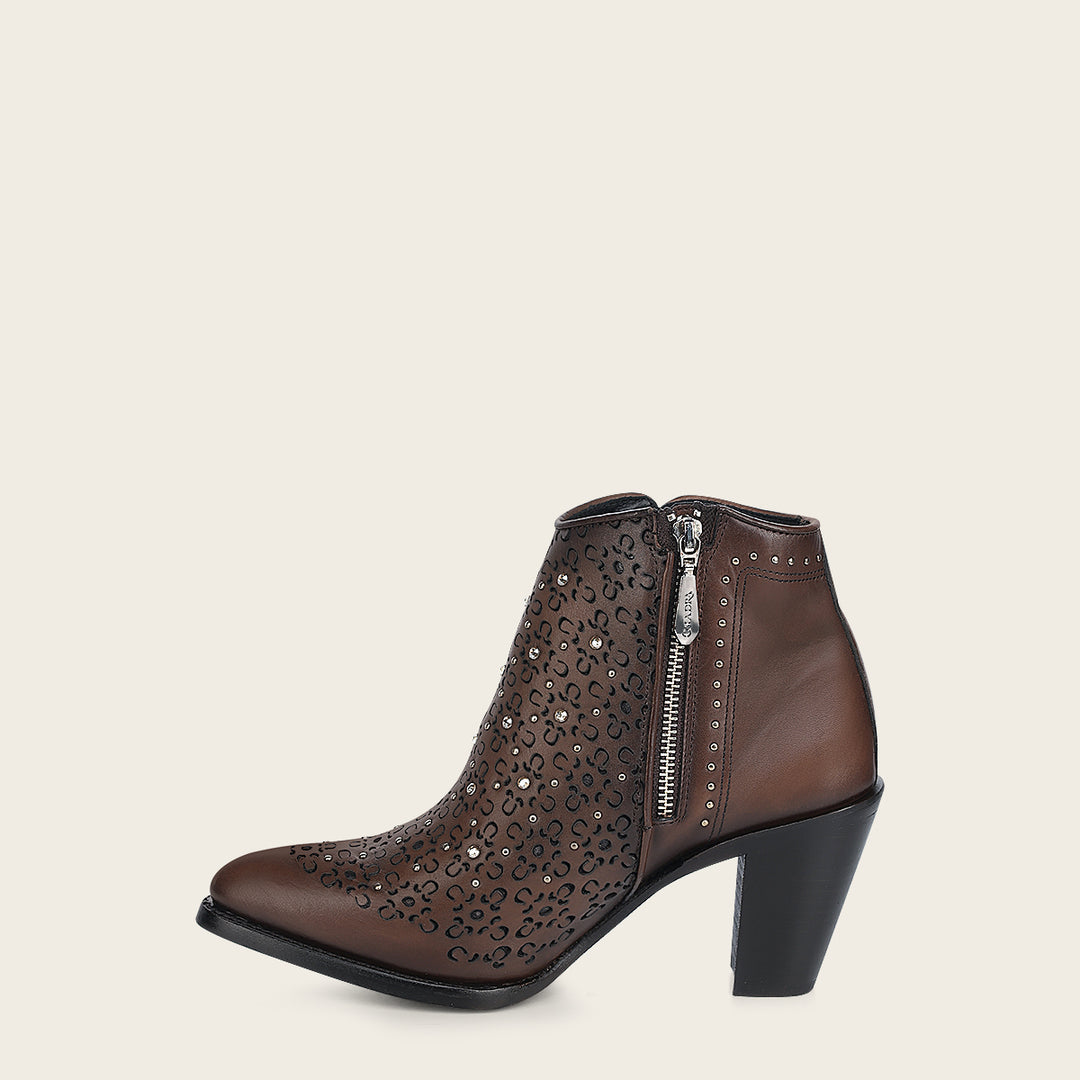 Botín para dama en piel genuina de bovino. La parte frontal cuenta con perforaciones en forma de medialuna con aplicaciones de cristales auténticos. La parte posterior presenta en el borde, pequeñas aplicaciones metálicas. Ajuste por medio de cierre interno. Suela de cuero con TPU.