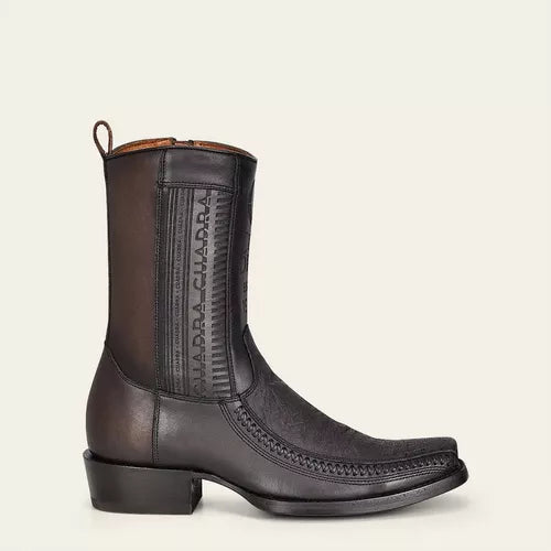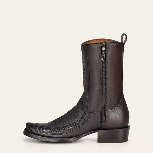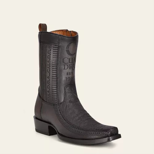 Bota tradicional para caballero en piel genuina de elefante y piel de bovino. Presenta grabado láser de logotipo Cuadra al frente y en los costados y detalles de tejido artesanal que enmarcan la piel de elefante. Ajustada con cierre interno. Con suela de cuero con injerto de TPU. Las marcas y cicatrices que puede presentar lejos de ser considerados como defecto demuestran la autenticidad de cada producto.