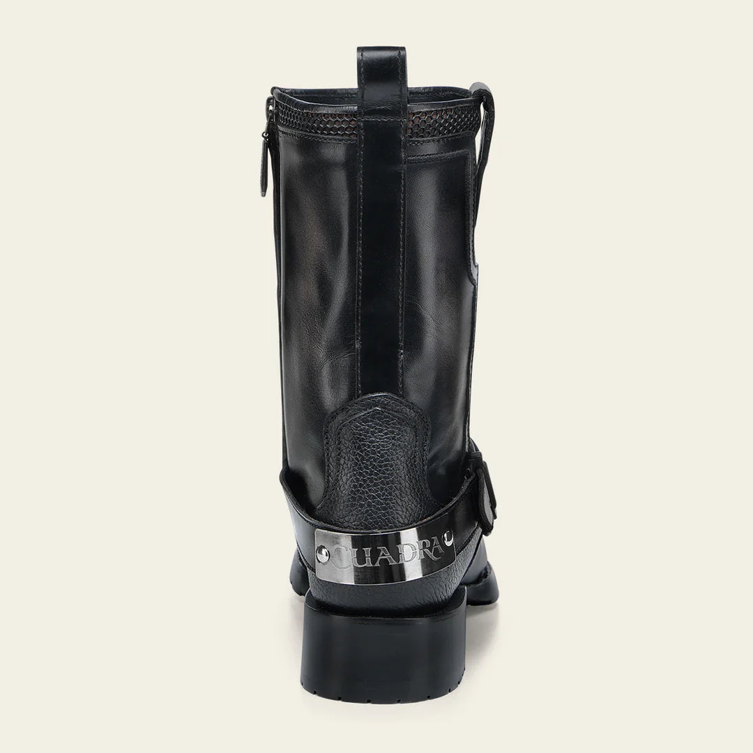 Bota biker en piel genuina de bovino para caballero. Presenta correa decorativa alrededor del tobillo ajustada con hebilla metálica y aplicación metálica con grabado Cuadra, sombreado a mano, aplicaciones de KPU en motivos geométricos al costado y borde superior, sombreado a mano y una aplicación metálica del logotipo Cuadra en oreja. Ajustado con cierre interno. Cuenta con las nuevas tecnologías: plantilla flex removible, planta Ortholite, que le dan mayor ligereza, confort, transpirabilidad y amortiguación. Suela track antiderrapante