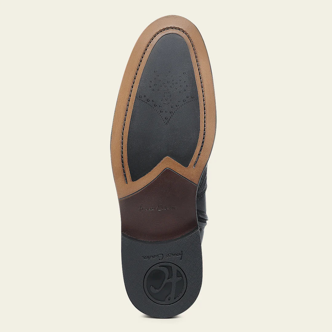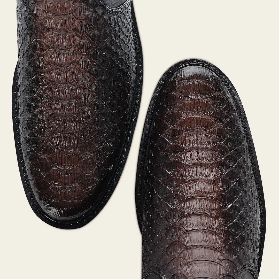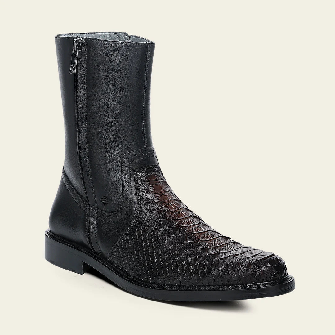 Bota de vestir para caballero en piel genuina de pitón y piel de bovino. Presenta brocado y aplicación metálica del monograma Franco Cuadra. Ajustada con doble cierre en los costados. Con suela de cuero con injerto de TPU.
