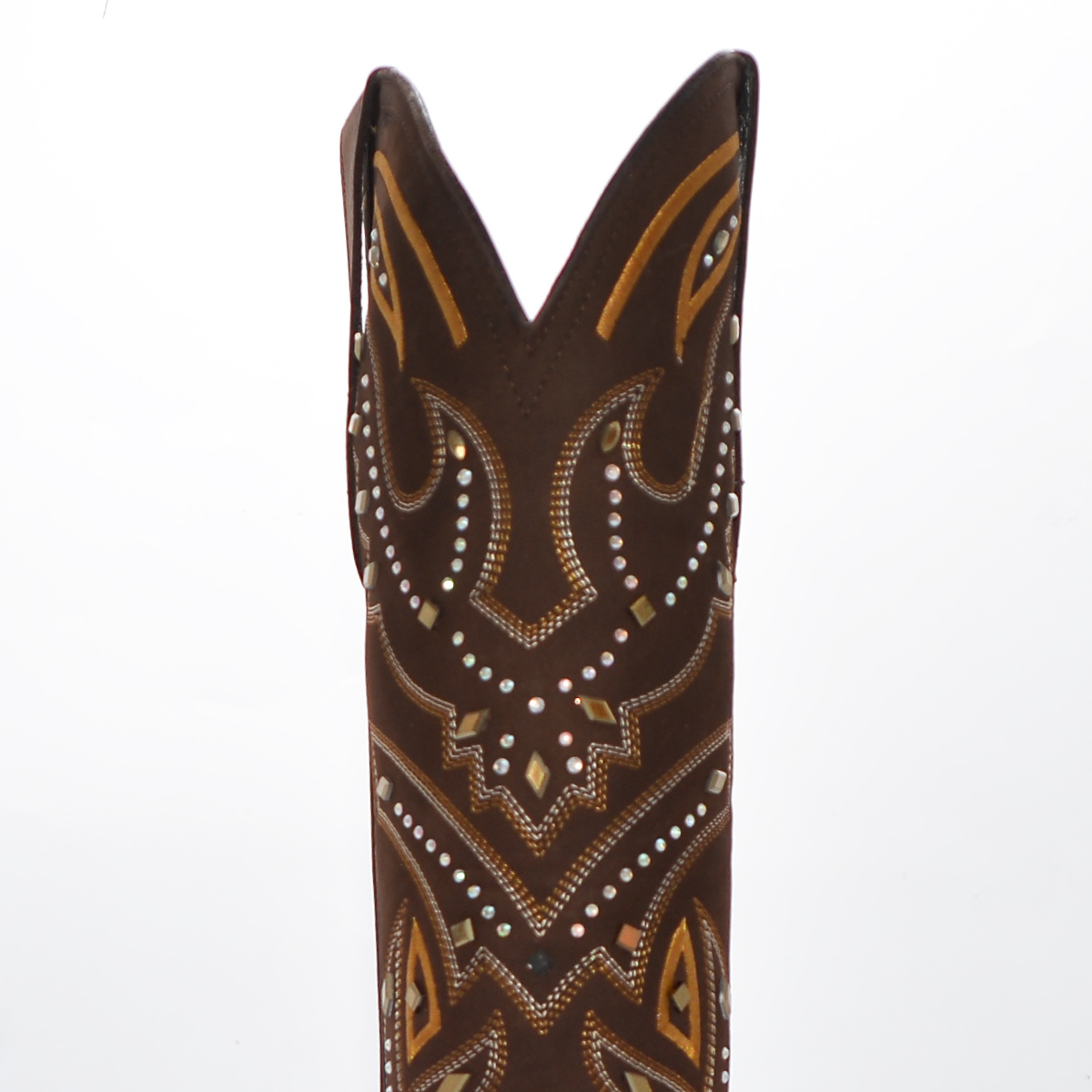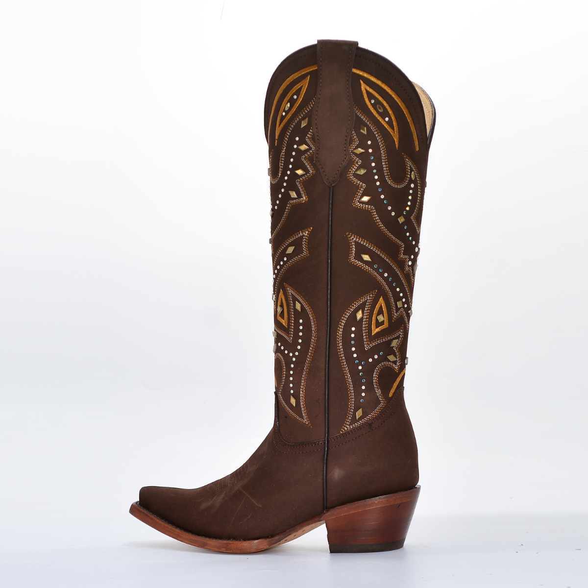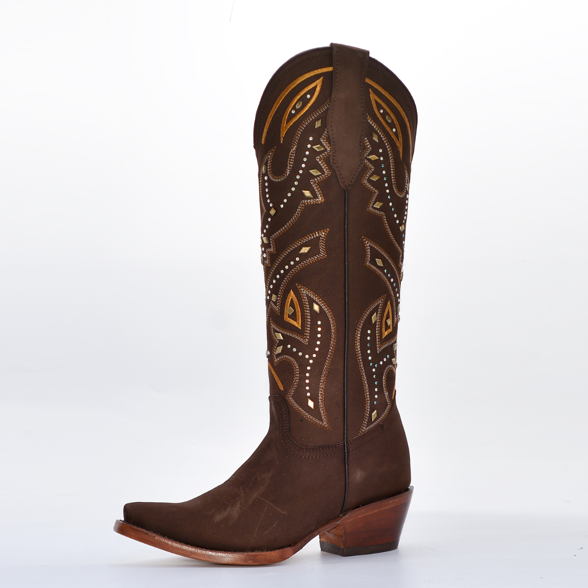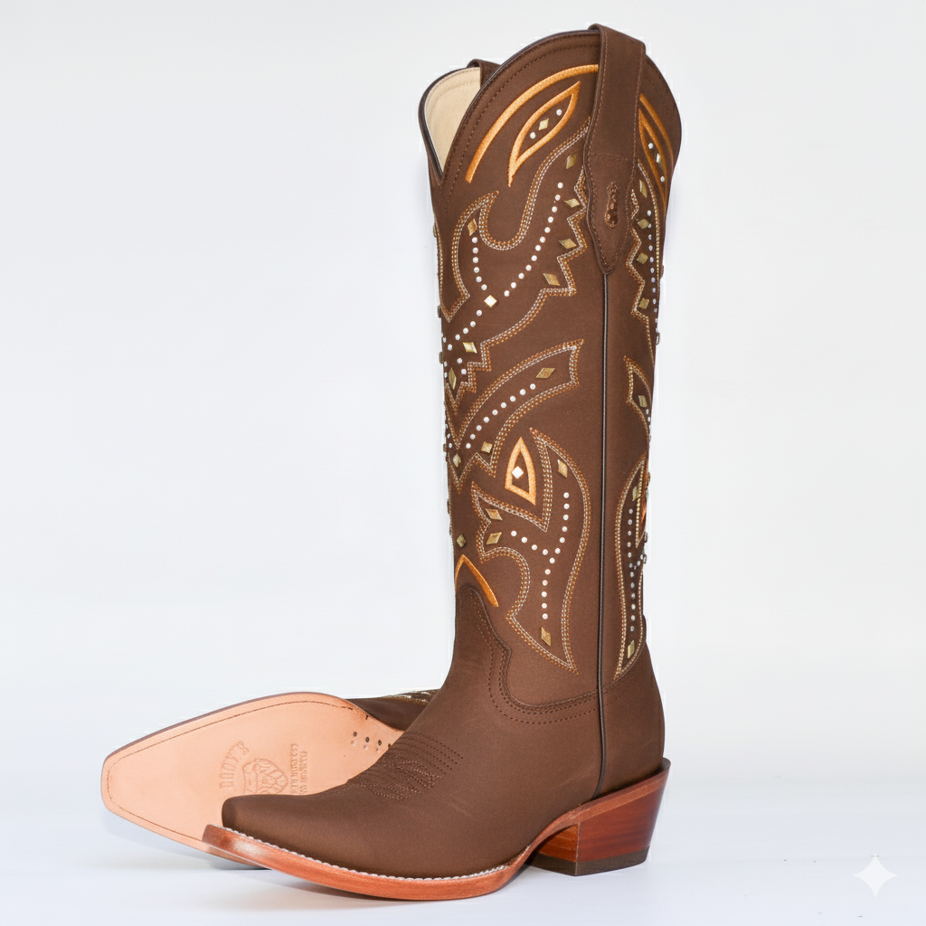 Diseño de impacto y elegancia artesanal. Esta bota destaca por su exquisito trabajo de ornamentación sobre una base de piel nubuck en tono café profundo. El acabado mate de la piel proporciona una textura aterciopelada que sirve de lienzo perfecto para un diseño de bordado intrincado y aplicaciones de pedrería que capturan la luz con cada paso. Es la bota perfecta para eventos de gala, rodeos exclusivos o para elevar un outfit casual de lujo.