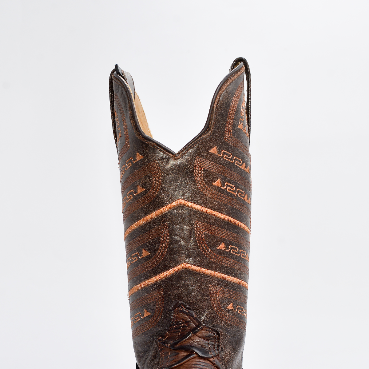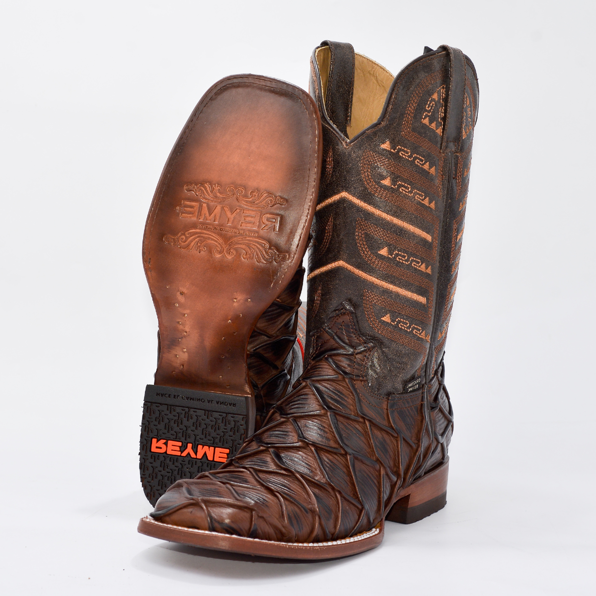 Una bota de alta gama y diseño espectacular de la marca REYME, ideal para el caballero que busca imponer estilo. El empeine está elaborado con una piel genuina exótica que presenta un impactante en relieve en tono chocolate oscuro. La caña de piel bovina complementa con un bordado artesanal geométrico en tonos cobrizos/naranjas. Esta bota es una obra de arte que combina tradición vaquera con una textura moderna y lujosa.