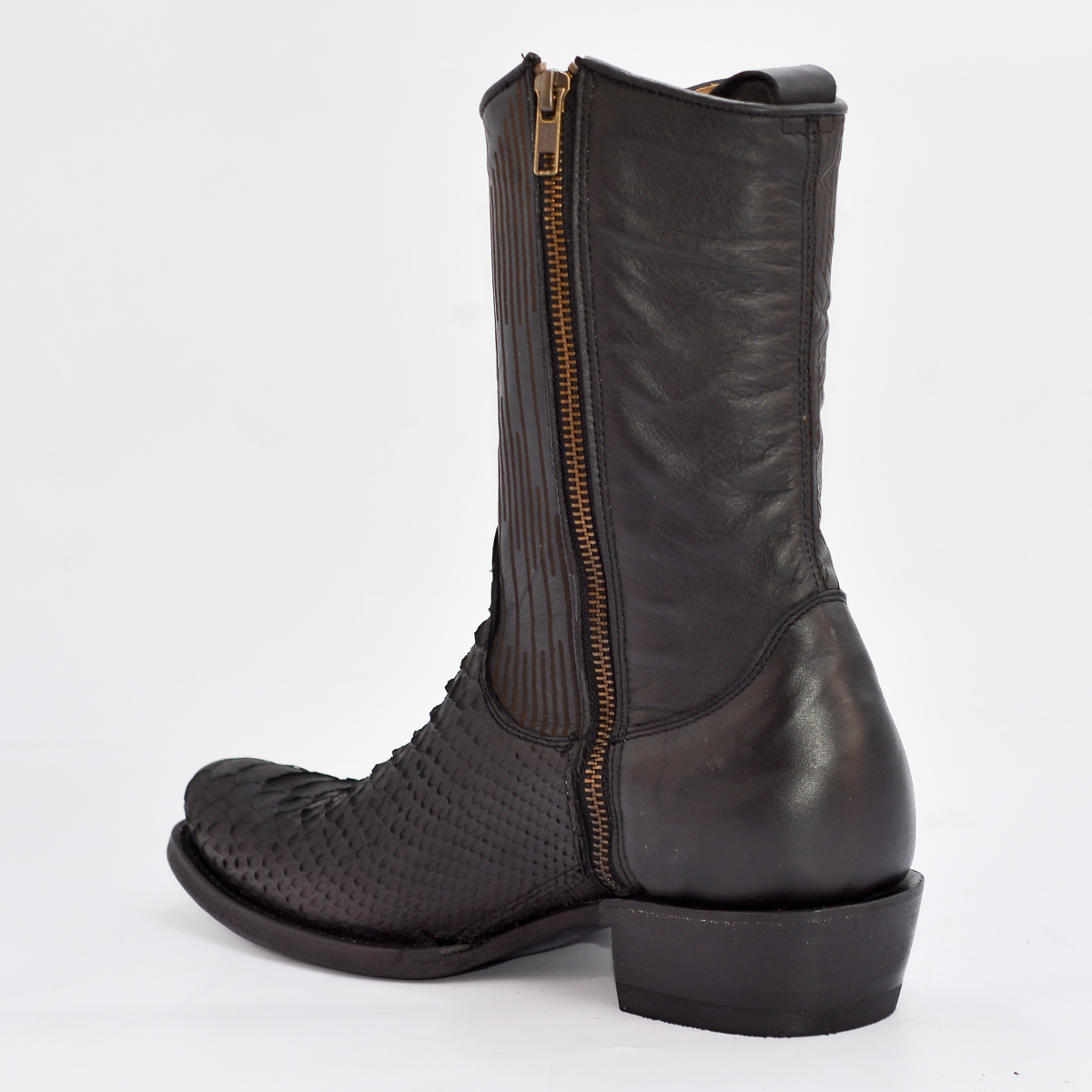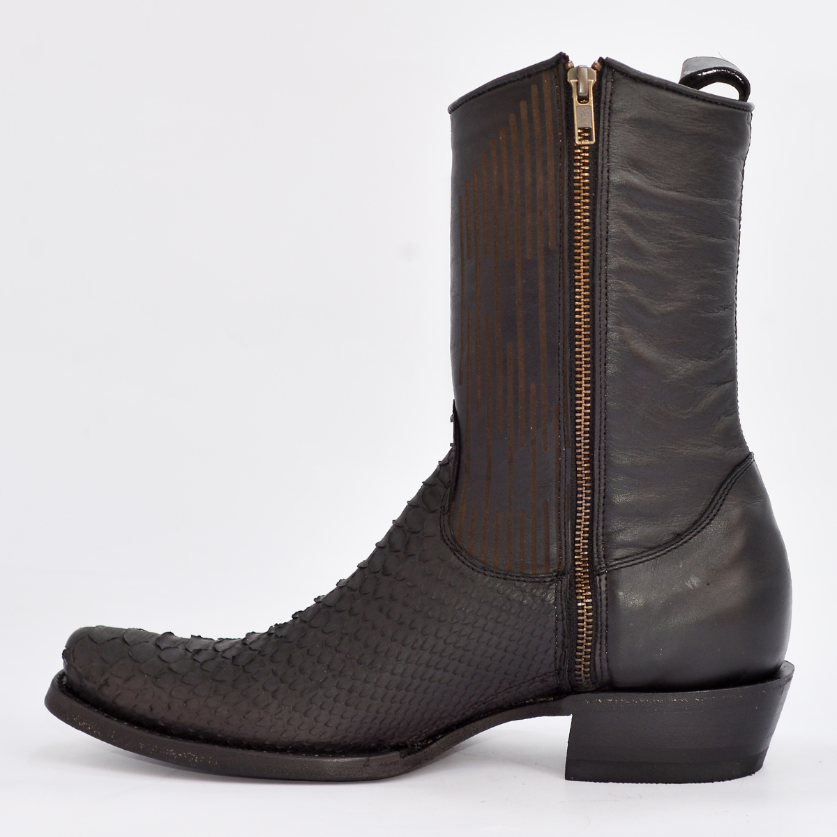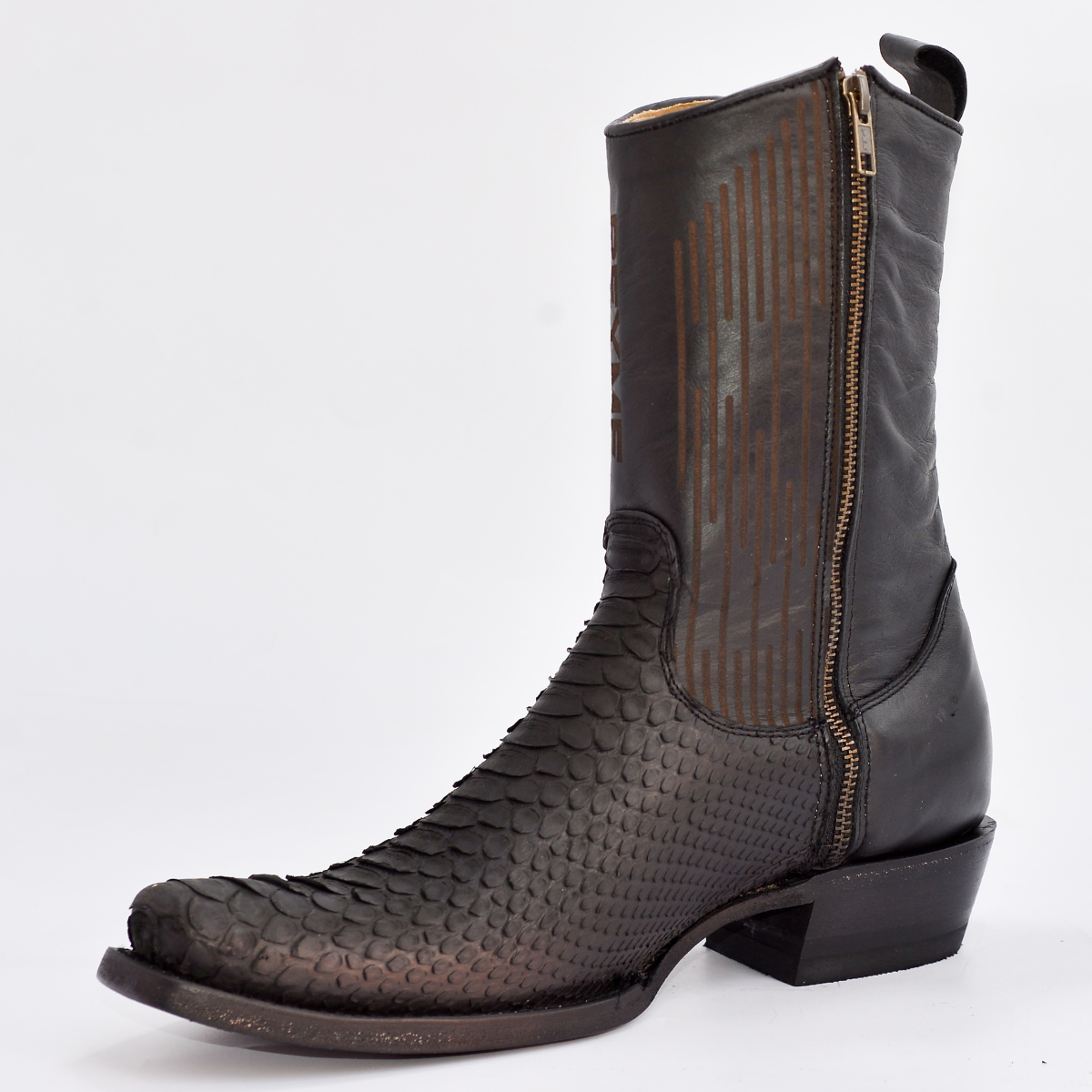 Un botín vaquero de caña media, audaz y distintivo, ideal para el caballero que busca un look moderno y elegante. Confeccionado por Original REYME, este modelo combina una piel negra de alta calidad con una llamativa piel exótica texturizada (similar a /Serpiente) en tonos cobrizos y naranjas. El cierre lateral metálico de uso rudo no solo es un detalle de diseño, sino que permite un calce rápido y práctico.