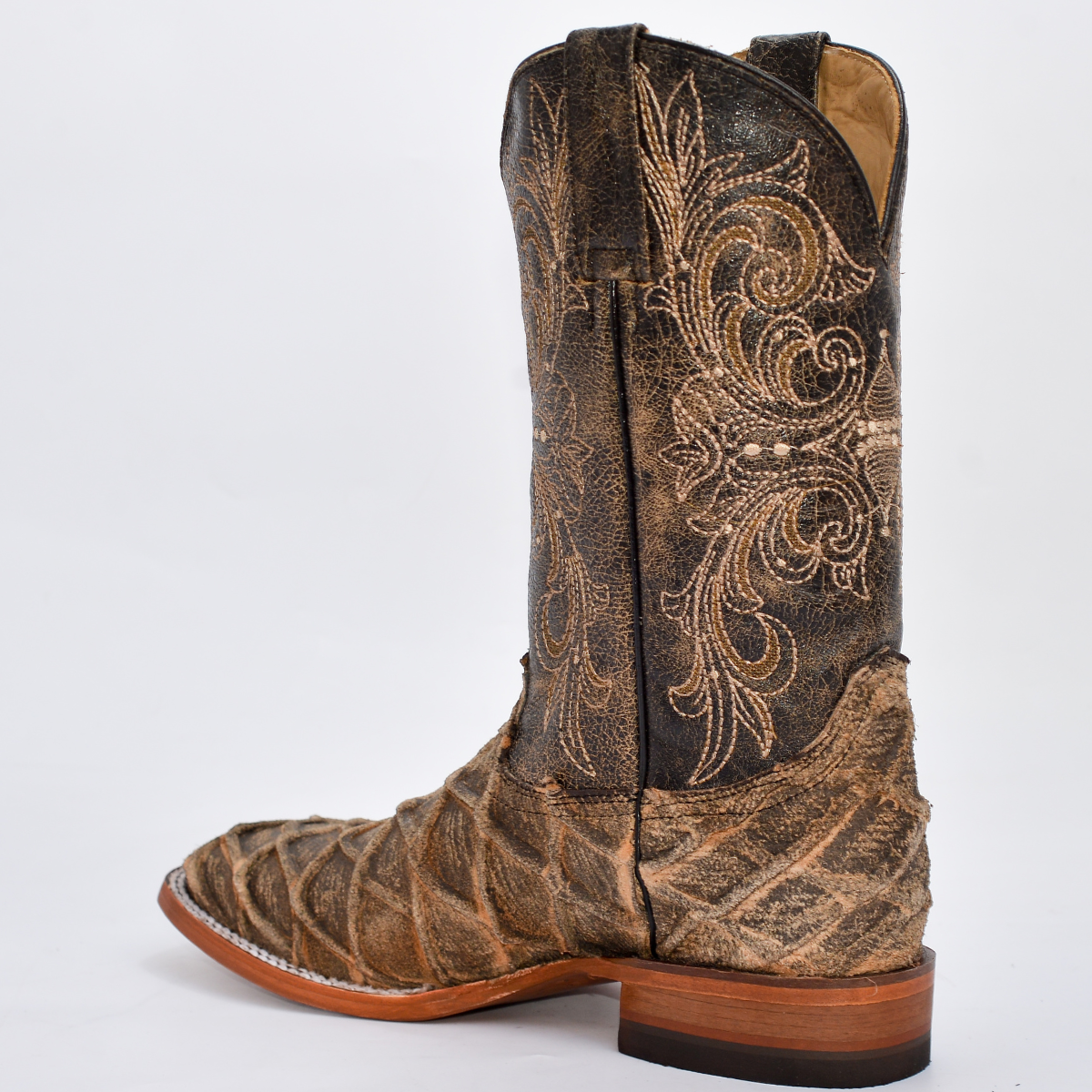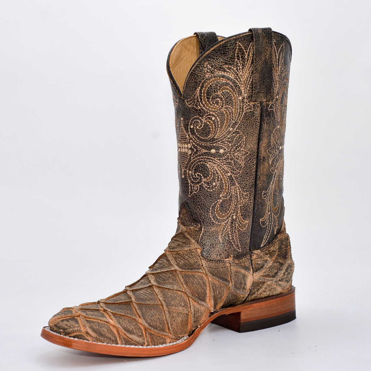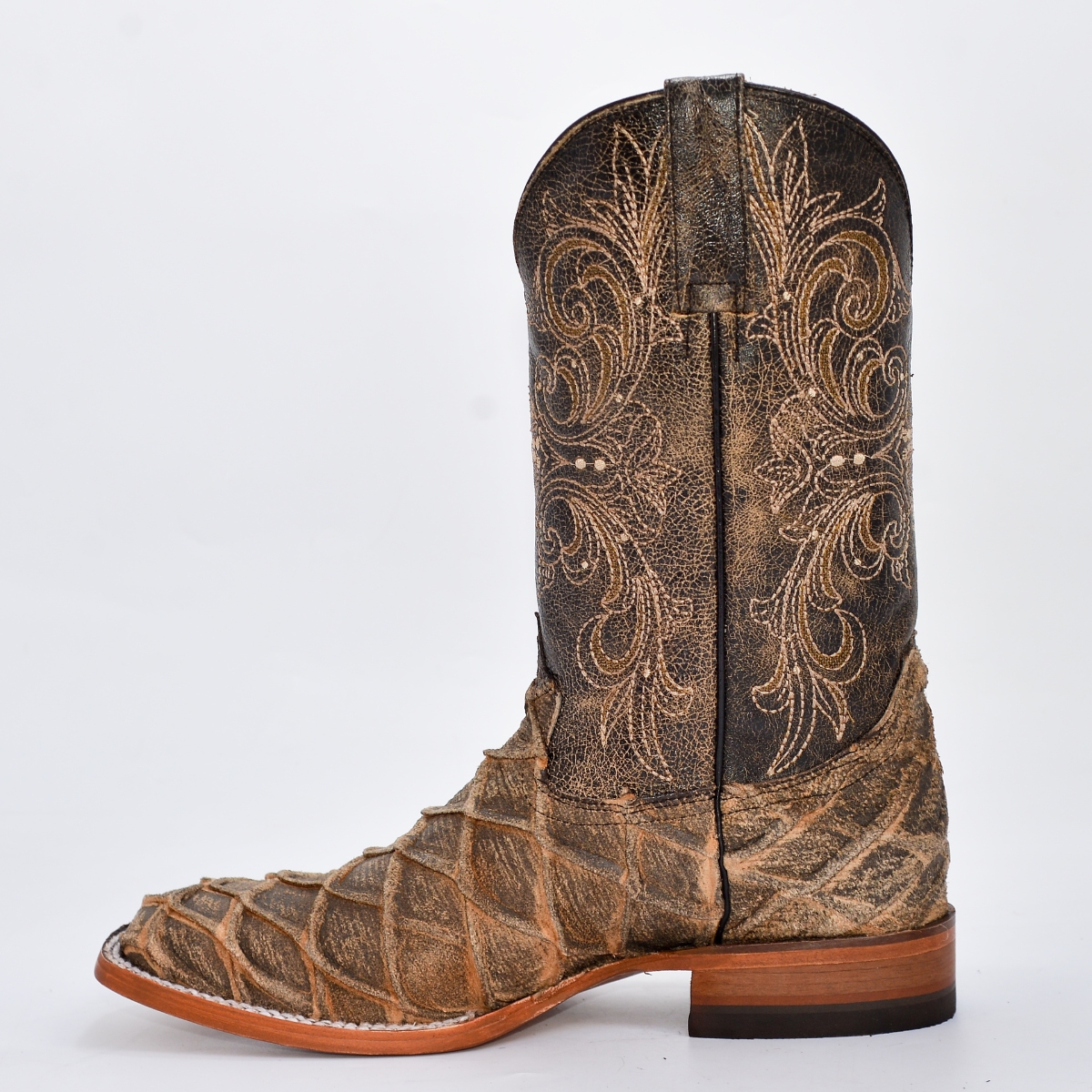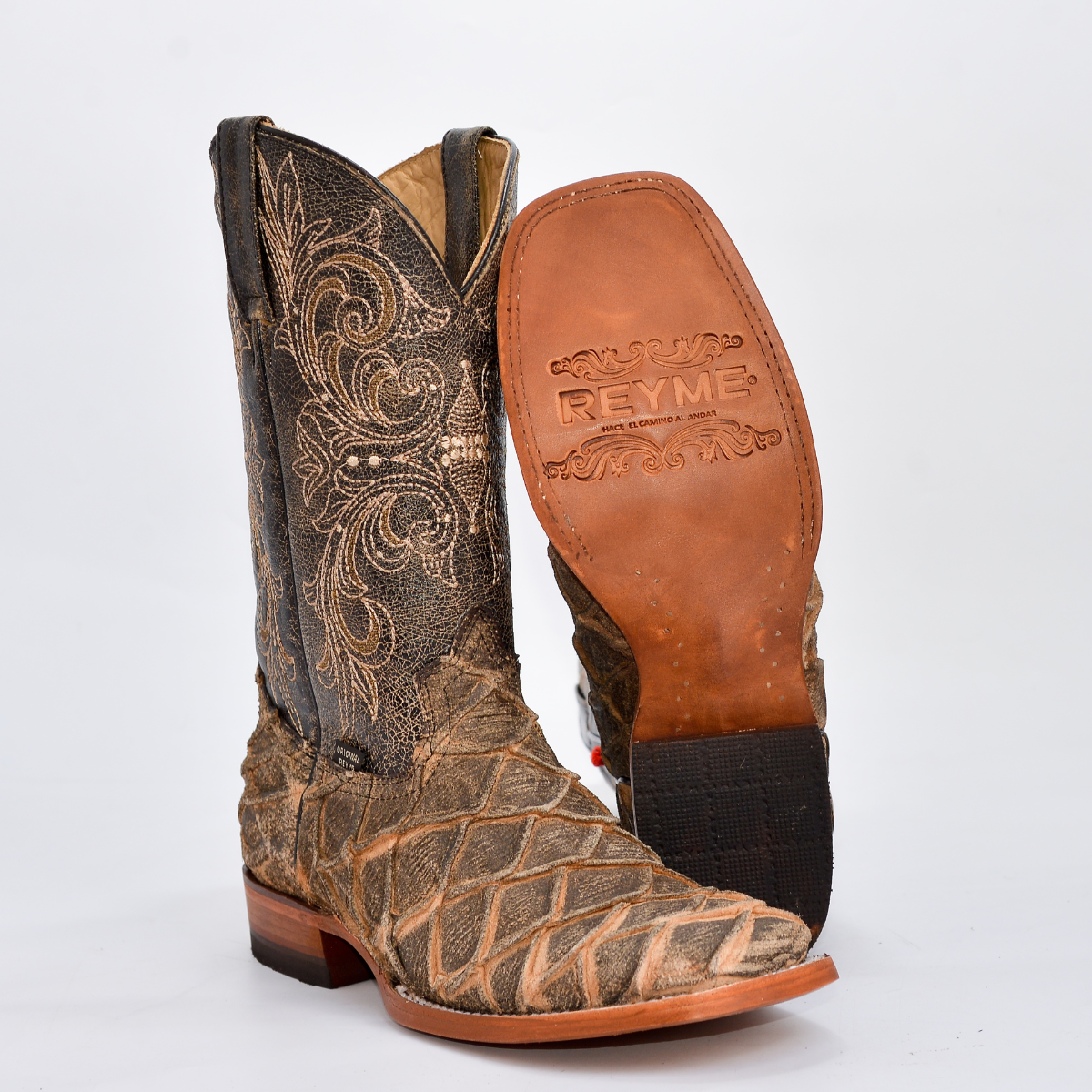 Una bota vaquera de la más alta distinción y lujo, ideal para el caballero conocedor. Confeccionada por Original REYME con la exclusiva Piel Genuina Exótica ORIX AVEJ MAR Y TIERRA. Esta piel se distingue por su patrón de diamante tejido y su acabado avejentado natural en tonos beige y café, lo que garantiza que cada par es una obra de arte única. Es la elección perfecta para eventos, rodeos y para quienes buscan un estilo auténtico, imponente y de colección.