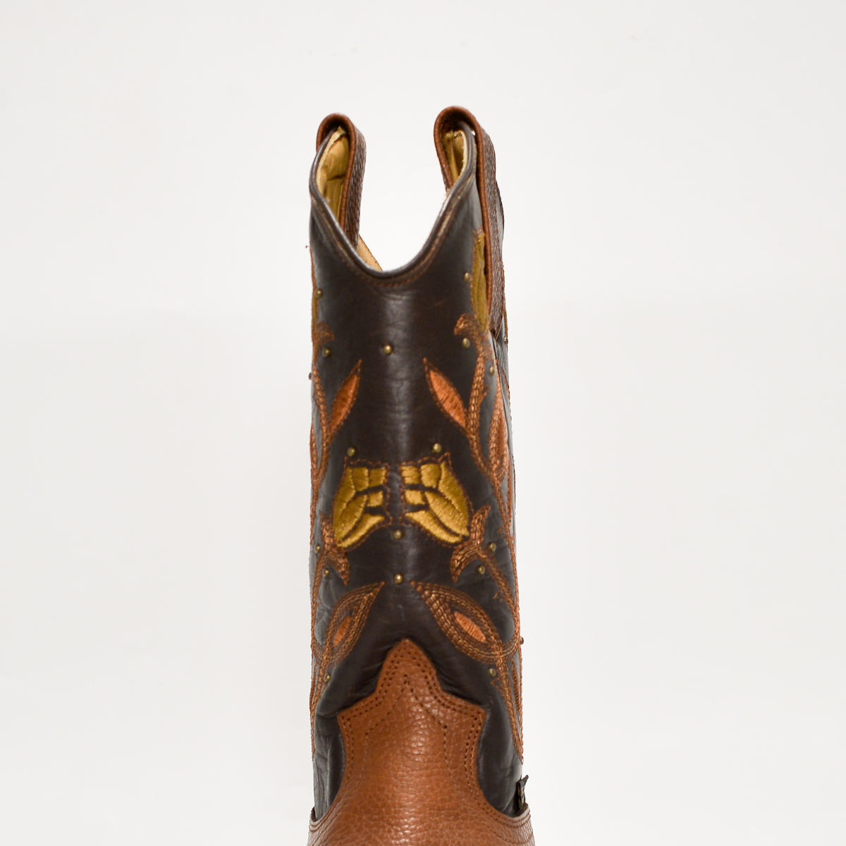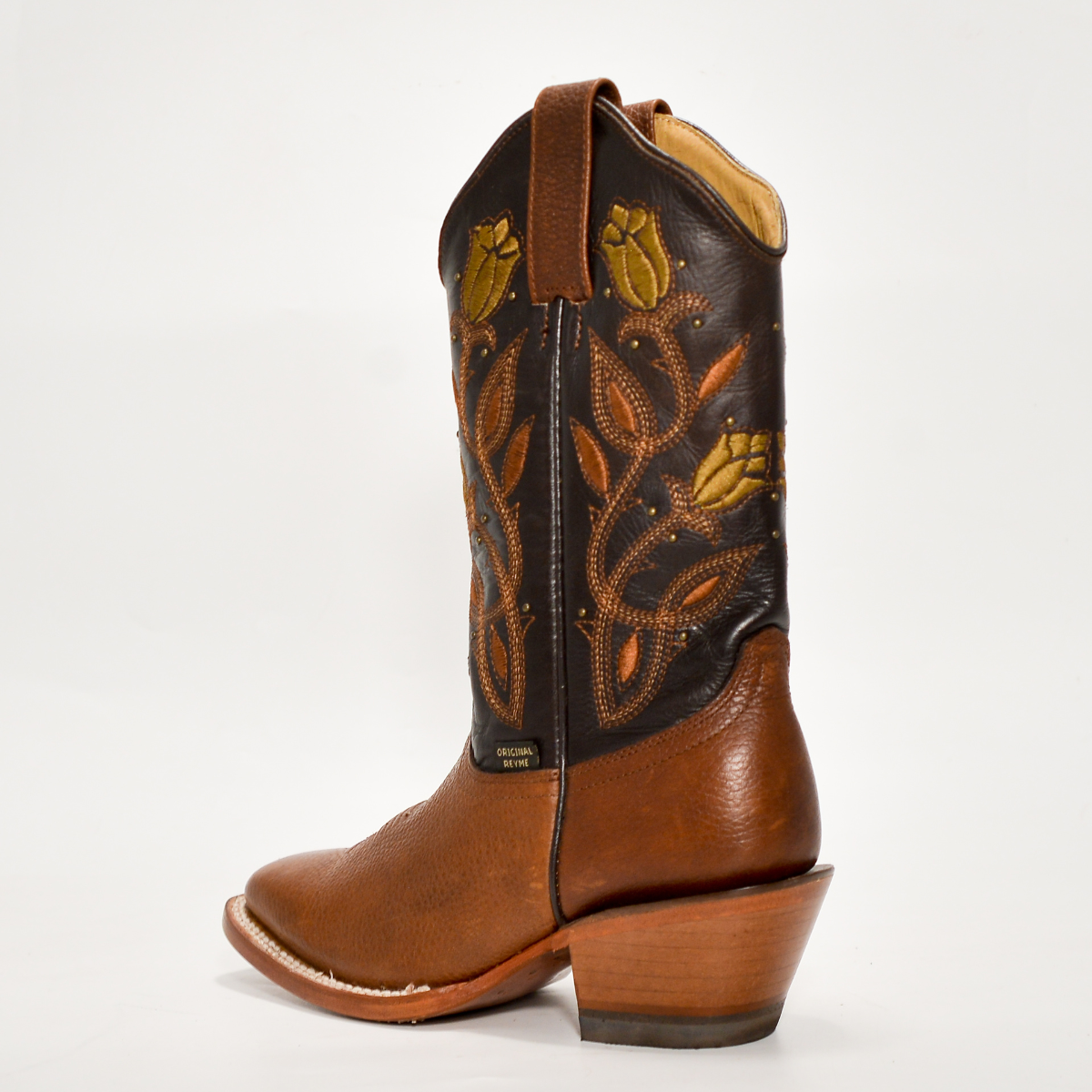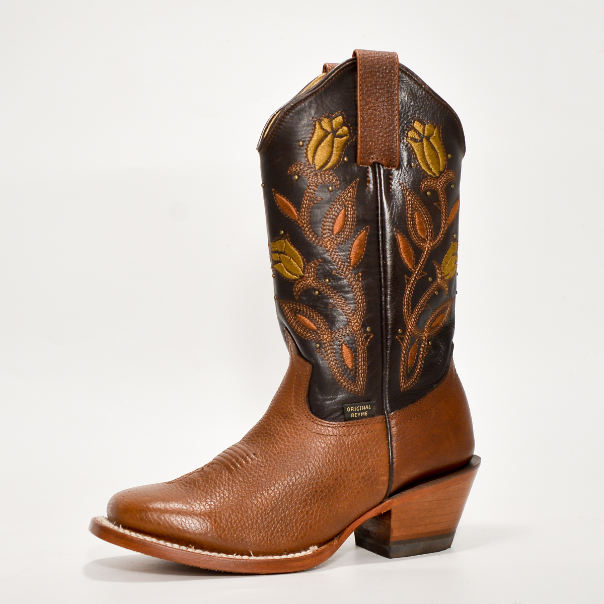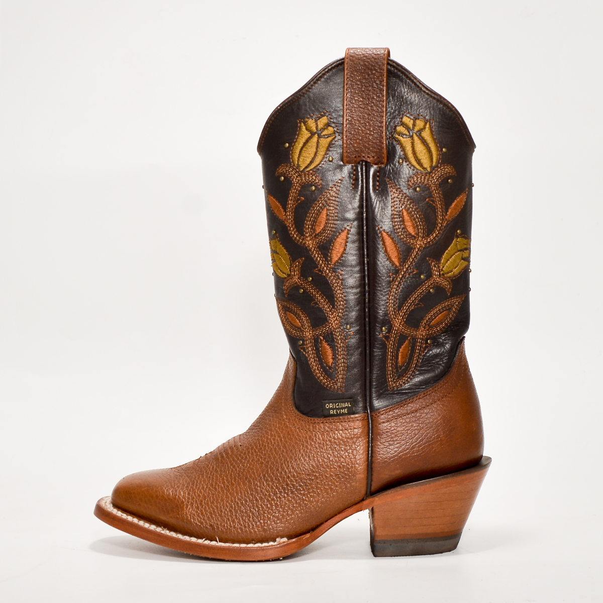 Bota Vaquera Reyme Original para Mujer – Piel Café con Bordado Floral Amarillo