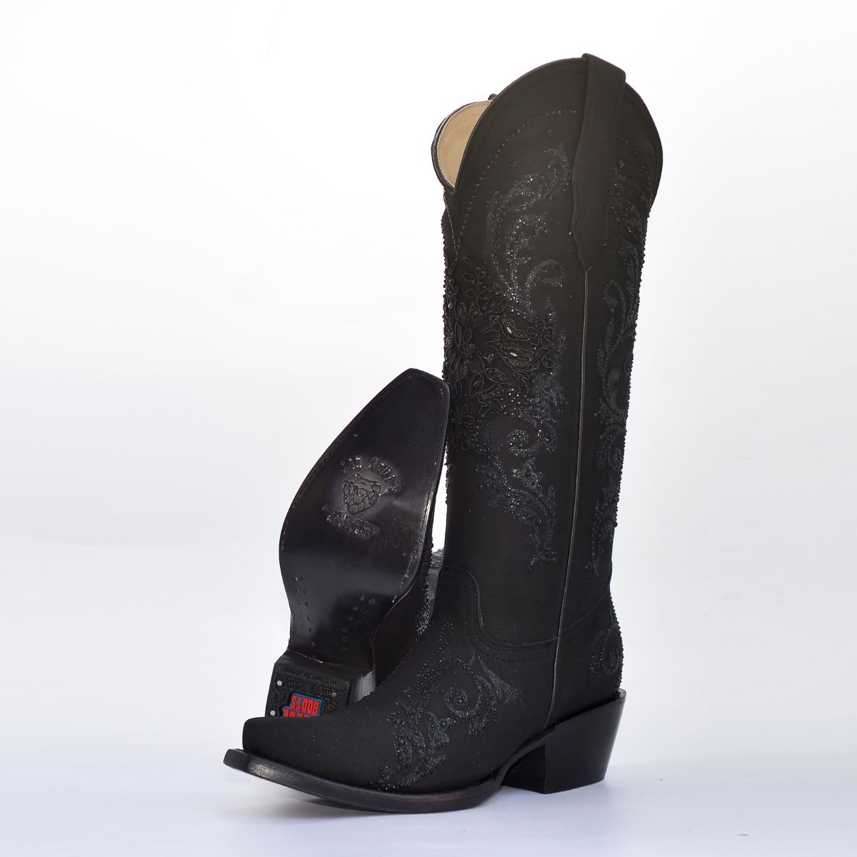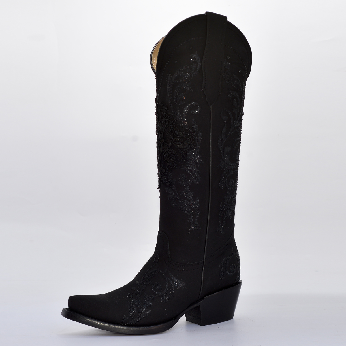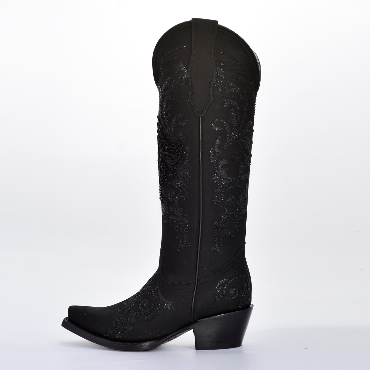 La bota presenta un diseño de color negro total con una textura que parece gamuza o textil fino, y está cubierta en toda la caña por un bordado floral artesanal en relieve y una capa de brillo/glitter discreto y pedrería en el mismo tono oscuro. La combinación de elementos crea un efecto visual de lujo y dramatismo. La horma puntiaguda y el tacón estilo cubano estilizan la figura, haciéndola perfecta para fiestas, eventos nocturnos o un look de impacto.