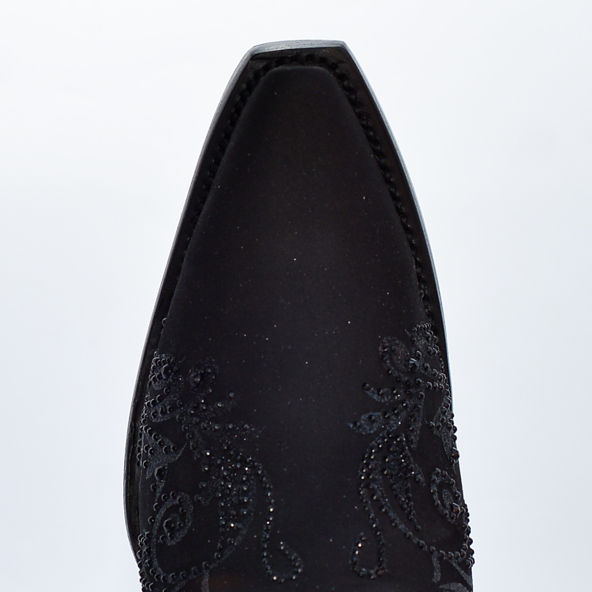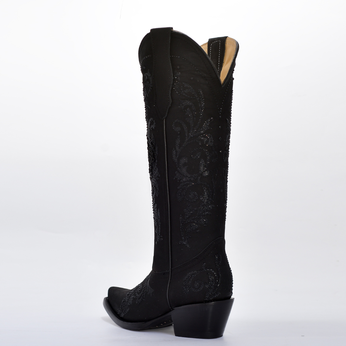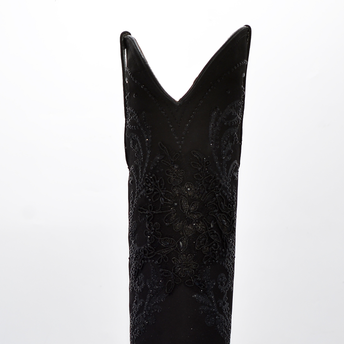 La bota presenta un diseño de color negro total con una textura que parece gamuza o textil fino, y está cubierta en toda la caña por un bordado floral artesanal en relieve y una capa de brillo/glitter discreto y pedrería en el mismo tono oscuro. La combinación de elementos crea un efecto visual de lujo y dramatismo. La horma puntiaguda y el tacón estilo cubano estilizan la figura, haciéndola perfecta para fiestas, eventos nocturnos o un look de impacto.