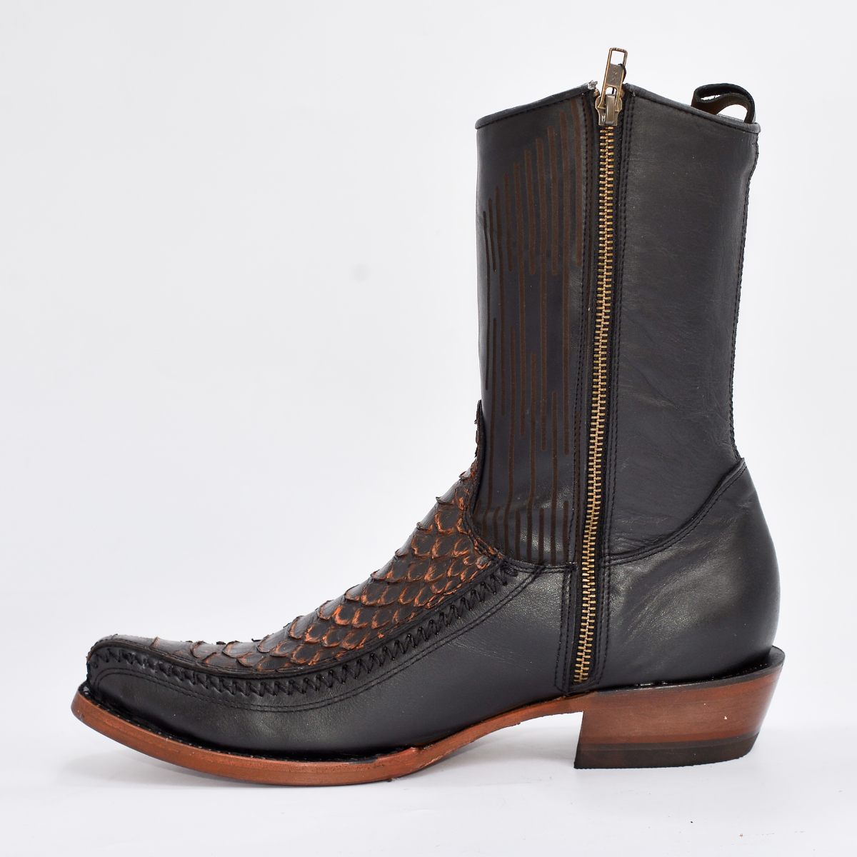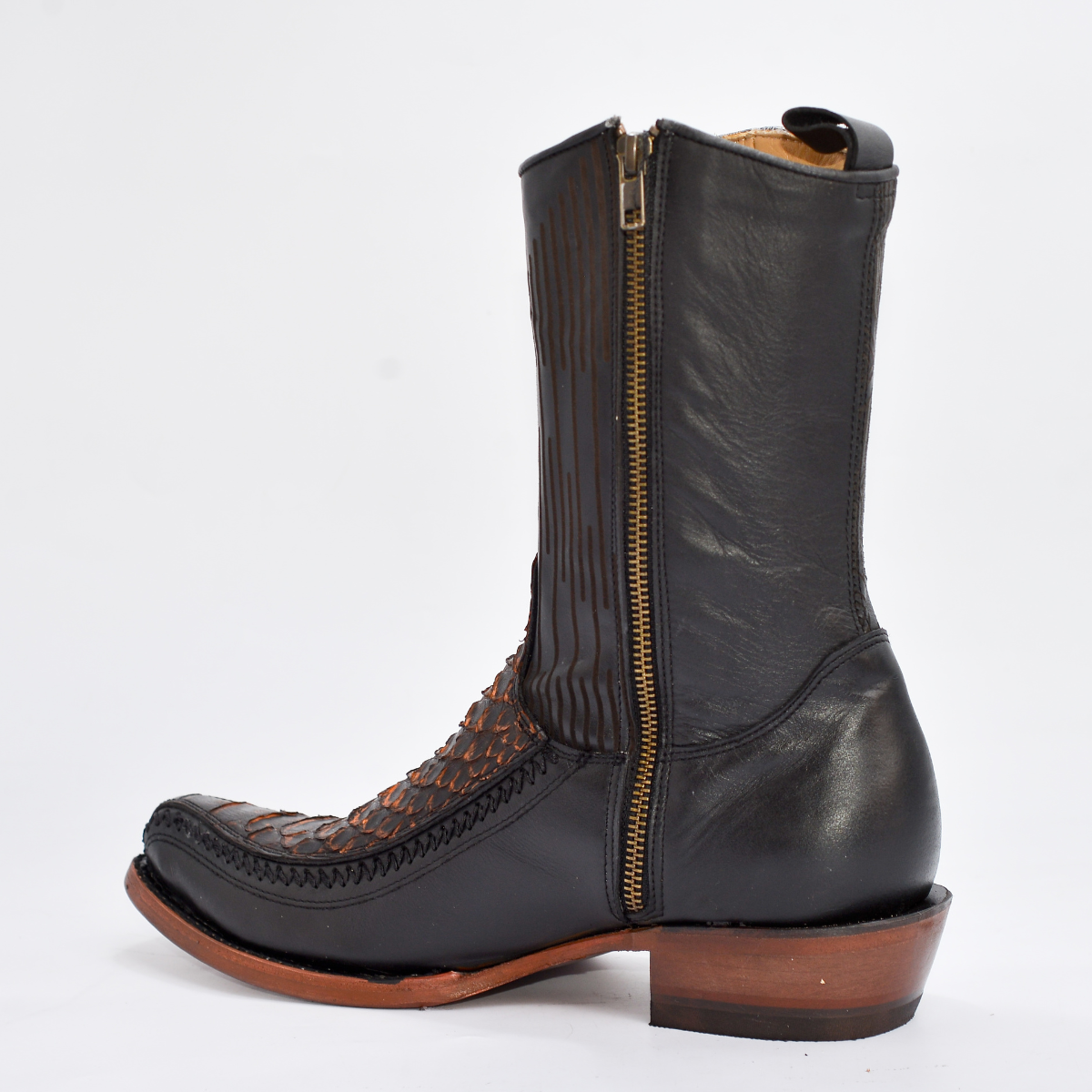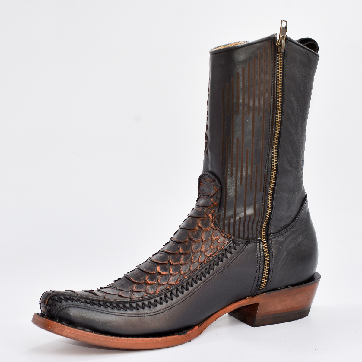 Un Botín vaquero sofisticado y de caña media para caballero, diseñado para destacar. Elaborado por Original REYME con una audaz combinación de pieles: el empeine lleva un patrón exótico (similar a la piel de Pez o Serpiente) en tono bronce/naranja, que contrasta con la piel bovina negra del resto del cuerpo. Su característica principal es el cierre lateral metálico de uso rudo que facilita el calce y añade un toque biker moderno.