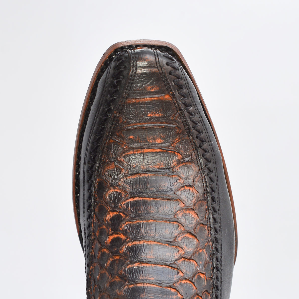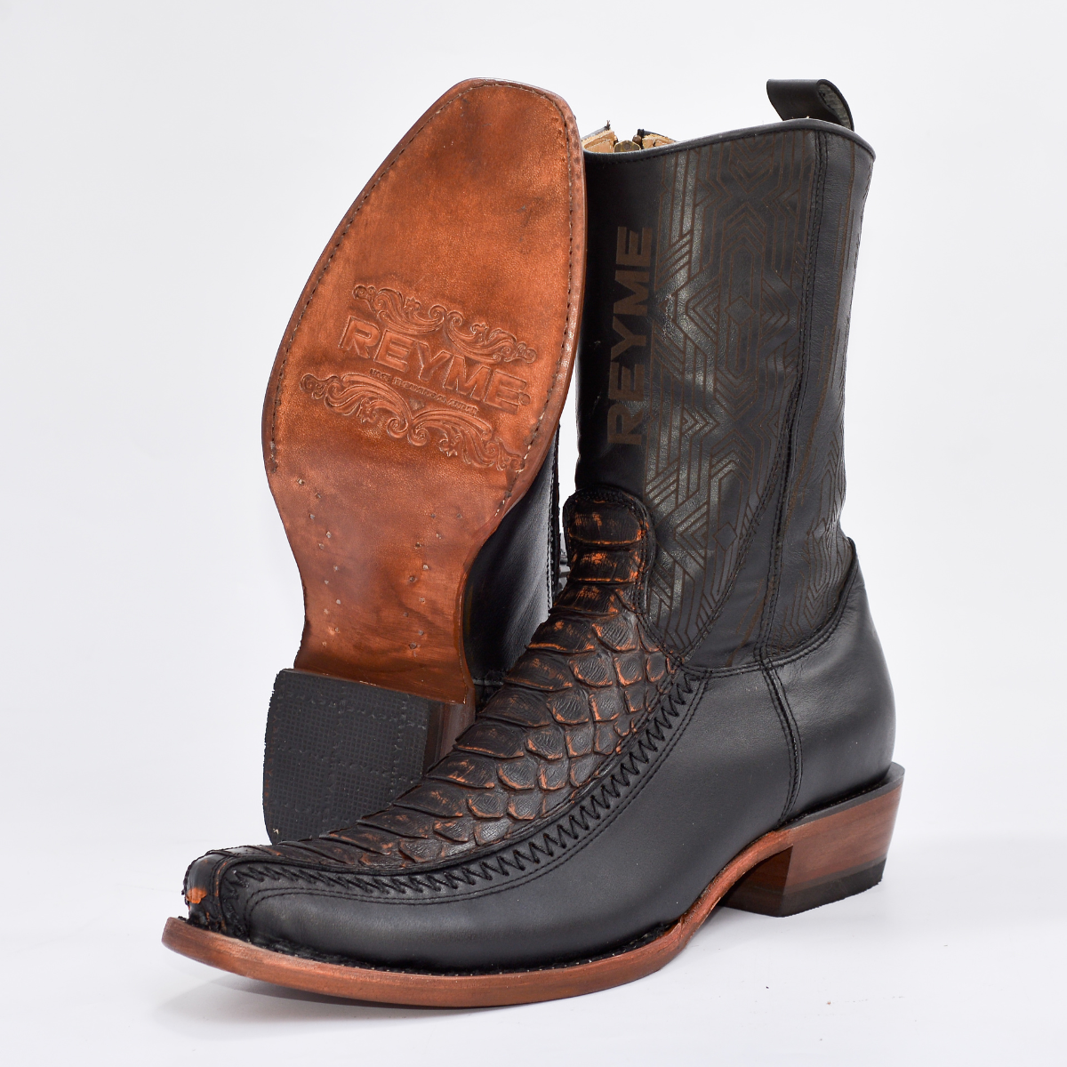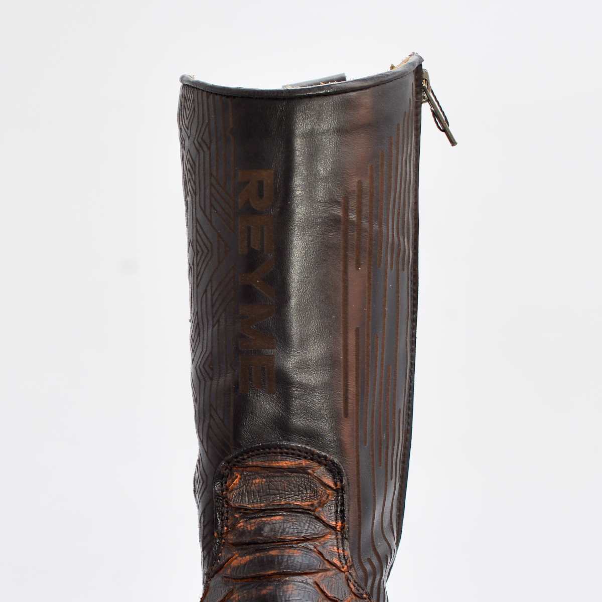 Un Botín vaquero sofisticado y de caña media para caballero, diseñado para destacar. Elaborado por Original REYME con una audaz combinación de pieles: el empeine lleva un patrón exótico (similar a la piel de Pez o Serpiente) en tono bronce/naranja, que contrasta con la piel bovina negra del resto del cuerpo. Su característica principal es el cierre lateral metálico de uso rudo que facilita el calce y añade un toque biker moderno.