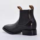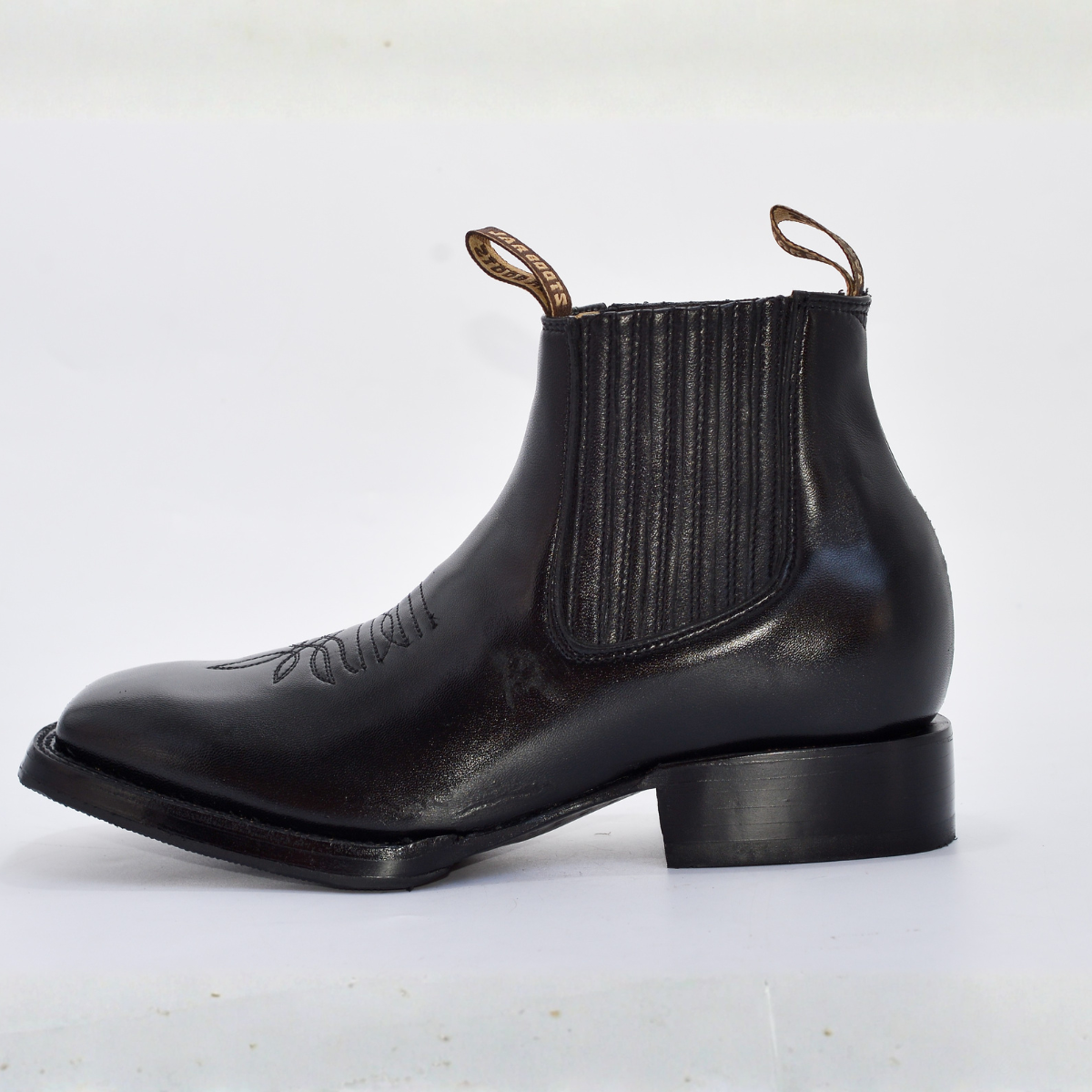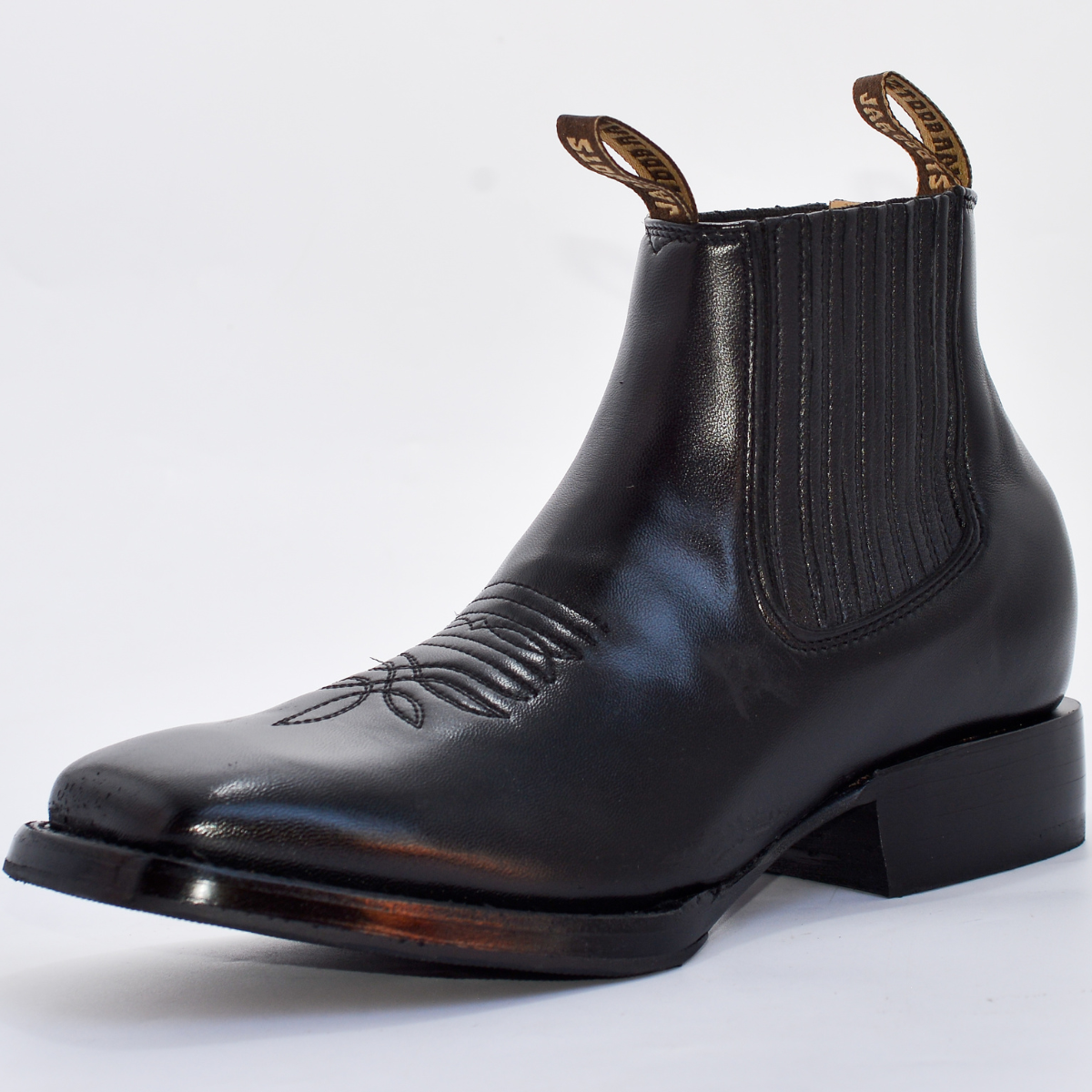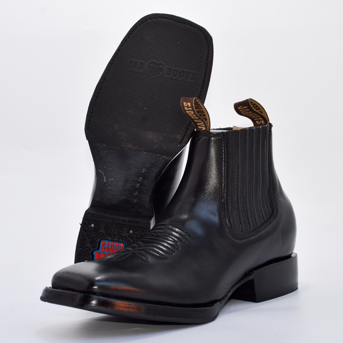 Este botín está elaborado con piel genuina negra de acabado liso y semi-brillante, destacando por su horma cuadrada (Square Toe) moderna y cómoda. Su diseño de botín corto (Jalapeño) incluye bandas elásticas laterales para un calce rápido y fácil, y presillas con la marca (NVO JAR BOOTS) en la parte superior. El empeine presenta un sutil detalle de bordado en el mismo tono de la piel. La suela y el tacón vaquero bajo aseguran comodidad y estabilidad.