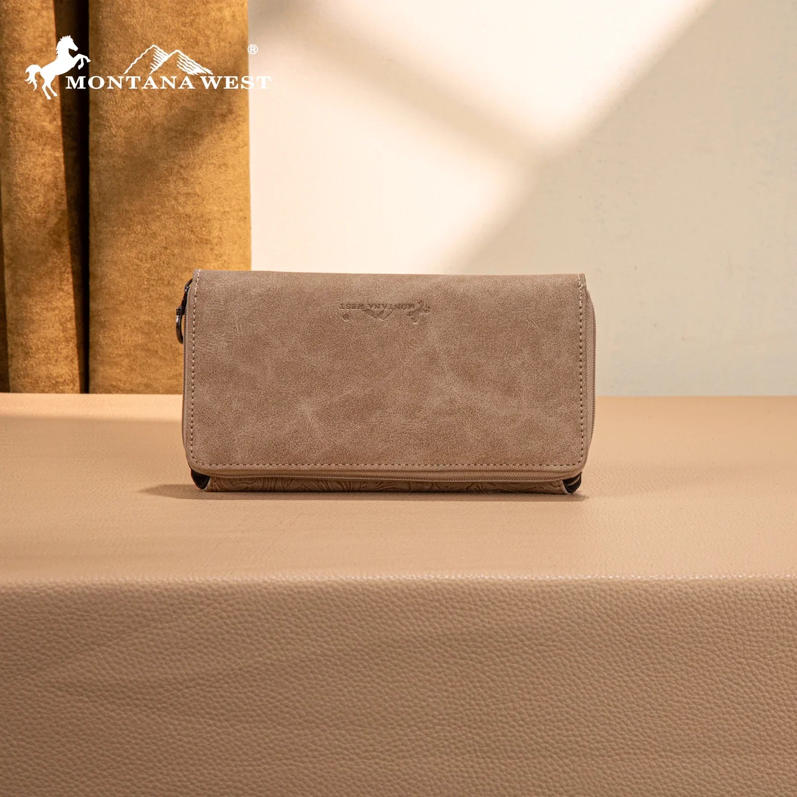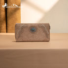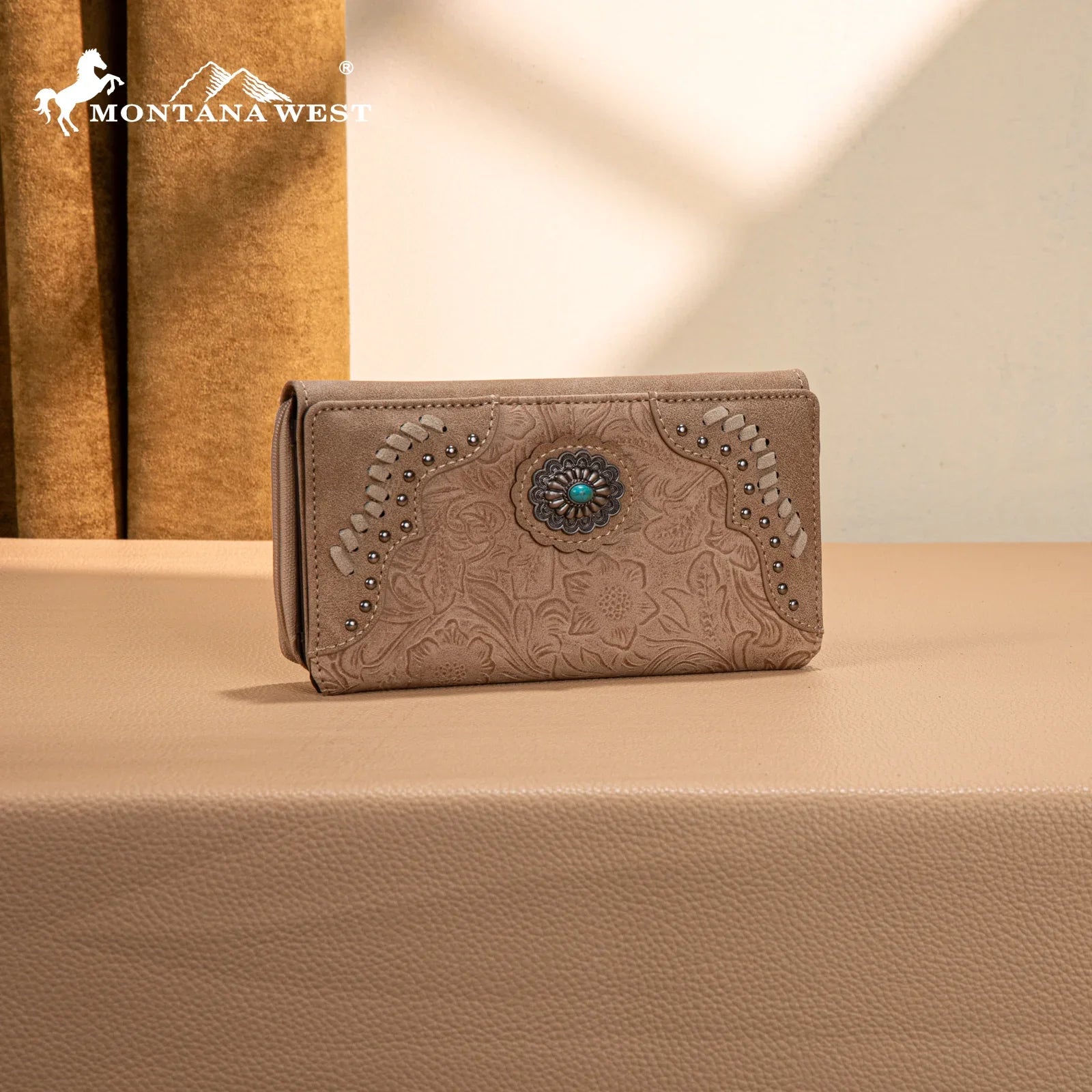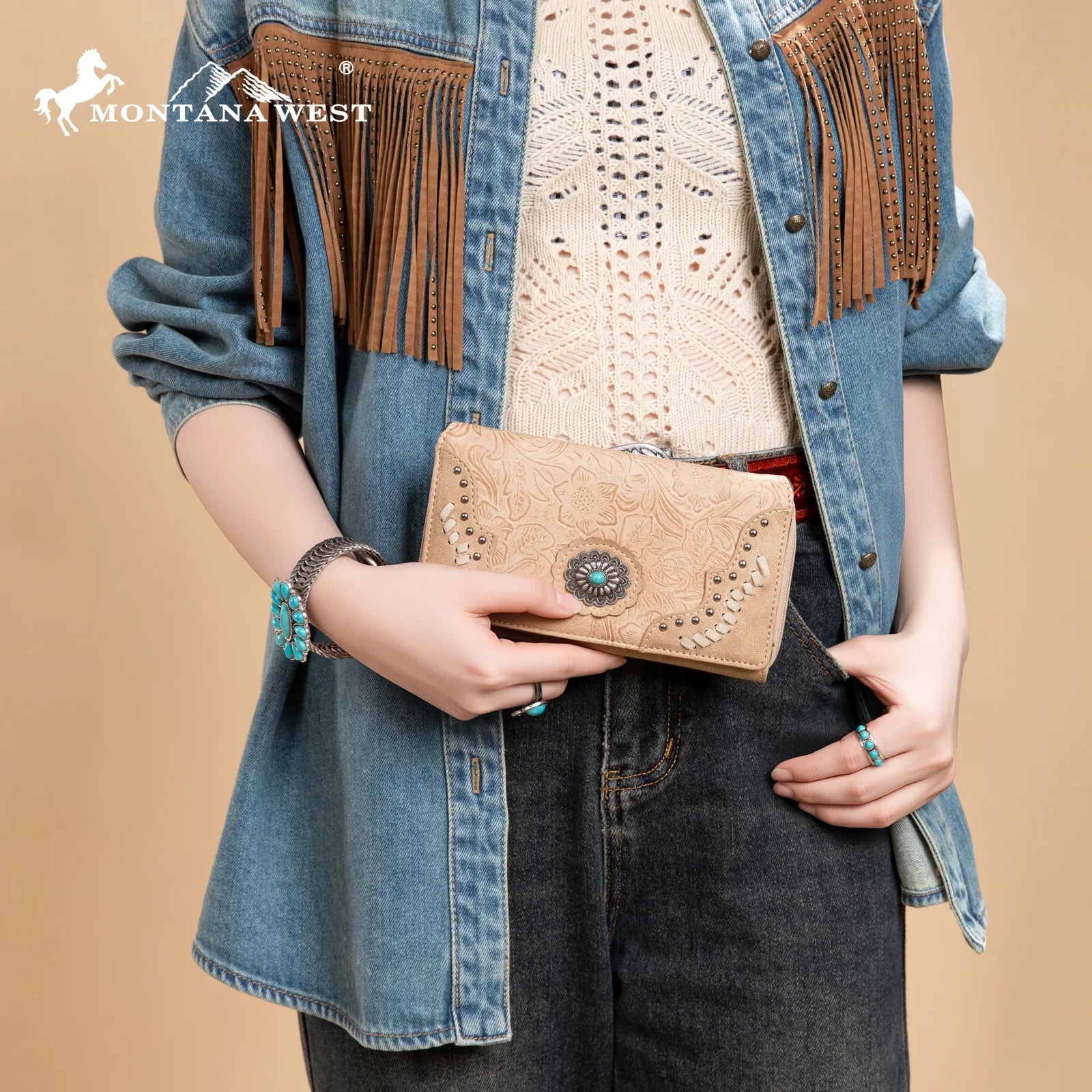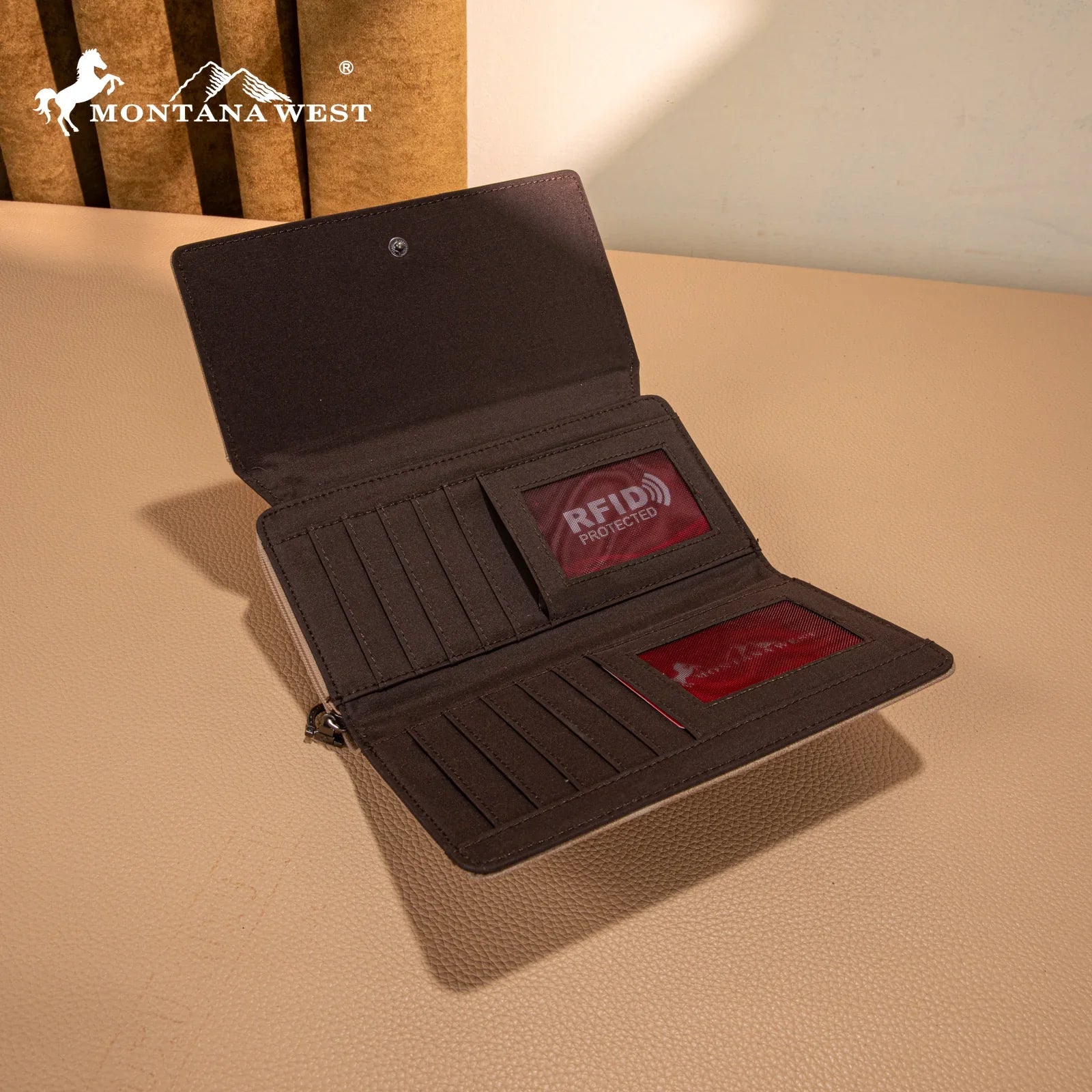 Fabricada por la reconocida marca Montana West, esta cartera destaca por su calidad y atención al detalle. Cuenta con múltiples compartimentos que permiten organizar tarjetas, billetes y monedas de manera eficiente, facilitando el acceso a tus pertenencias. Su tamaño compacto la hace ideal para llevar en el bolso sin ocupar demasiado espacio.