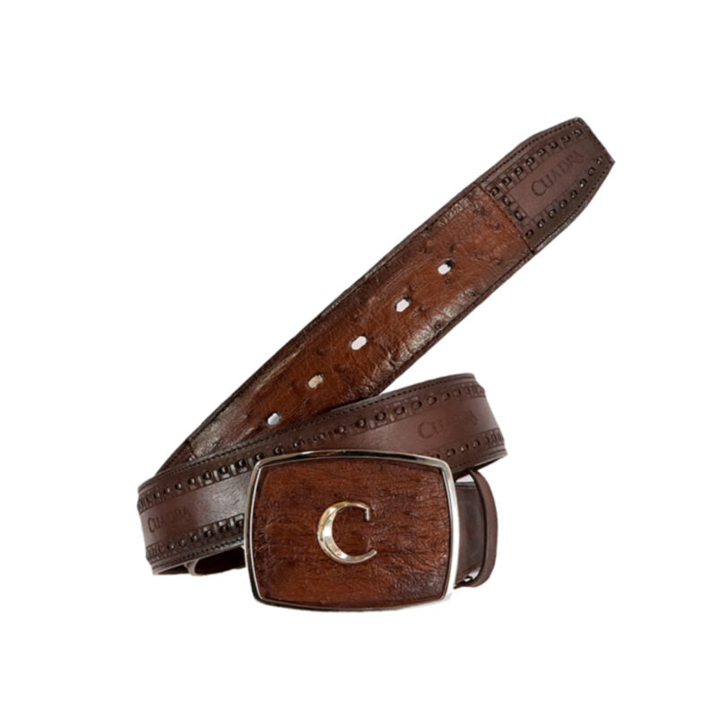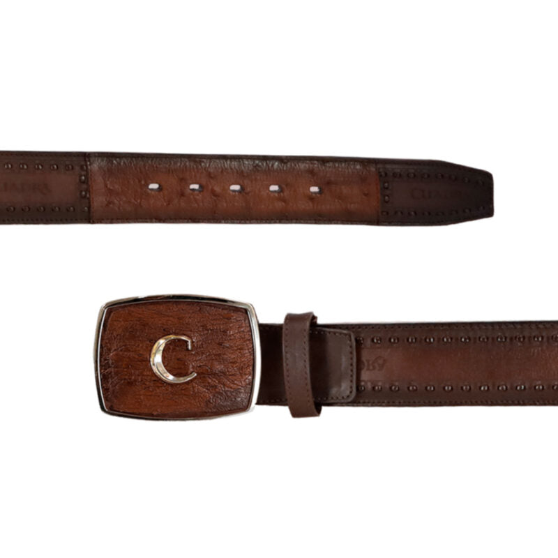Cinturón para caballero en piel de avestruz color marrón, diseño de la hebilla en logo de cuadra.