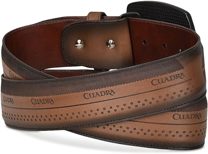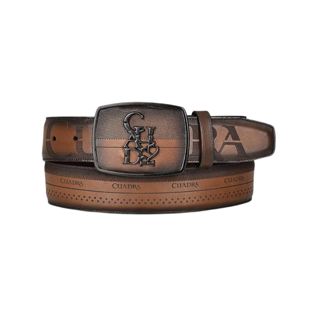 Cinturón vaquero para caballero en piel de bovino. Presenta grabado láser de logotipo Cuadra a lo largo de la tira. Hebilla forrada de 45 mm con grabado láser y aplicación metálica de monograma Cuadra. Con forro en piel de bovino con serigrafía de logotipo Cuadra.
