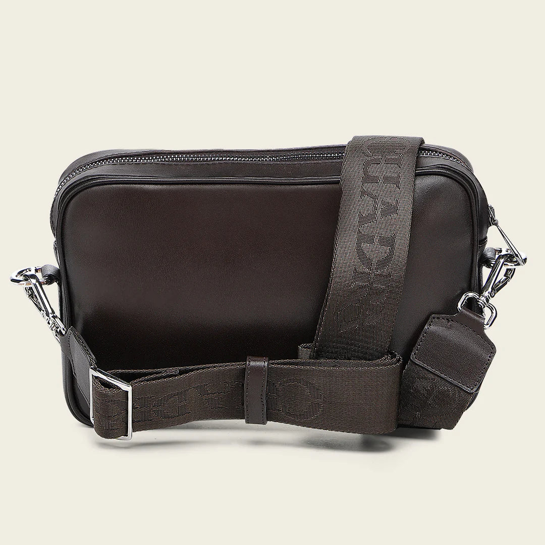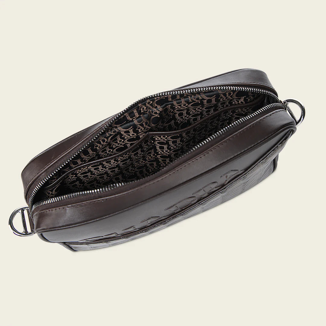 Bandolera para caballero en piel genuina de alligator y piel de bovino. Presenta logotipo Cuadra con alta frecuencia en alto relieve y un compartimento asegurado con cierre con dos bolsillos internos. Con asa de textil ajustable y desmontable con grabado del logotipo.