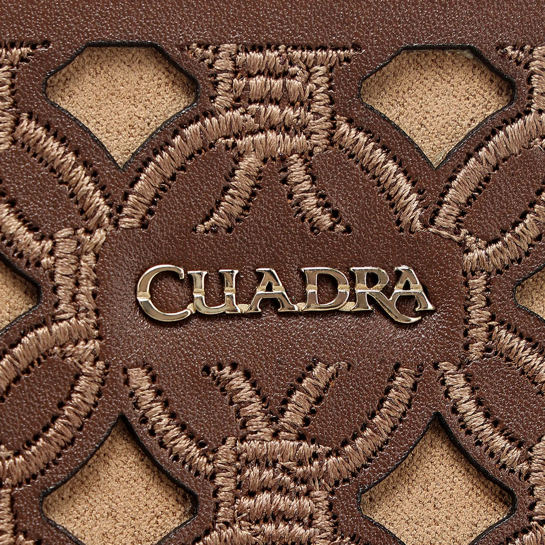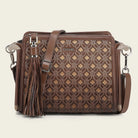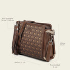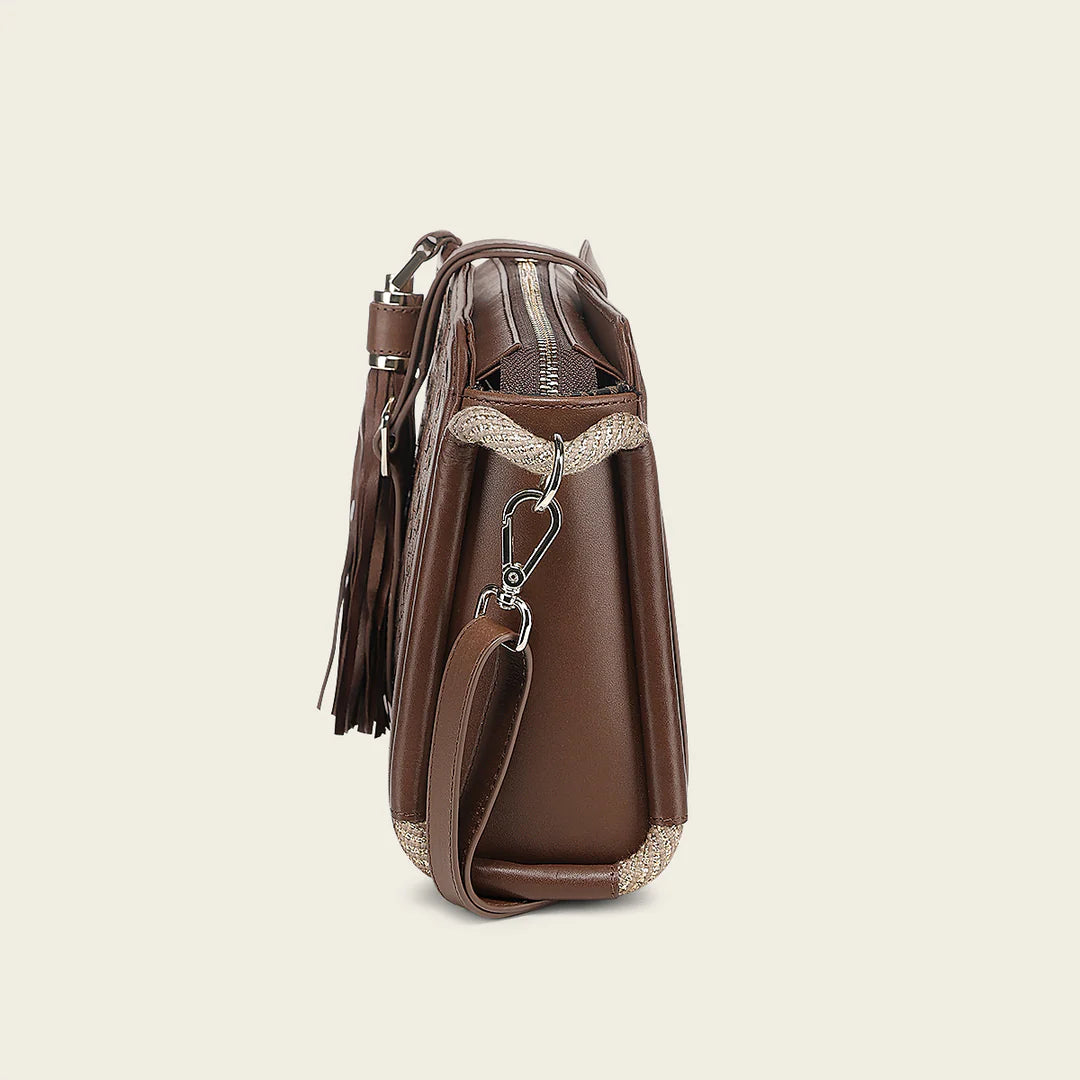 Crossbody para dama en piel genuina de bovino. Presenta aplicación metálica del logotipo, bordado en alto relieve, perforaciones láser con motivos geométricos y una borla colgante en piel genuina. Con cuerdas decorativas a los costados. La parte interna cuenta con un bolsillo con cierre. Con asa larga, ajustable y desmontable. Asegurado con cierre.