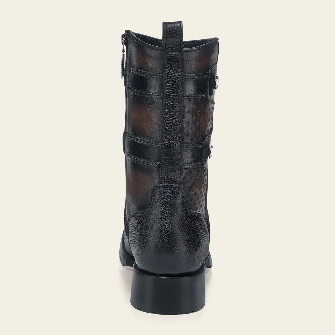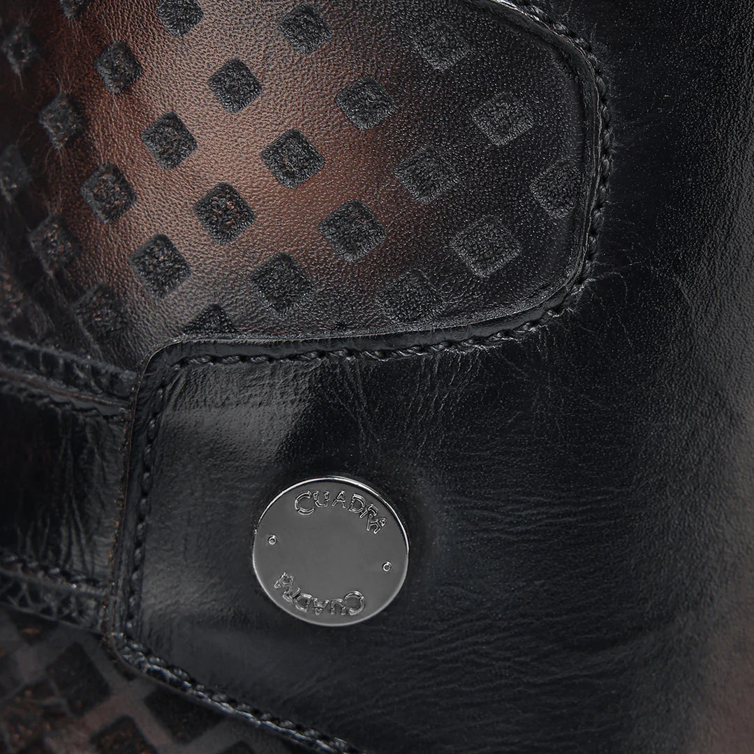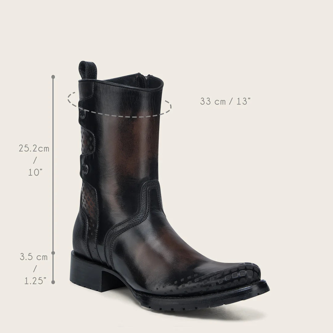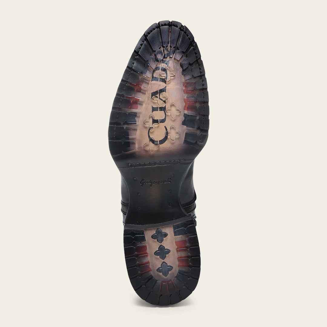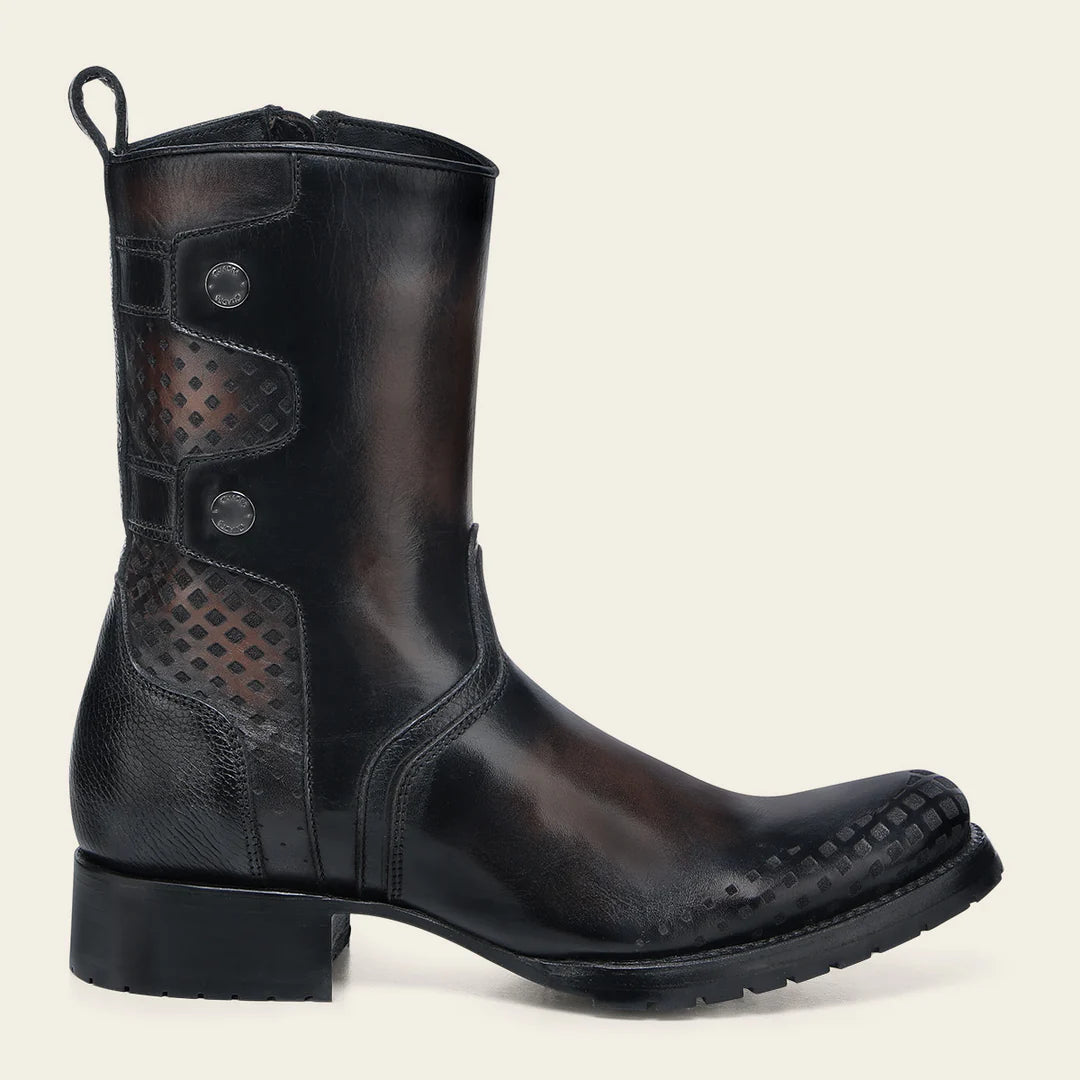 Bota urbana en piel genuina de bovino para caballero. Presenta grabado láser en motivos geométricos, aplicación metálica con el logotipo Cuadra, sombreado a mano. Ajustada con cierre interno. Cuenta con la nueva tecnología: planta Ortholite, que le da mayor ligereza, confort, transpirabilidad y amortiguación. Con suela track antiderrapante.
