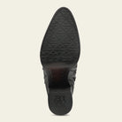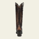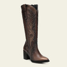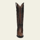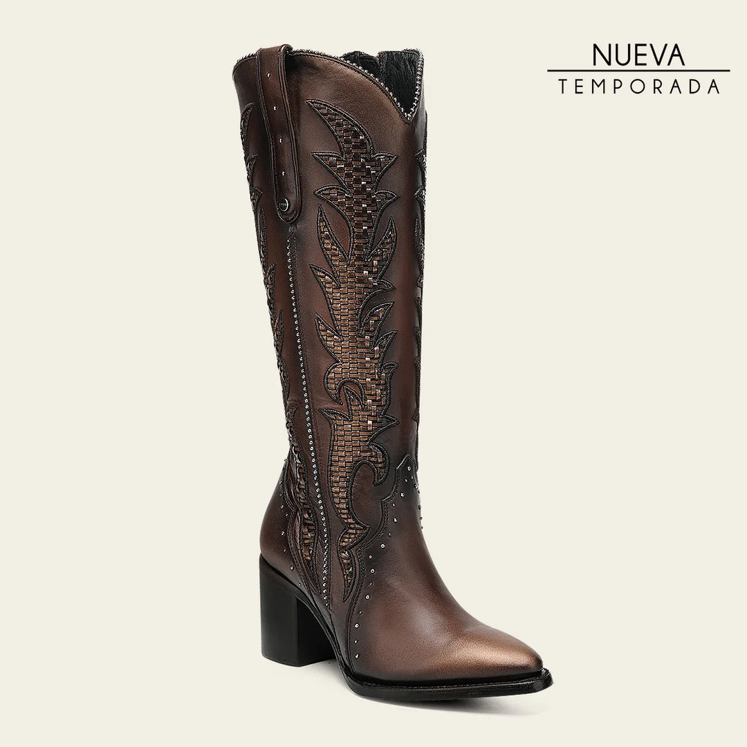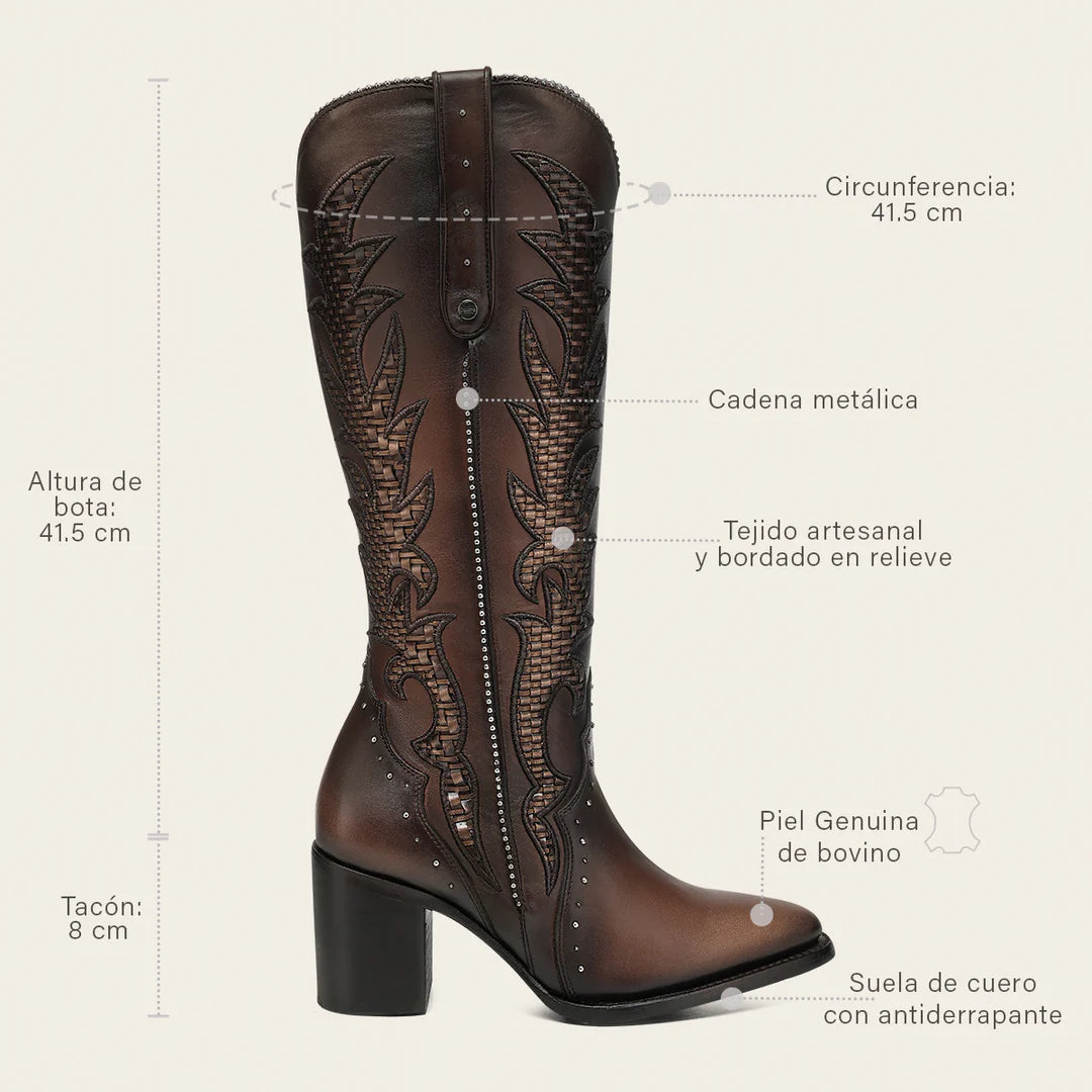 Bota vaquera para dama en piel genuina de bovino. Presenta acabado pintado a mano, finos herrajes metálicos al frente, talón y oreja. Con herraje personalizado con el logotipo de la marca y aplicación de cadena metálica en el costado y borde superior, bordado en relieve y tejido artesanal con inspiración western. Ajustada con cierre interno.
