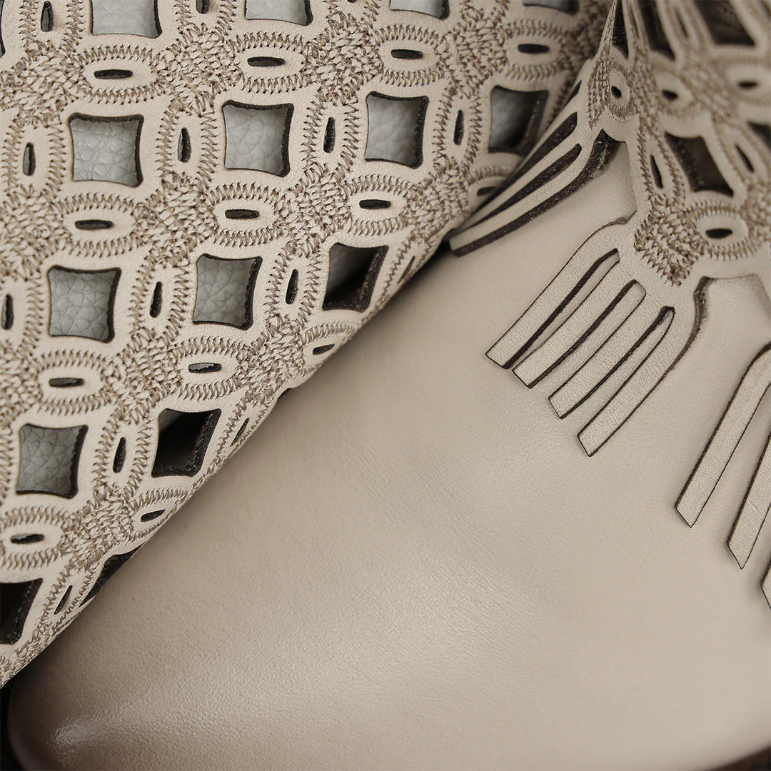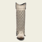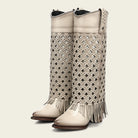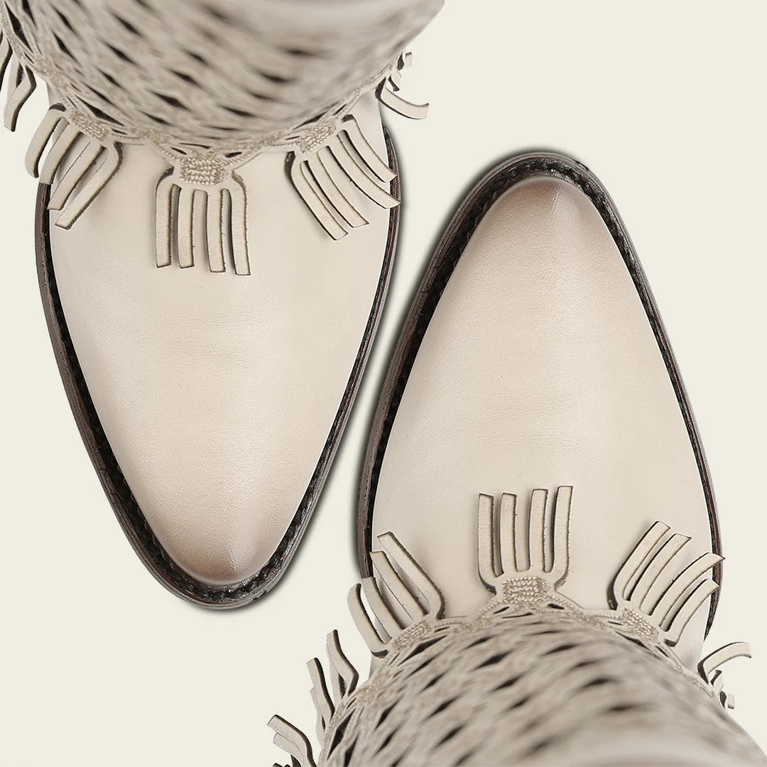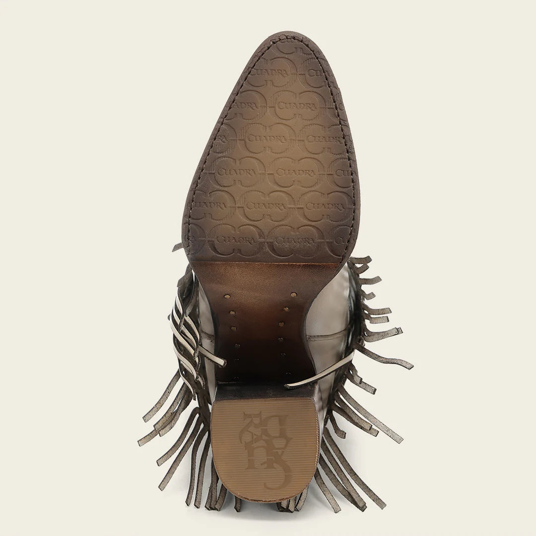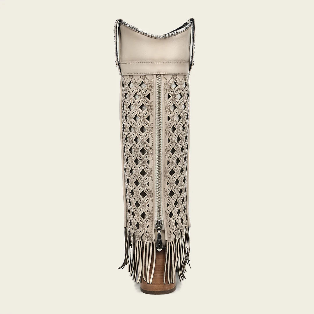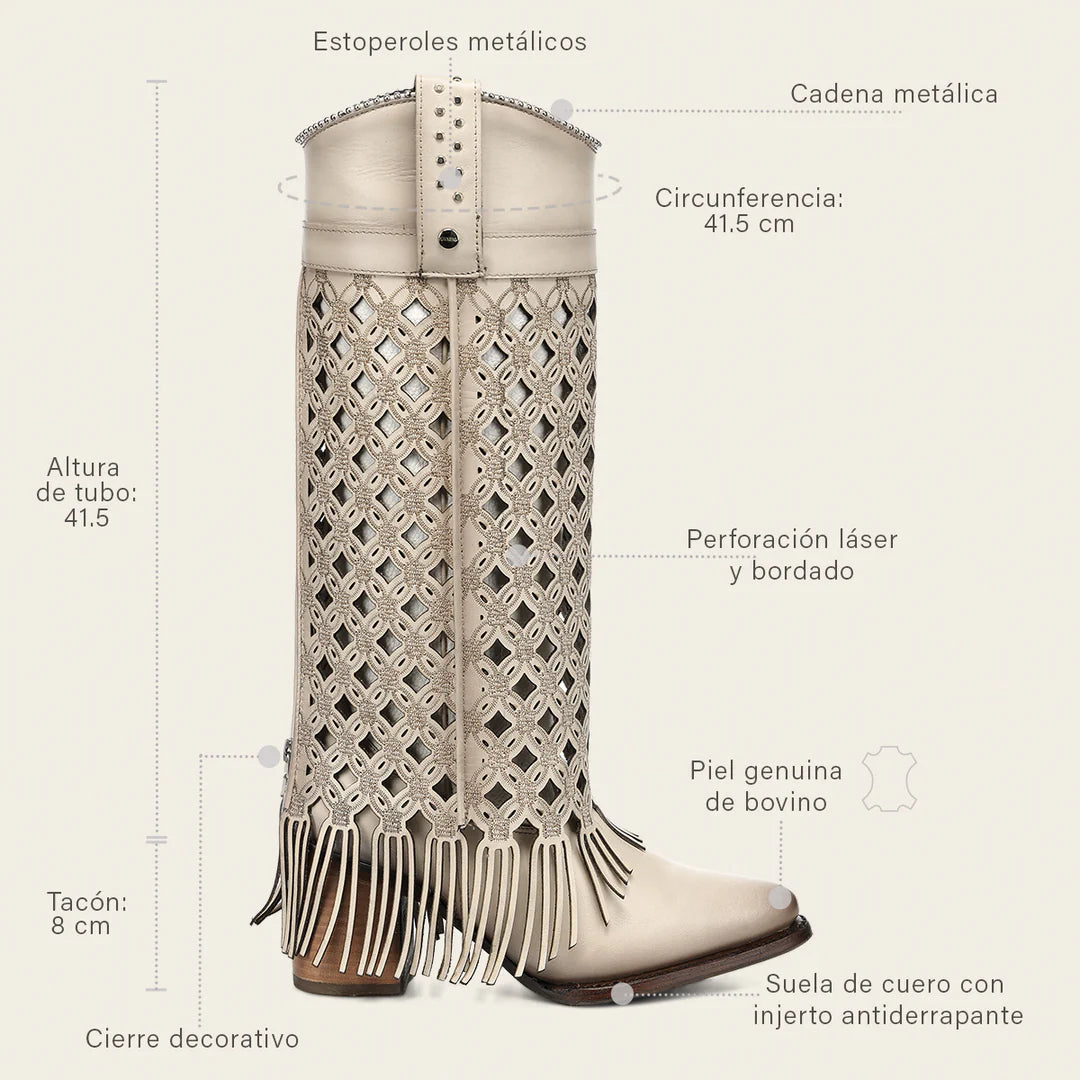 Bota alta casual para dama en piel genuina de bovino. Presenta faldón en piel genuina con bordado en color contrastante y perforado en motivos geométricos, terminado en flecos y sombreado a mano. Con aplicación de estoperoles metálicos, cadena metálica en el borde superior y aplicación metálica con el logotipo de Cuadra. La parte trasera presenta un cierre decorativo. Cuenta con planta Ortholite y plantilla flex removible que brindan mayor ligereza, confort amortiguación y resistencia. Con suela de cuero con injerto de hule.