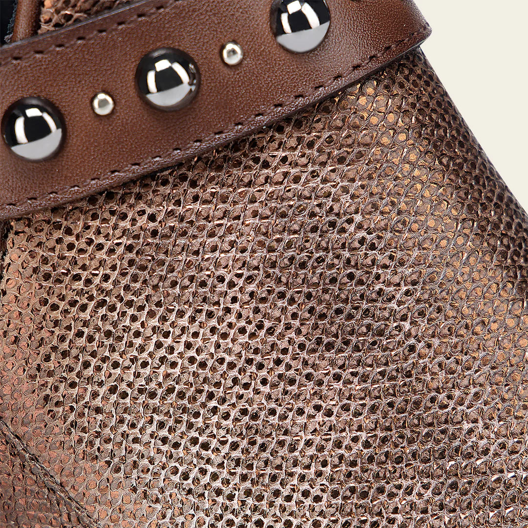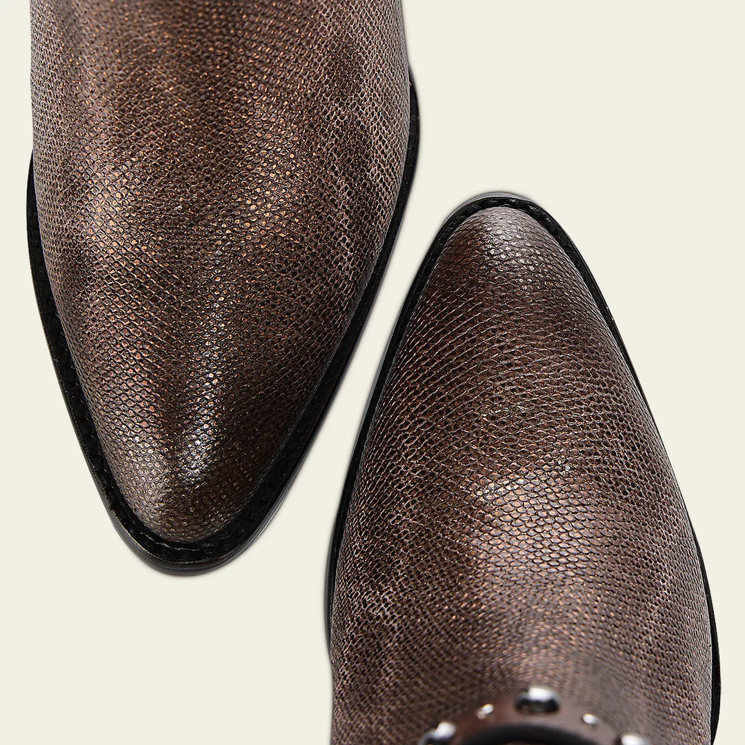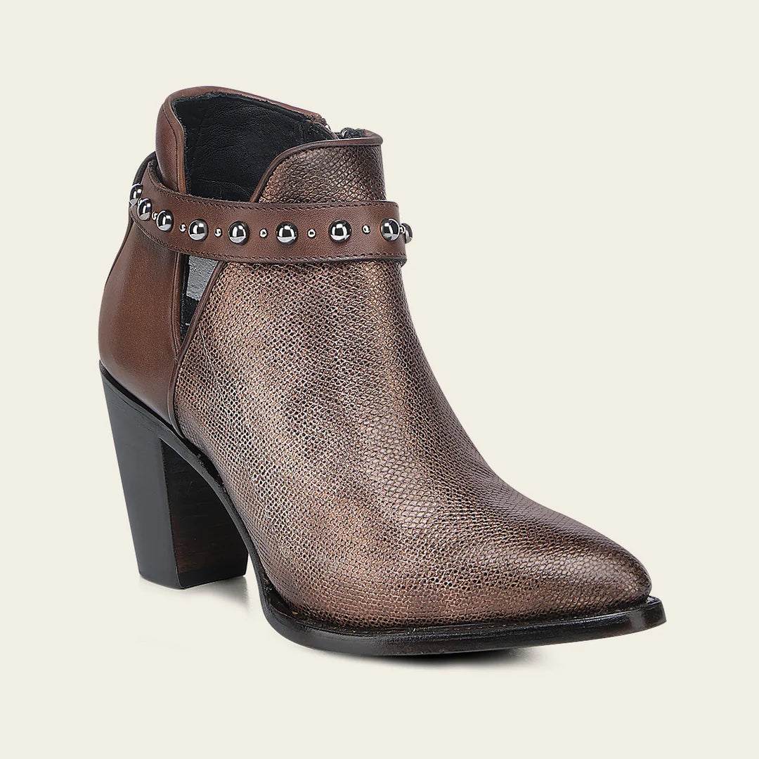 Botín para dama en piel genuina de carunga y piel de bovino. Presenta apertura lateral de corte en V. Correa decorativa alrededor del tobillo con estoperoles. Ajustado con cierre interno. Cuenta con las nuevas tecnologías: planta Ortholite, horma mejorada para brindar un mayor confort y plantilla flex removible. Con suela con injerto de TPU.