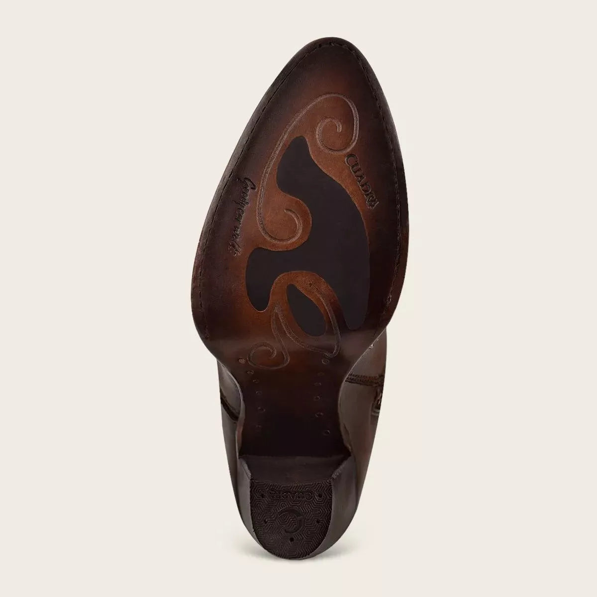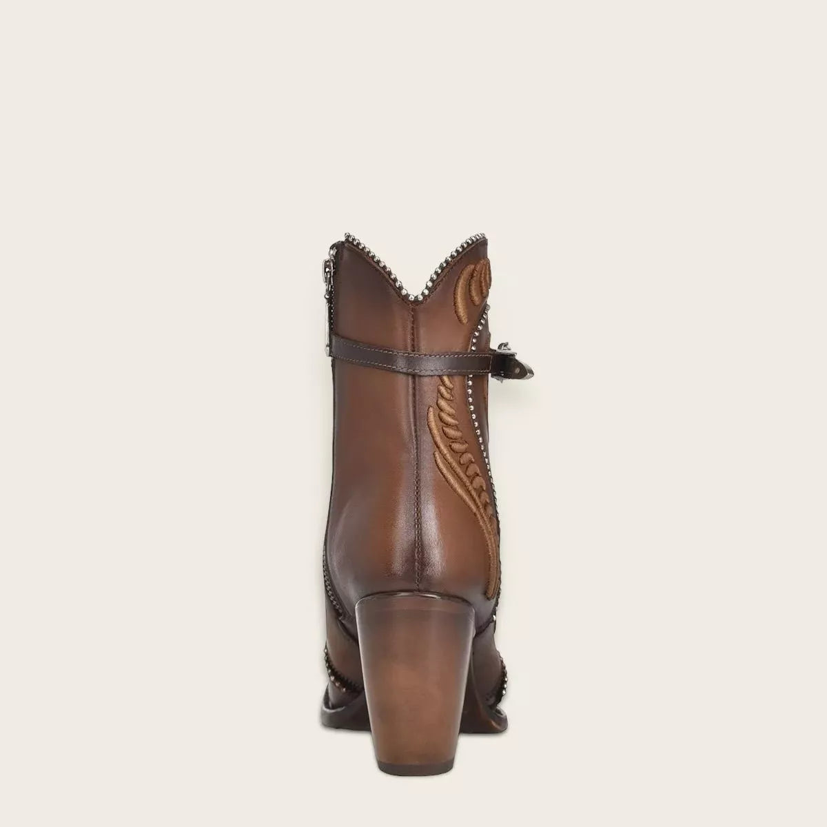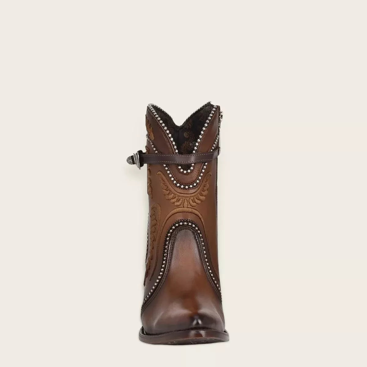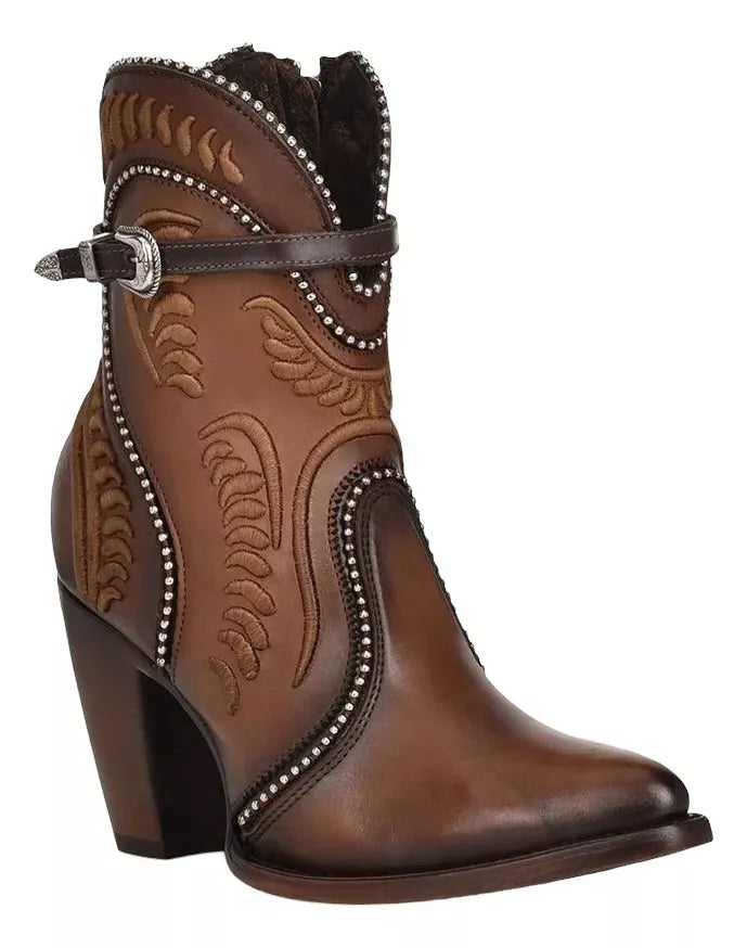 Botín para dama en piel genuina de bovino. Con detalles bordados en motivos orgánicos, aplicaciones metálicas y acabado pintado a mano. Presenta una correa de piel alrededor del tobillo ajustada con fina hebilla metálica con inspiración western. Ajustado con cierre interno.