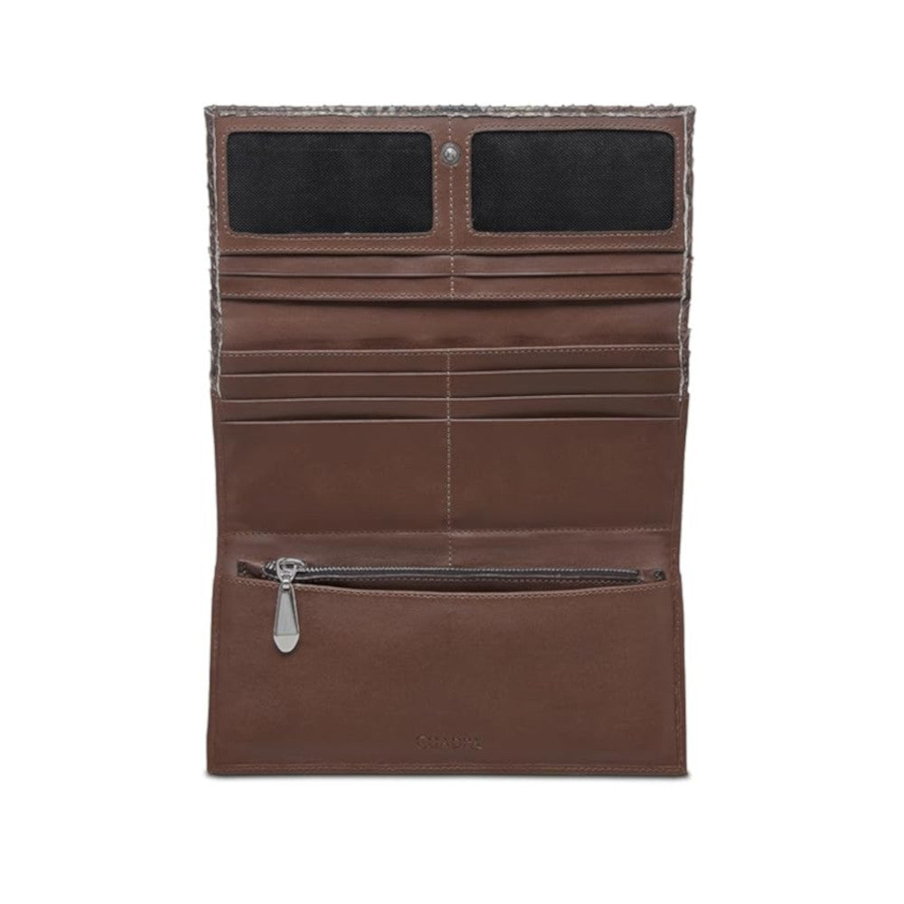 Su diseño práctico incluye múltiples compartimentos, ideales para organizar tarjetas, billetes y monedas, asegurando que todo esté al alcance de la mano. La tonalidad oro miel añade un matiz cálido y versátil, que combina fácilmente con diferentes estilos y ocasiones.