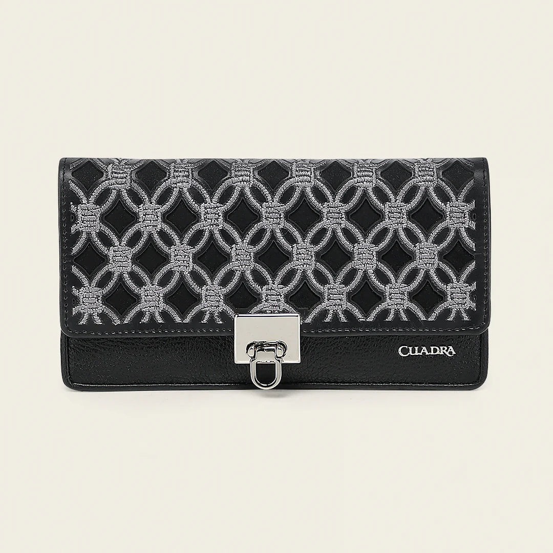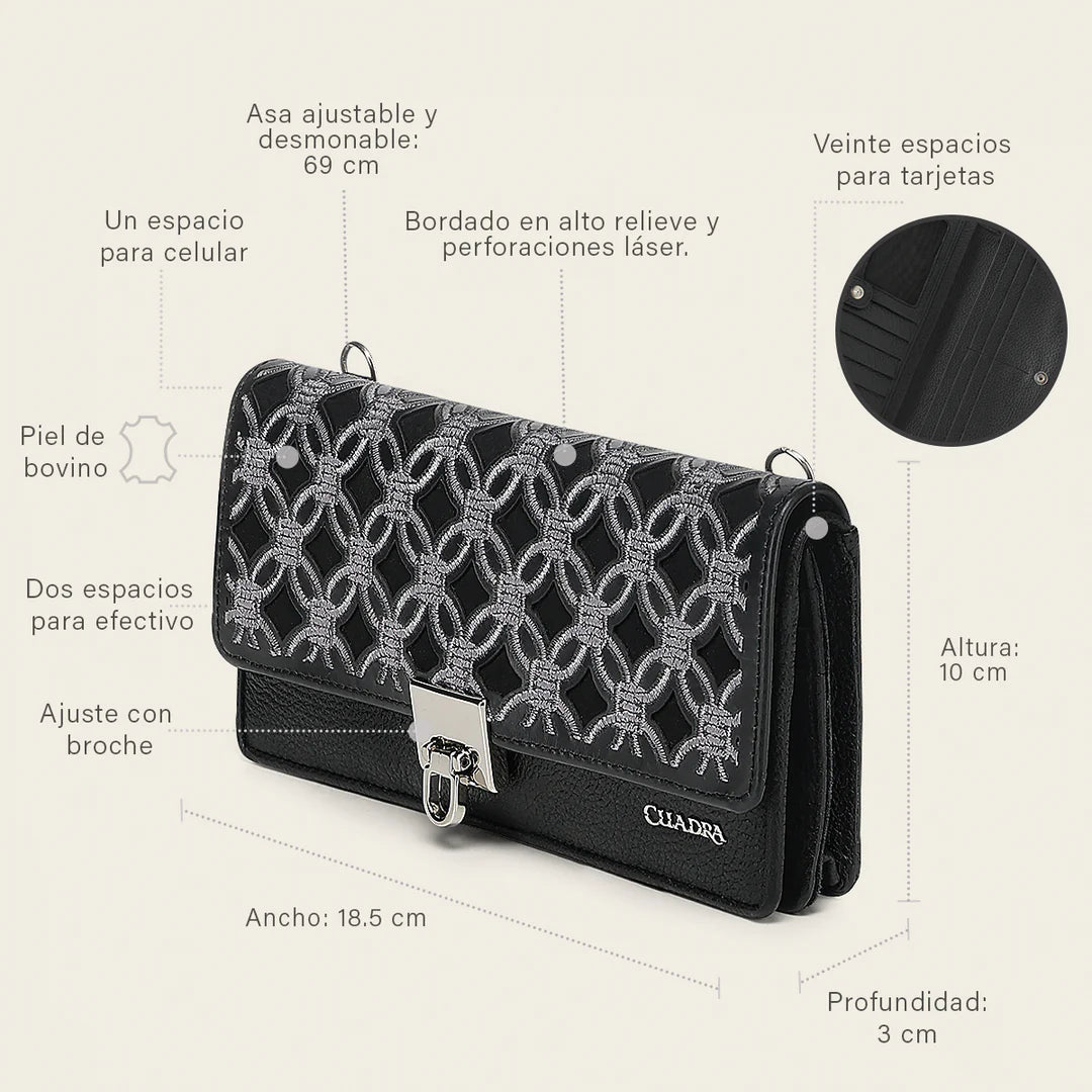 Cartera para dama en piel genuina de bovino. Al frente presenta aplicación metálica del logotipo, bordado en alto relieve en color contrastante y perforaciones láser en motivos geométricos, sobre fondo en contraste de textura. En su interior cuenta con dieciocho espacios para tarjetas y cinco espacios para efectivo. Asegurada con broche.