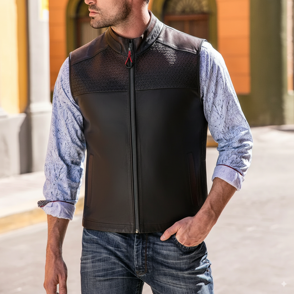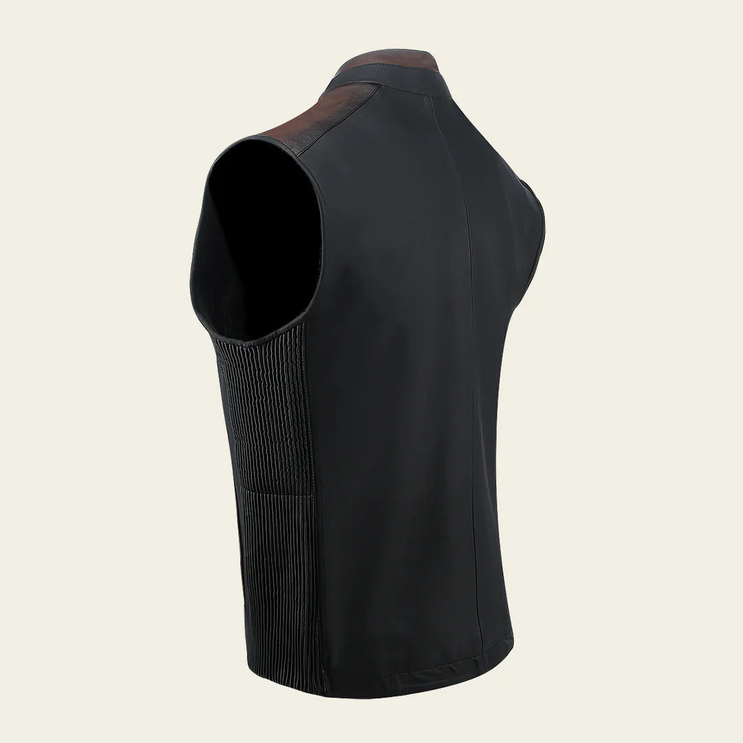 Chaleco para caballero en piel genuina de ovino. Con bordado capitonado y aplicaciones textiles en los hombros, espalda y costados. Cuenta con dos bolsillos laterales y dos bolsillos internos. Ajustado con cierre frontal.