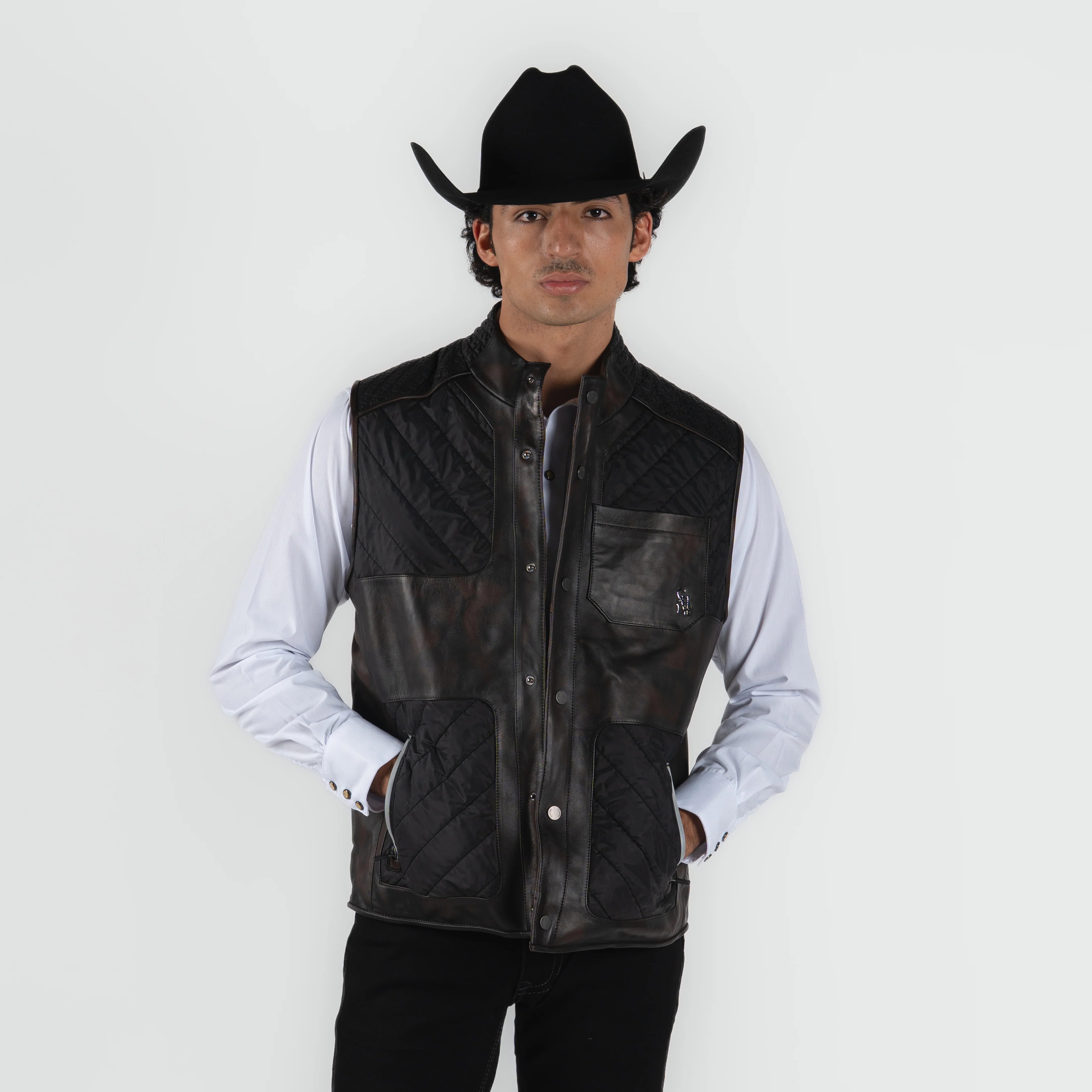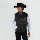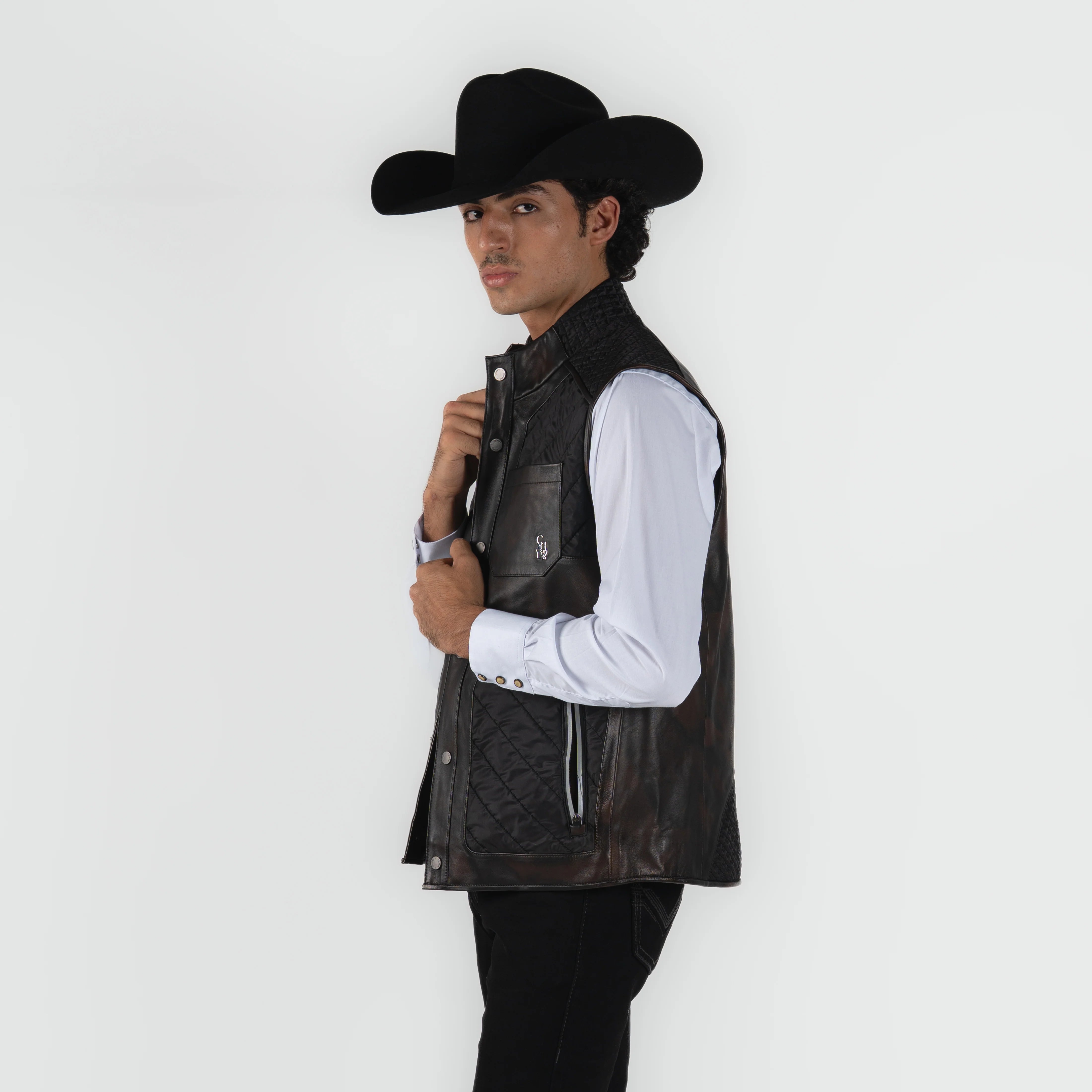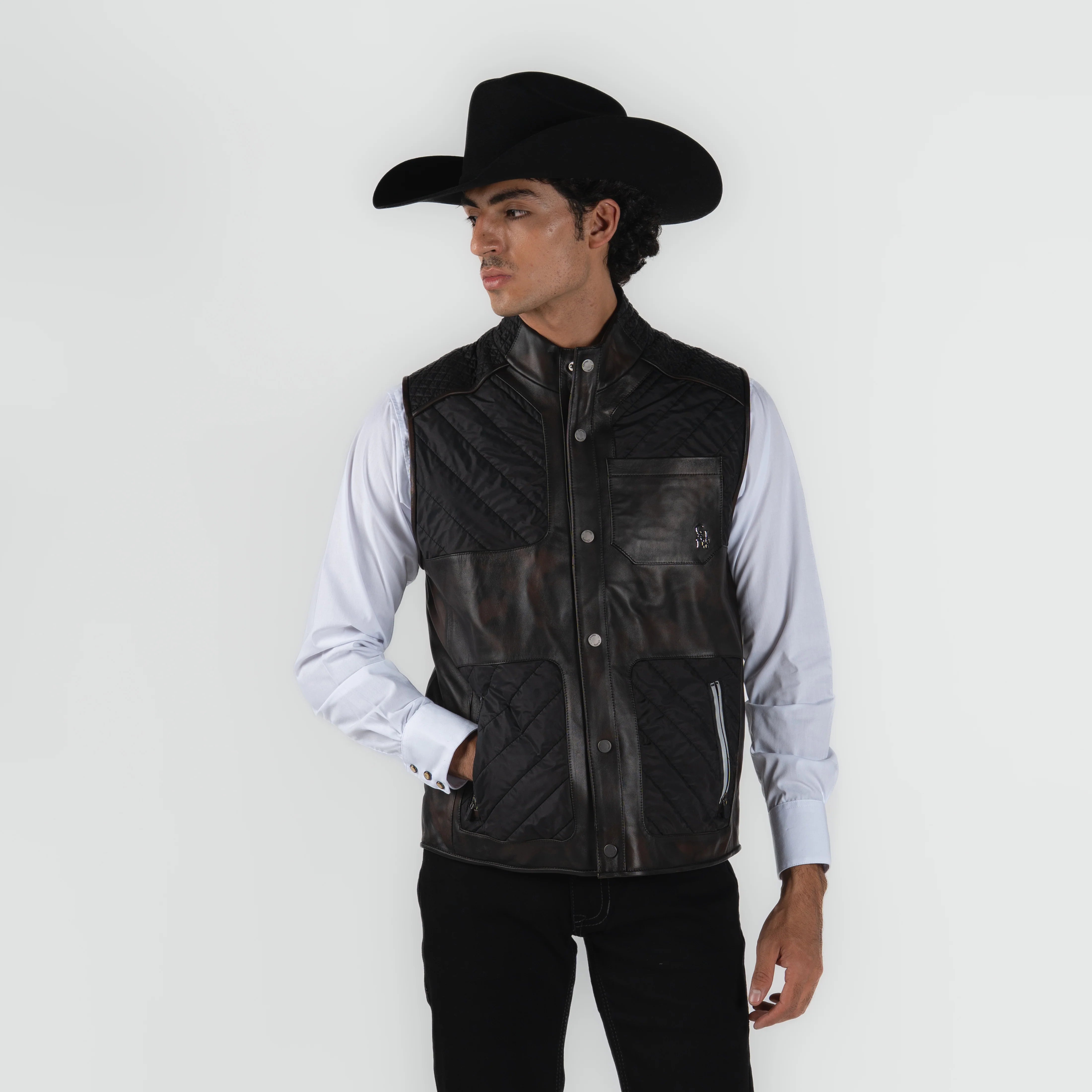 Chaleco de caballero confeccionado en cordero premium de la marca Cuadra, reconocida por su excelencia en prendas vaqueras. Este diseño elegante en tonalidad chocolate café presenta un patrón camuflaje sutil que combina sofisticación con versatilidad. La piel de cordero proporciona calidez excepcional sin sacrificar la comodidad, ideal para complementar tu guardarropa vaquero en cualquier ocasión. Corte impecable y acabados de calidad superior que reflejan la tradición artesanal de Cuadra.