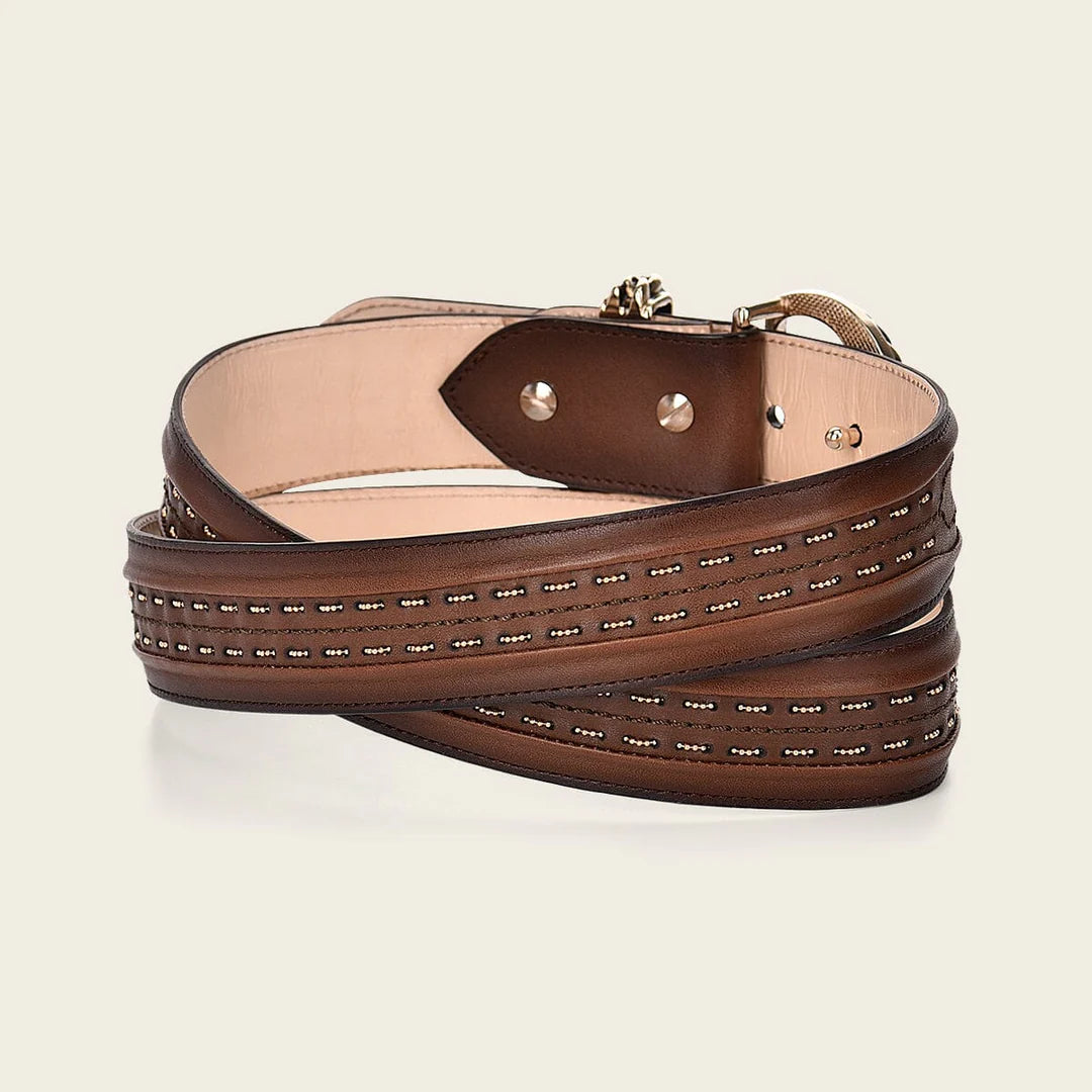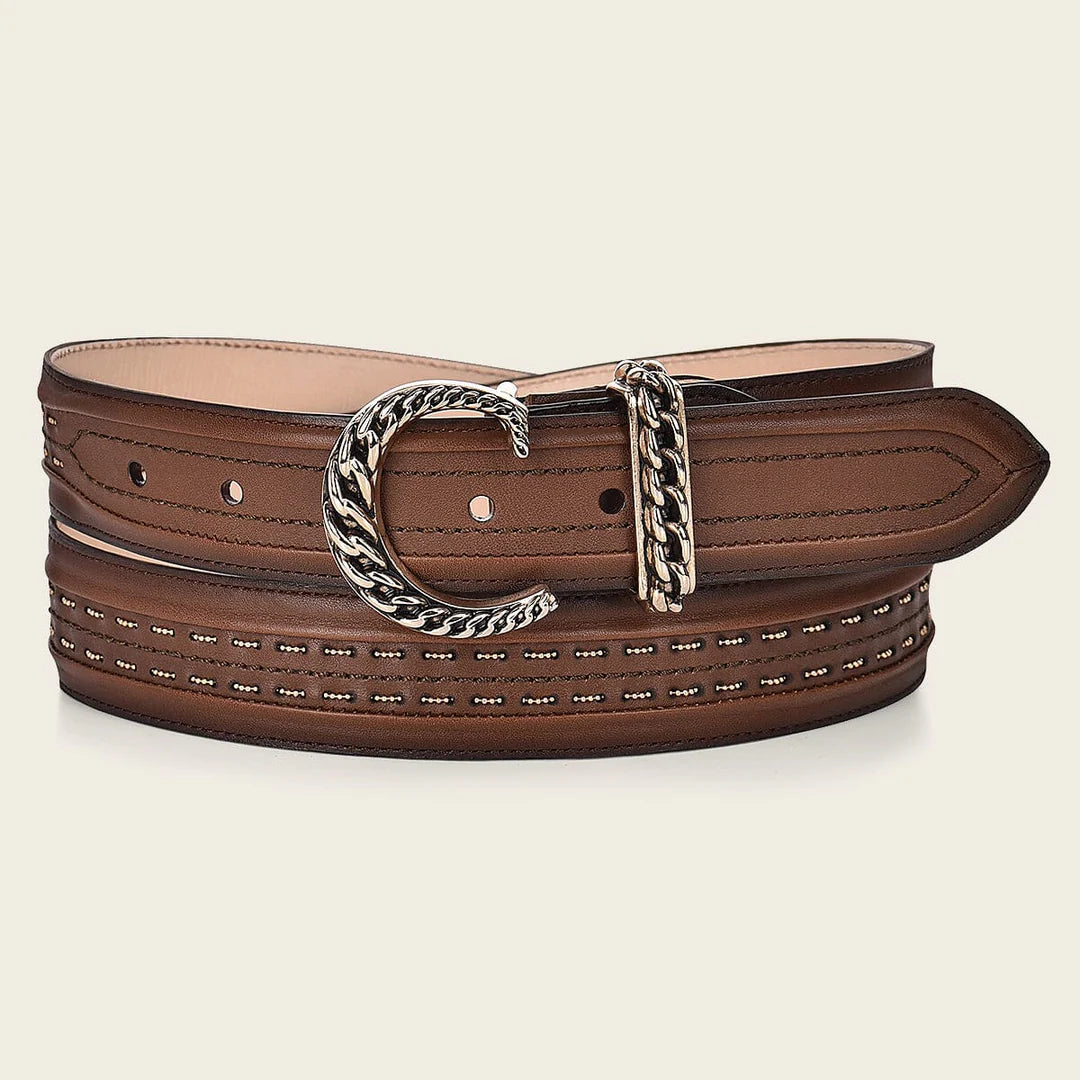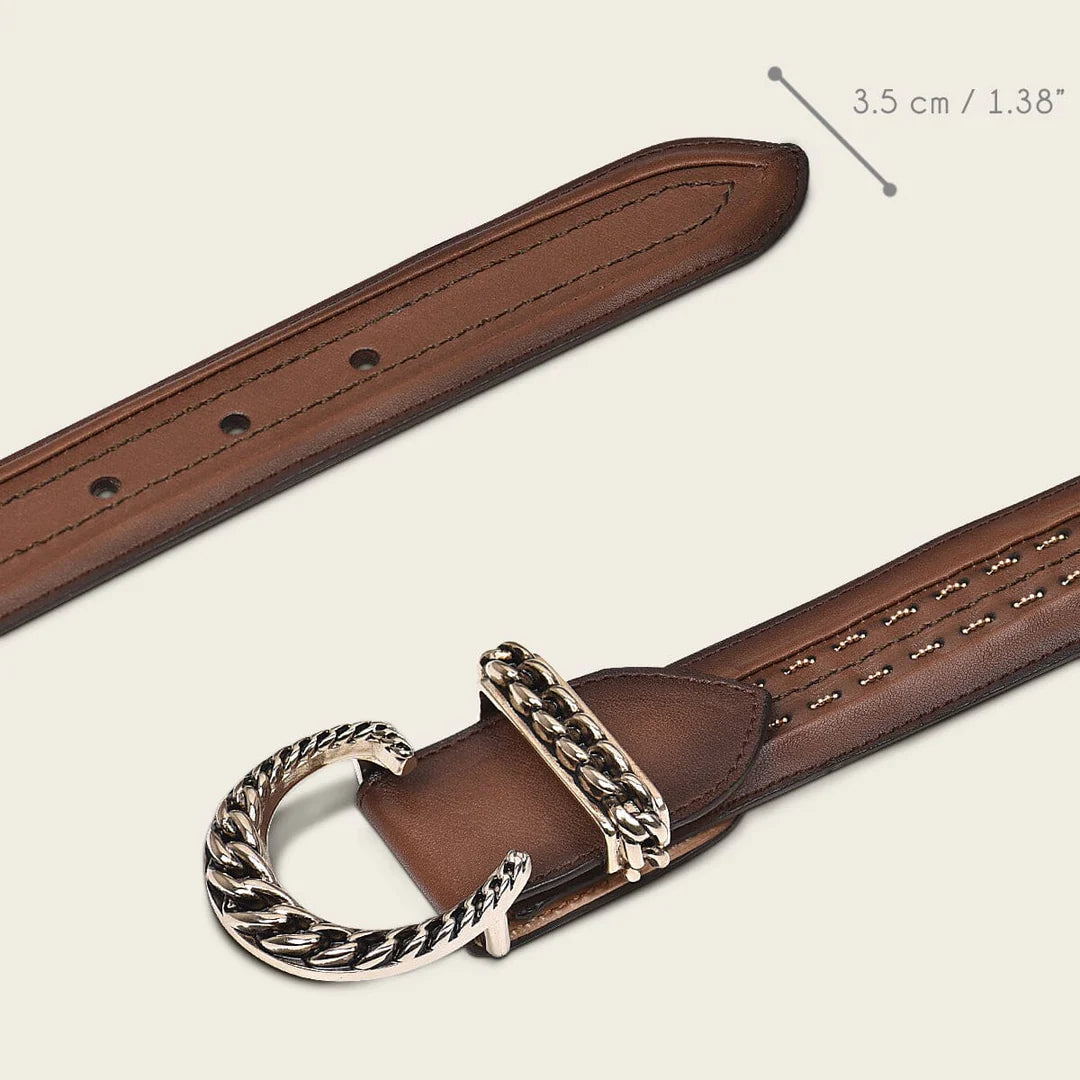 Cinturón casual para dama en piel de bovino. Presenta fina cadena tejida a lo largo de la tira. Con hebilla metálica de 35 mm de monograma Cuadra. Forro en piel de bovino. Las marcas y cicatrices que puede presentar lejos de ser considerados como defecto demuestran la autenticidad de cada producto.