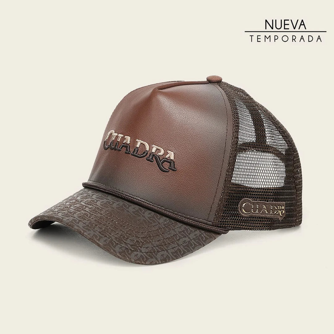 Gorra snapback con piel genuina de bovino y textil. Al frente presenta logotipo Cuadra en alto relieve sobre piel genuina con acabado pintado a mano. Con grabado del monograma Cuadra en visera.