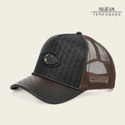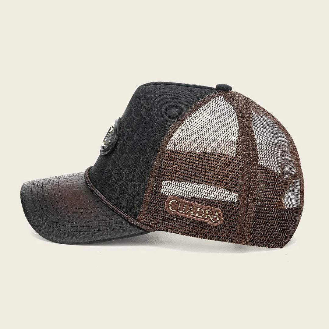 Gorra snapback en piel genuina de bovino y textil, al frente presenta grabado del monograma Cuadra, aplicación del monograma sobre piel genuina en relieve y acabado pintado a mano. Con aplicación del logotipo al costado. Ajuste posterior mediante broche tipo snapback.