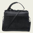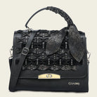 Bolso de mano para dama en piel genuina de bovino. Al frente presenta aplicación metálica del logotipo Cuadra, entretejido artesanal con contraste de color y aplicación de cristales auténticos swarovski. Con asa larga ajustable y desmontable y asa corta envuelta con una mascada de piel de ovino perforada que finaliza en un moño. Cuenta con un compartimento en la parte trasera y con dos compartimentos en el interior uno de ellos asegurado con cierre. Asegurada con broche metálico e imanes.