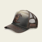 Gorra snapback con piel genuina de bovino y textil. Al frente presenta figura de venado y monograma Cuadra en alto relieve y contraste de color sobre piel genuina con acabado pintado a mano. Con grabado del monograma Cuadra en visera.