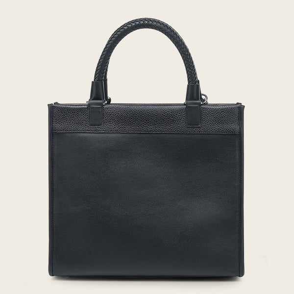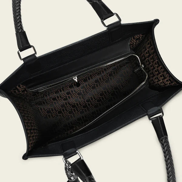 Equipado con un bolsillo interno con cierre, este modelo asegura que tus pertenencias estén organizadas y seguras. El cierre principal también garantiza la protección de tus objetos personales, haciendo de esta bolsa una opción práctica y segura. Las asas en color negro complementan su diseño, ofreciendo comodidad y un agarre firme.