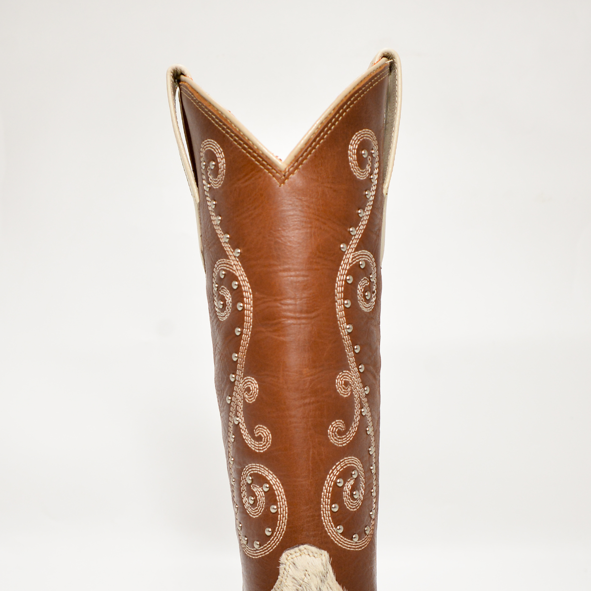 Un diseño que combina la elegancia de la piel natural con el carácter genuino del estilo western. Esta bota vaquera de mujer destaca por su base en pelo natural moteado, que aporta un acabado único —ningún par es igual a otro—, complementado con un tubo de piel café adornado con bordado floral y aplicaciones metálicas cuidadosamente distribuidas.