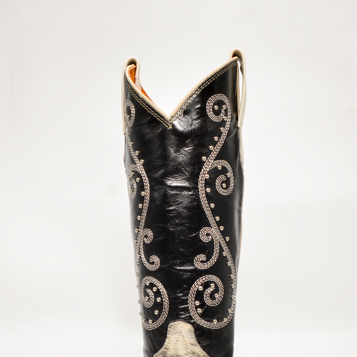 Inspirada en el estilo western moderno, esta bota vaquera de mujer combina la elegancia del negro con la autenticidad del pelo natural. Su diseño destaca por el contraste entre la base moteada y el tubo de piel negra, decorado con bordado de hilos claros y aplicaciones metálicas que forman un patrón elegante y femenino.