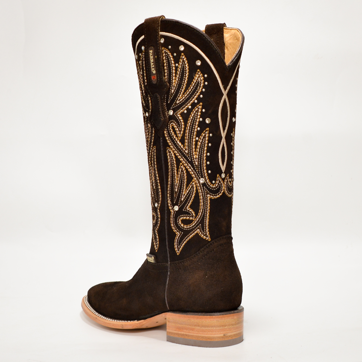 Un diseño que combina la suavidad de la gamuza con el brillo de los bordados artesanales. Esta bota Parral en tono chocolate oscuro resalta por su textura elegante y su confección 100% mexicana, ideal para la mujer que busca destacar con estilo y autenticidad en cada paso.