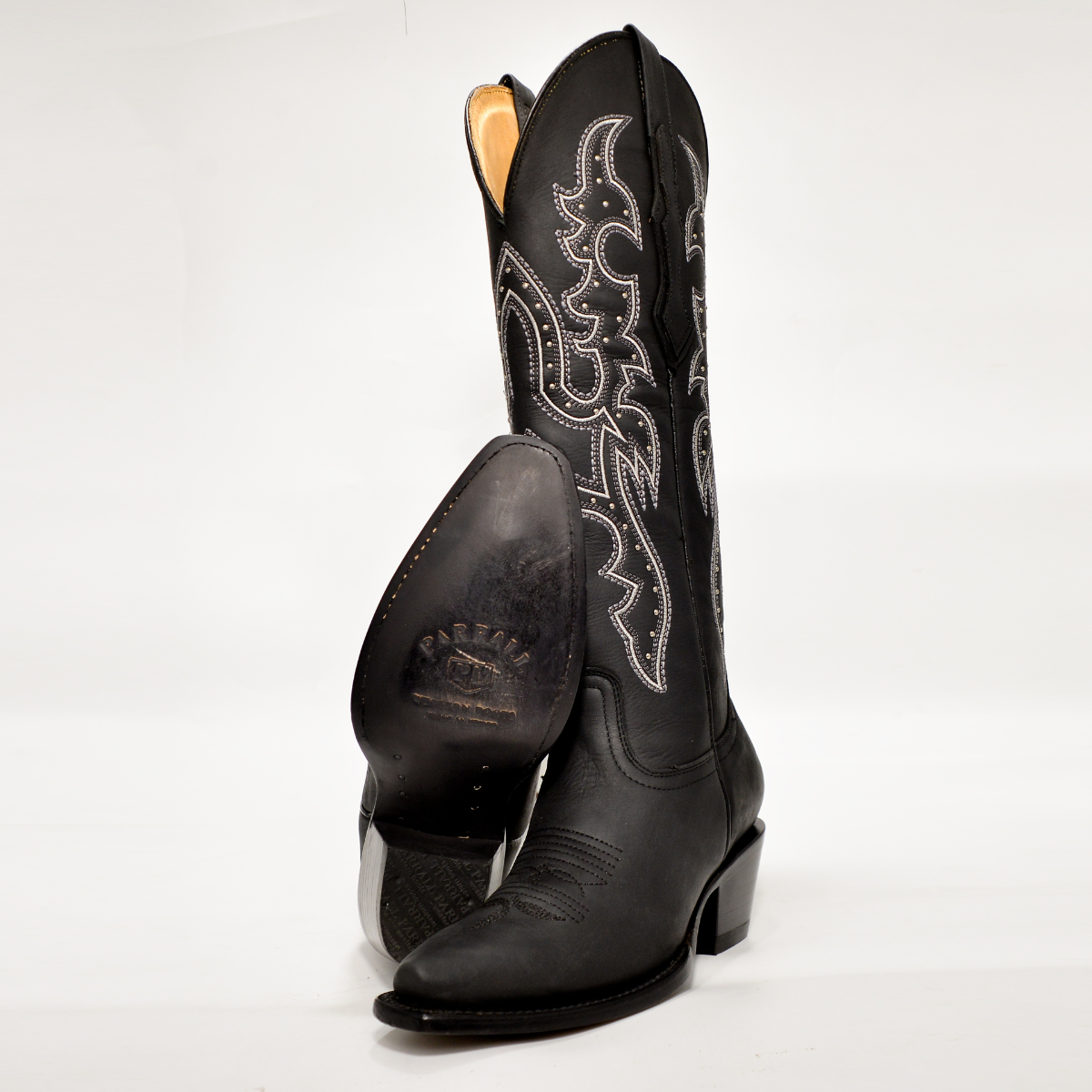 El contraste entre los acabados mates y el brillo sutil del bordado le da un toque sofisticado que se adapta tanto a eventos formales como a un look ranchero de impacto. La suela de cuero grabada y el tacón vaquero tradicional garantizan durabilidad, comodidad y estilo en cada paso.