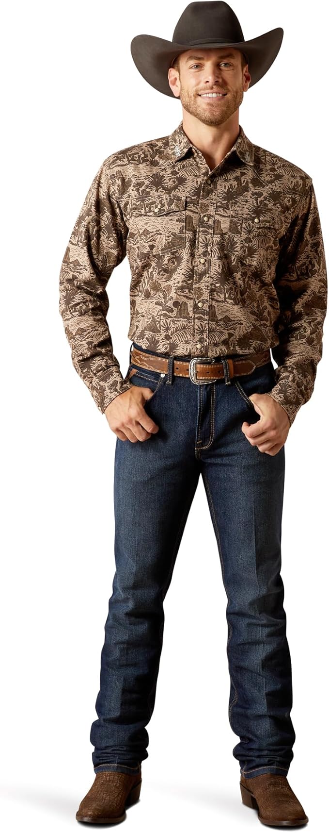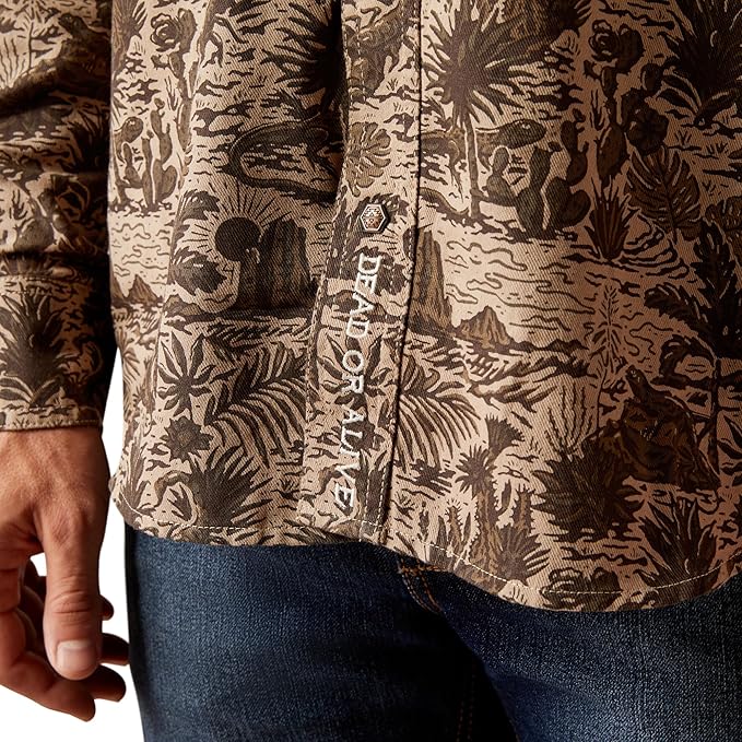 Su diseño estampado tipo western con paisajes naturales la hace ideal para quienes buscan vestir con estilo vaquero moderno y original.