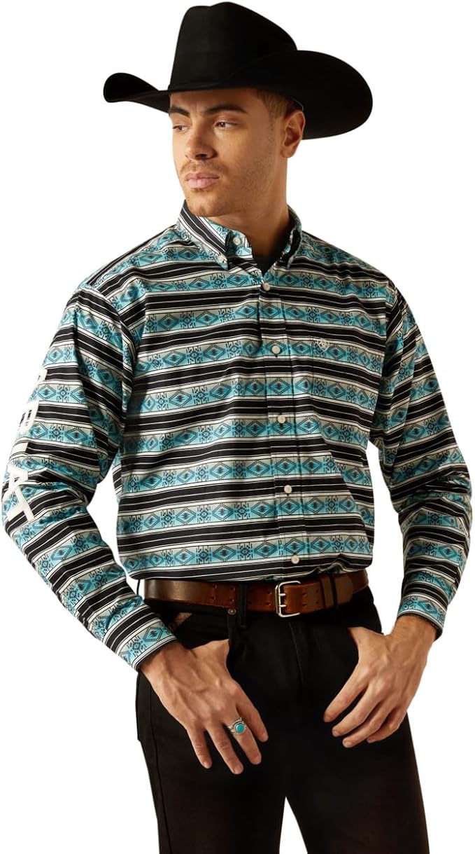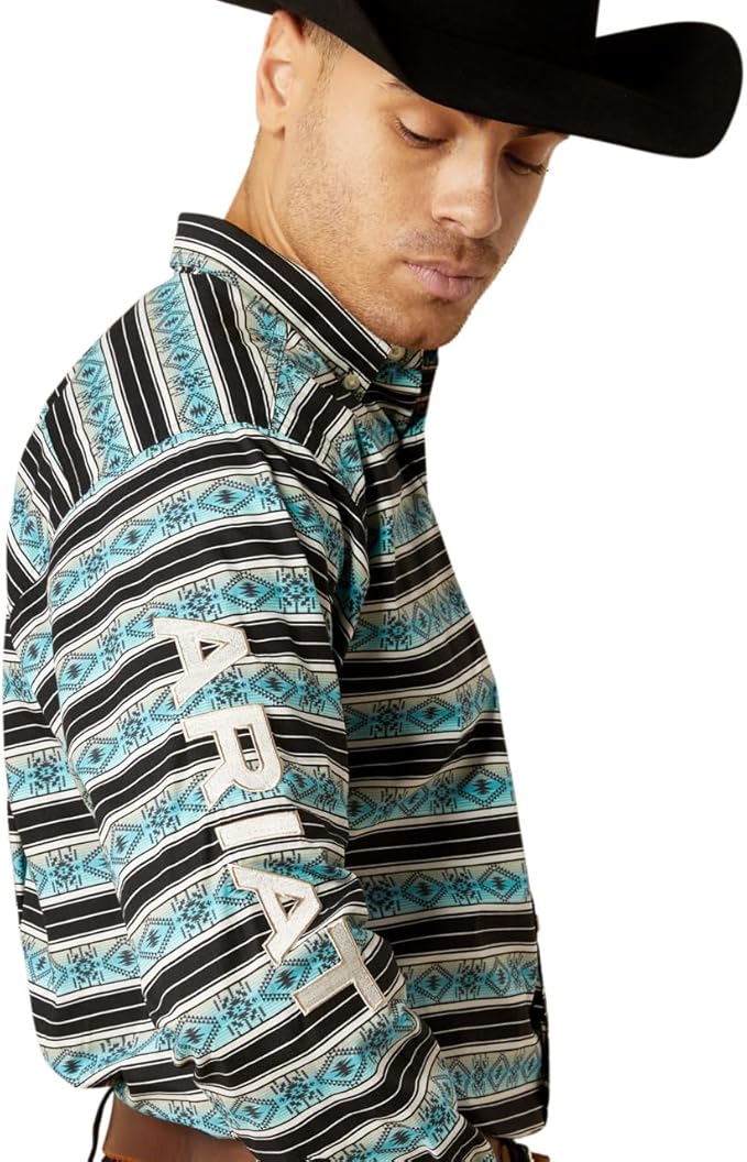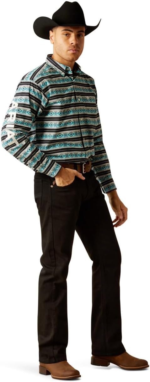 Camisa vaquera original Ariat con un diseño llamativo inspirado en motivos tribales. Su combinación de franjas en negro, blanco y azul turquesa la convierte en una prenda moderna y distintiva. Incluye el logo Ariat bordado en grande sobre la manga, lo que le da un estilo auténtico y original.