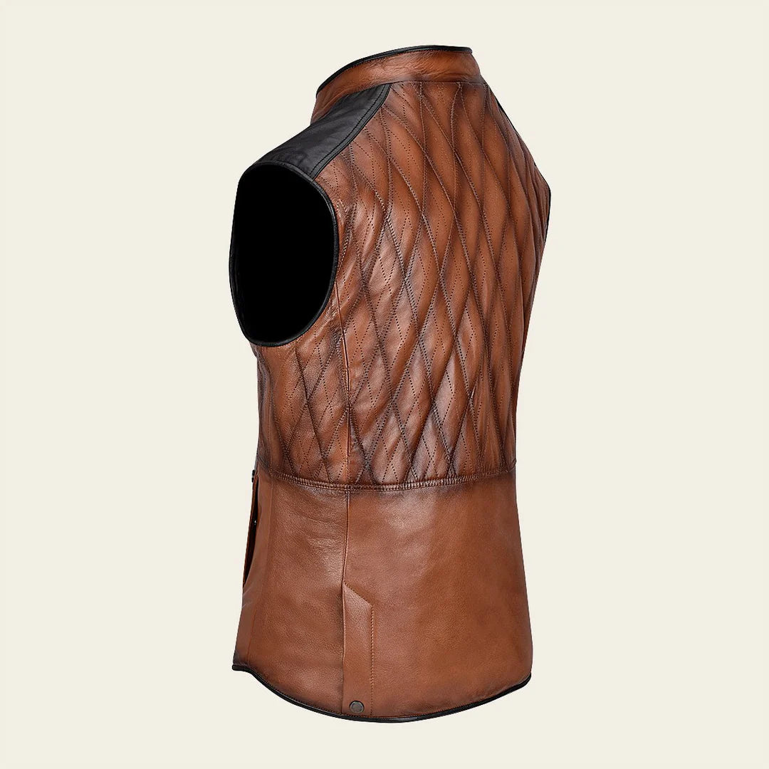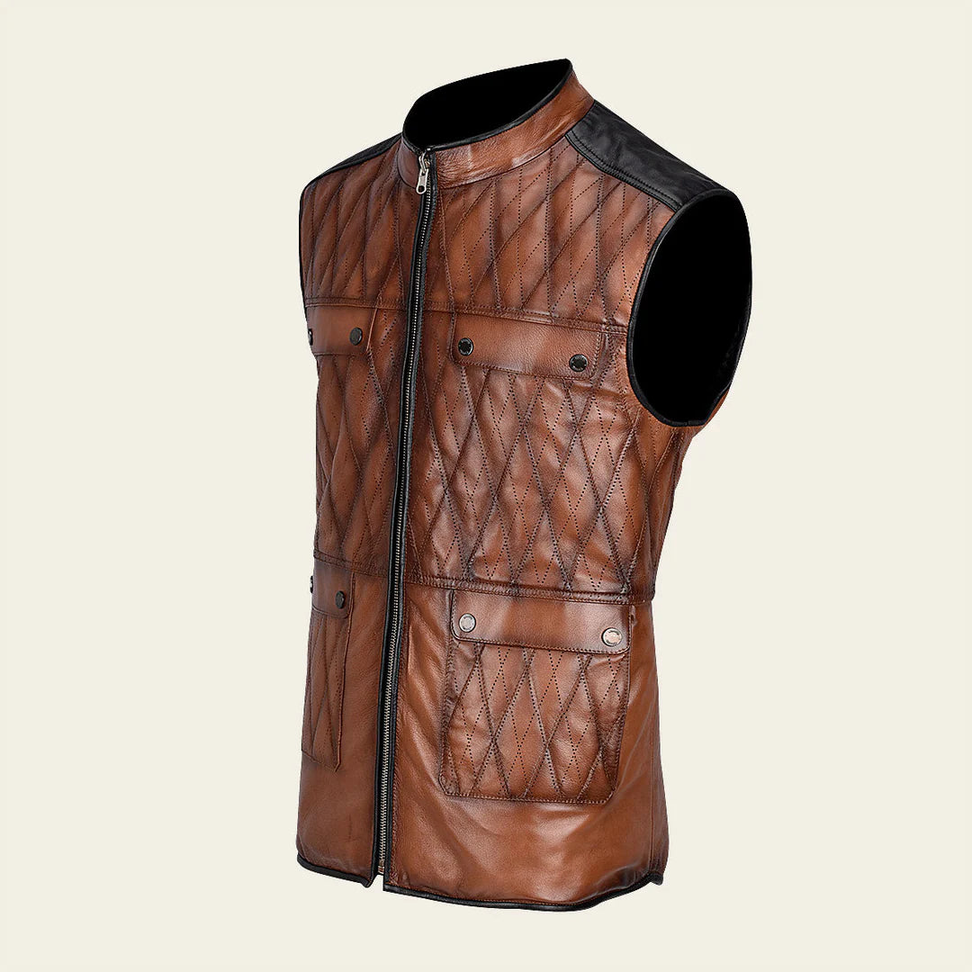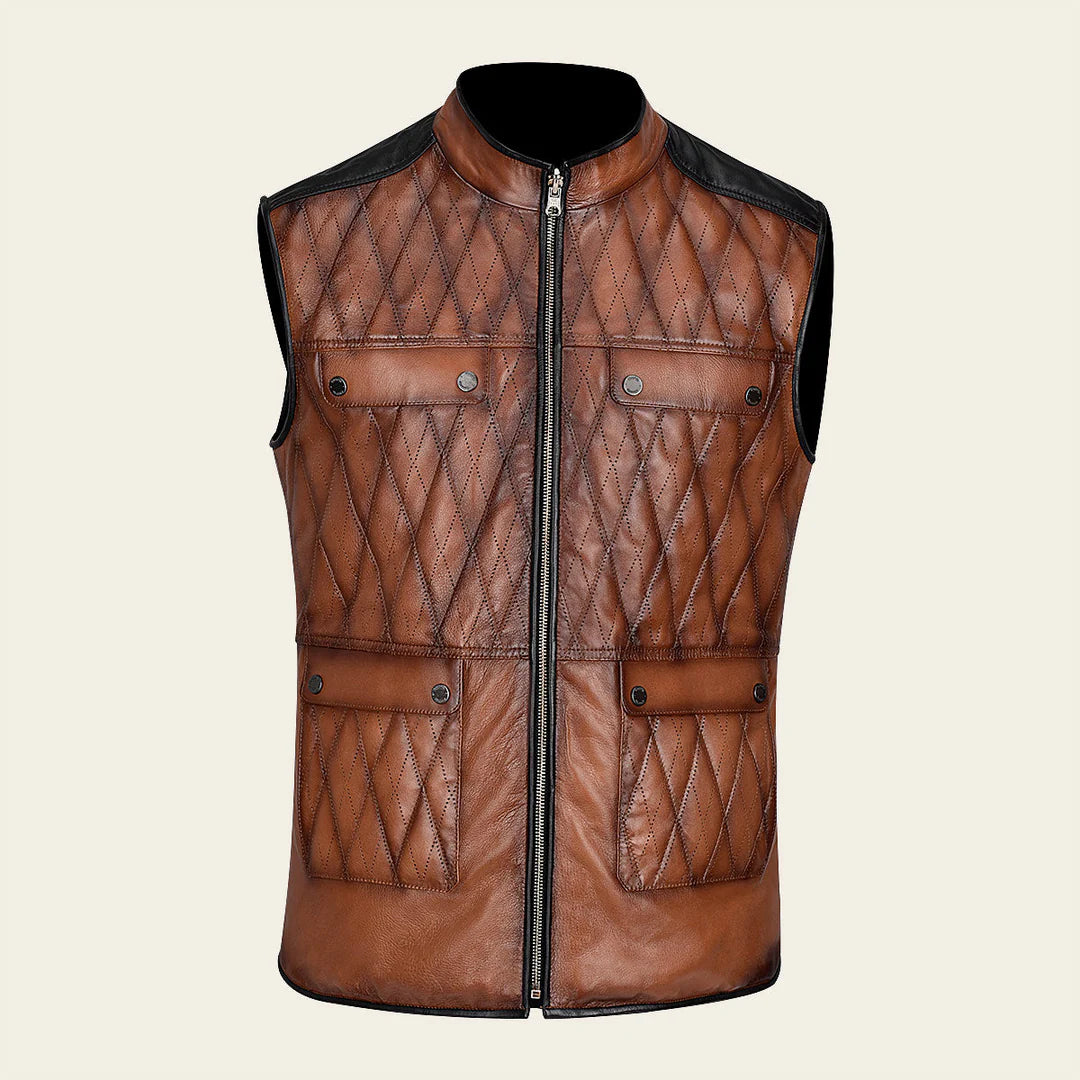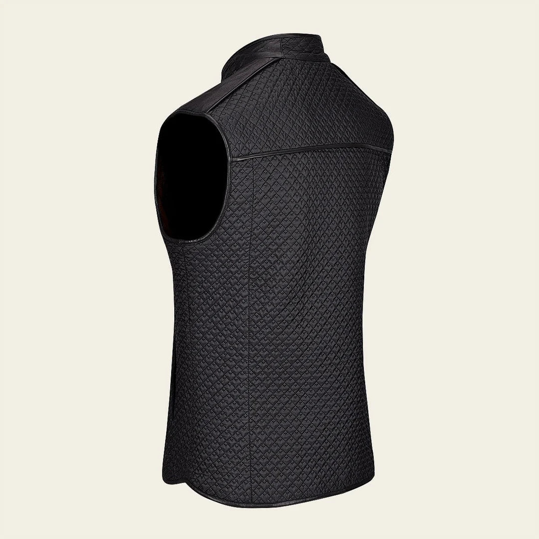 Chaleco doble vista para caballero en piel de ovino. En la vista principal presenta bordado capitonado con bolsillos decorativos al frente y dos bolsillos laterales. En la segunda vista con textil capitonado con bolsillos laterales asegurados con broches de presión. Ajustado con cierre frontal.